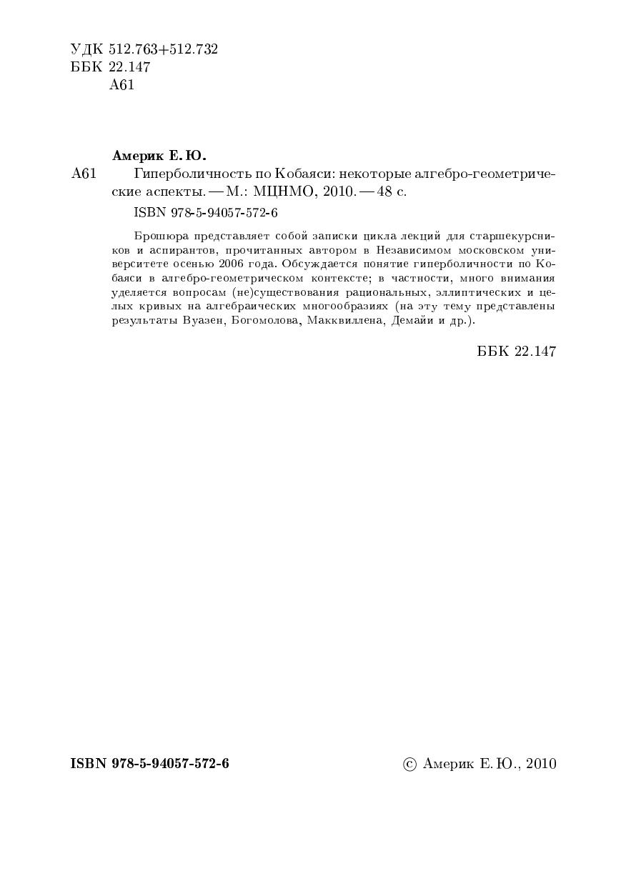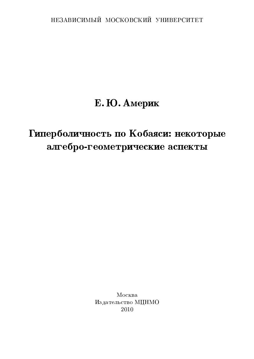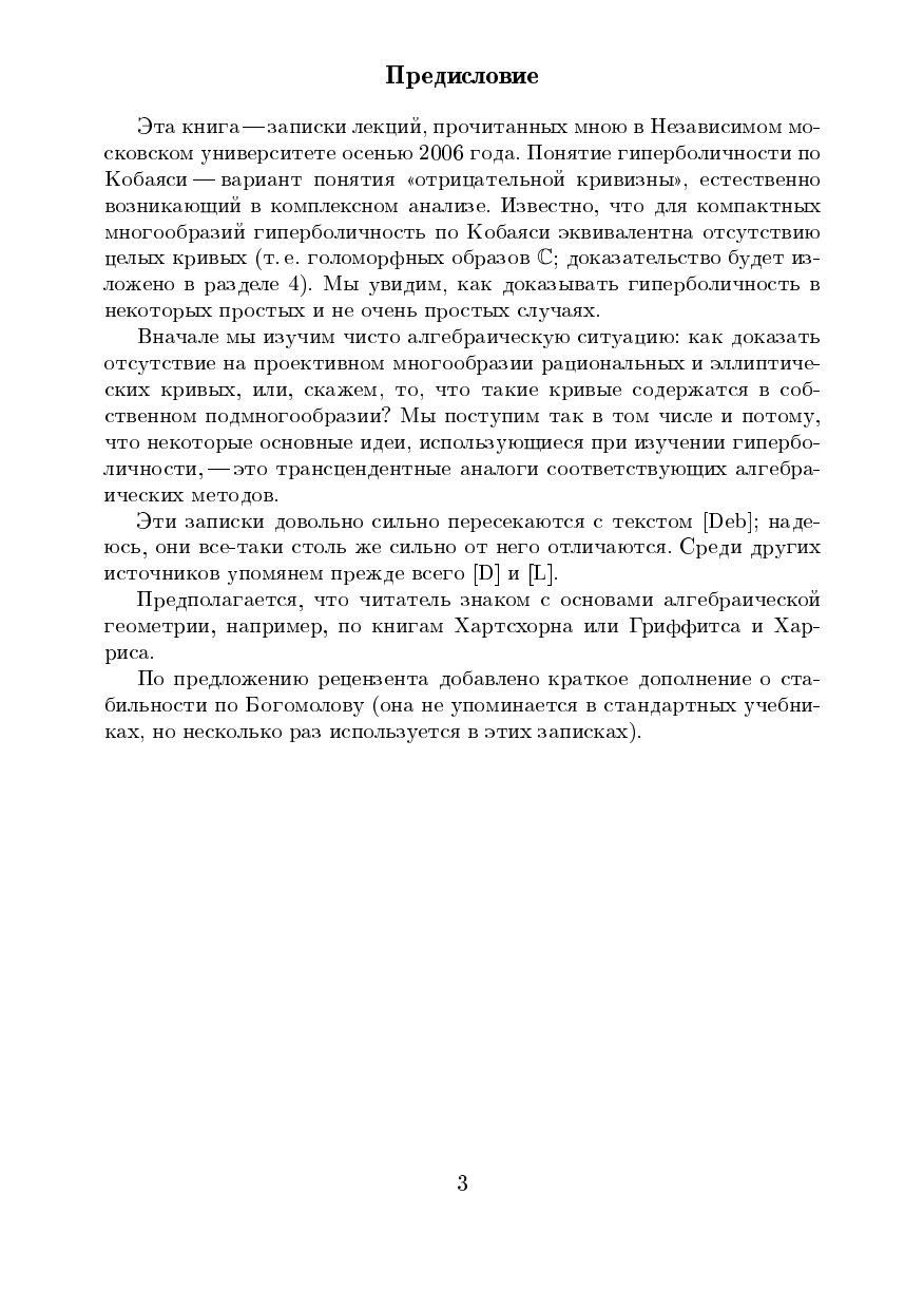 Брошюра представляет собой записки цикла лекций для старшекурсников и аспирантов, прочитанных автором в Независимом московском университете осенью 2006 года. Обсуждается понятие гиперболичности по Кобаяси в алгебро-геометрическом контексте в частности, много внимания уделяется вопросам (не)существования рациональных, эллиптических и целых кривых на алгебраических многообразиях (на эту тему представлены результаты Вуазен, Богомолова, Макквиллена, Демайи и др.).