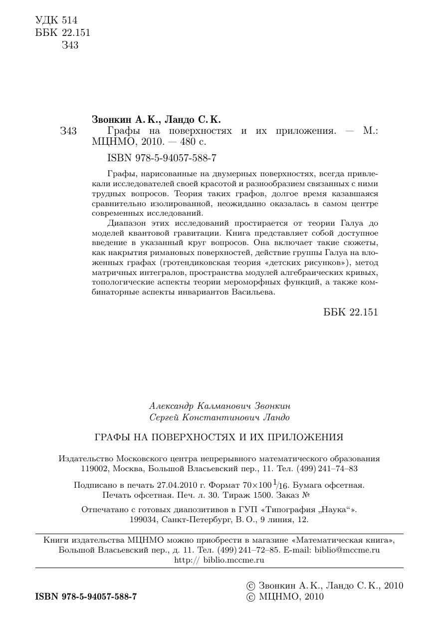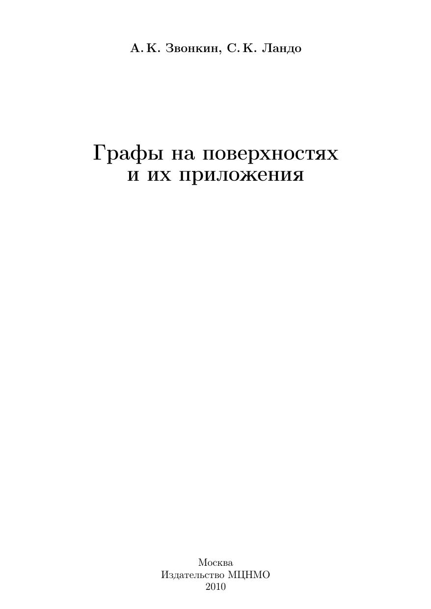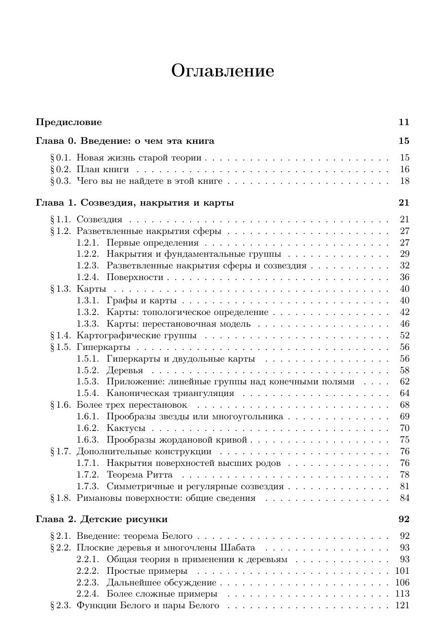 Графы, нарисованные на двумерных поверхностях, всегда привлекали исследователей своей красотой и разнообразием связанных с ними трудных вопросов. Теория таких графов, долгое время казавшаяся сравнительно изолированной, неожиданно оказалась в самом центре современных исследований. Диапазон этих исследований простирается от теории Галуа до моделей квантовой гравитации. Книга представляет собой доступное введение в указанный круг вопросов. Она включает такие сюжеты, как накрытия римановых поверхностей, действие группы Галуа на вложенных графах (гротендиковская теория «детских рисунков»), метод матричных интегралов, пространства модулей алгебраических кривых, топологические аспекты теории мероморфных функций, а также комбинаторные аспекты инвариантов Васильева.