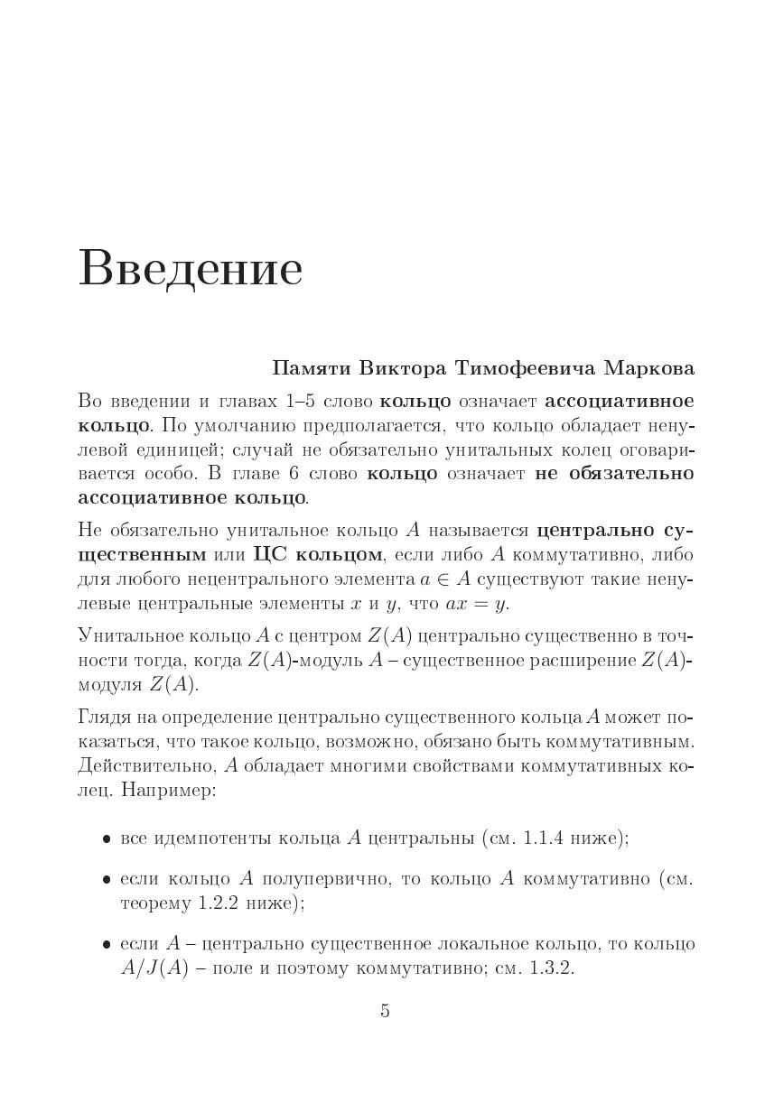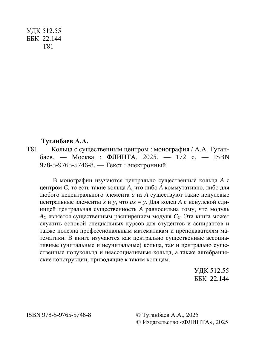 В монографии изучаются центрально существенные кольца A с центром C, то есть такие кольца A, что либо A коммутативно, либо для любого нецентрального элемента a из A существуют такие ненулевые центральные элементы x и y, что ax = y. Для колец A с ненулевой единицей центральная существенность A равносильна тому, что модуль AC является существенным расширением модуля CC. Эта книга может служить основой специальных курсов для студентов и аспирантов и также полезна профессиональным математикам и преподавателям математики. В книге изучаются как центрально существенные ассоциативные (унитальные и неунитальные) кольца, так и центрально существенные полукольца и неассоциативные кольца, а также алгебраические конструкции, приводящие к таким кольцам.
