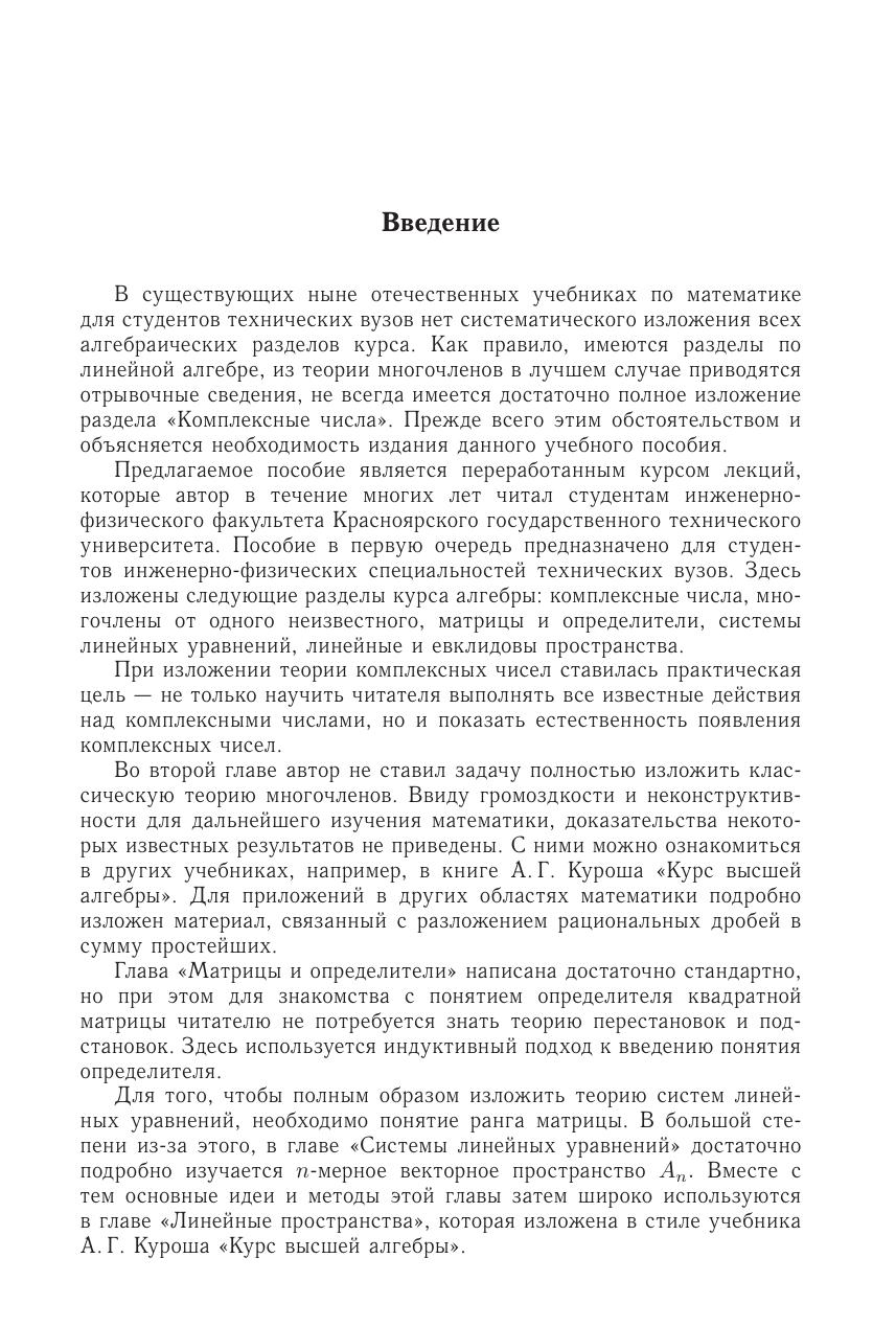 Учебное пособие предназначено студентам инженерно-технических специальностей технических вузов. Здесь изложены следующие разделы курса алгебры: комплексные числа, многочлены от одного неизвестного, матрицы и определители, системы линейных уравнений, линейные пространства, евклидовы пространства.Книга будет полезна всем студентам технических вузов, изучающим математику, а также преподавателям и аспирантам.