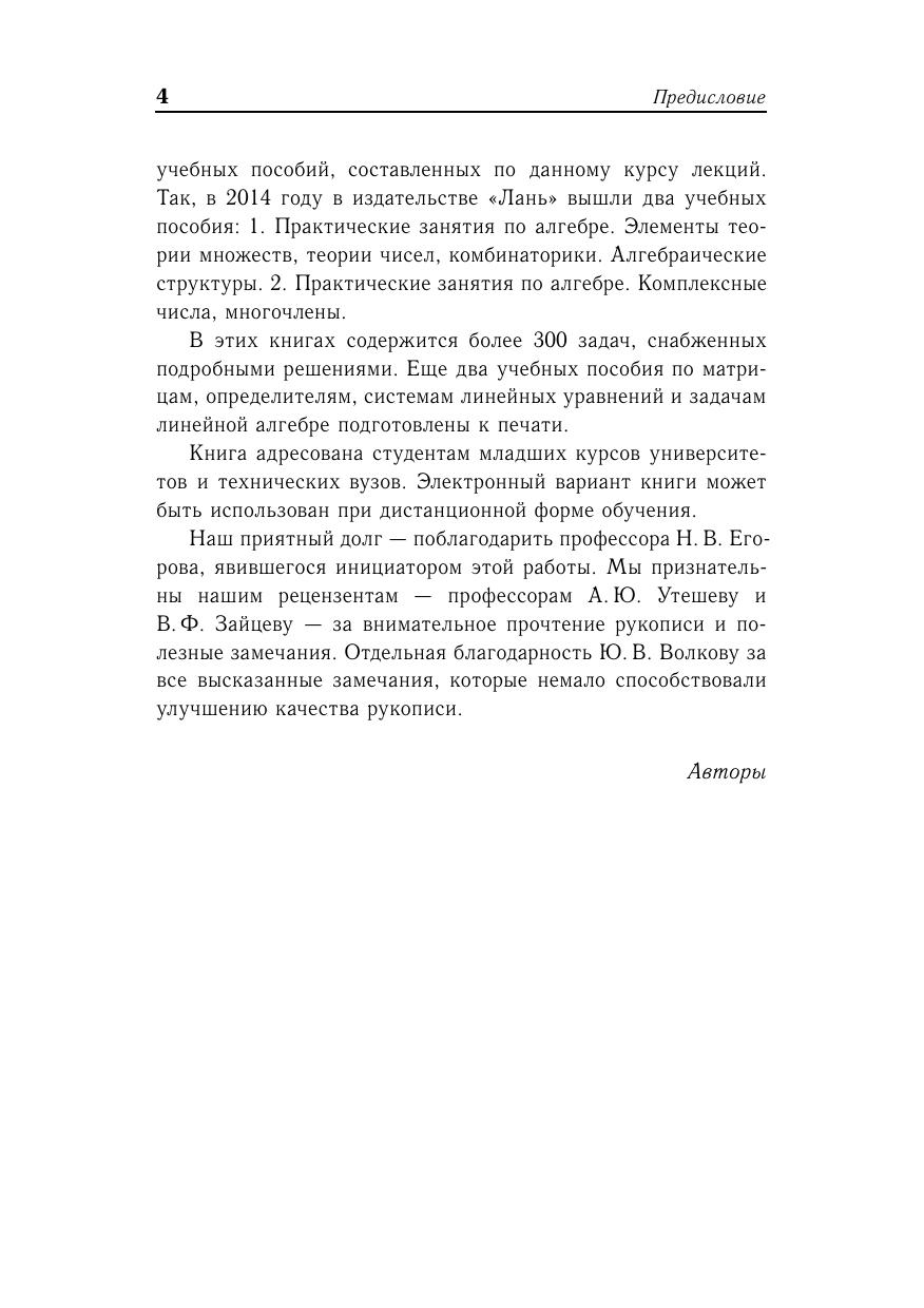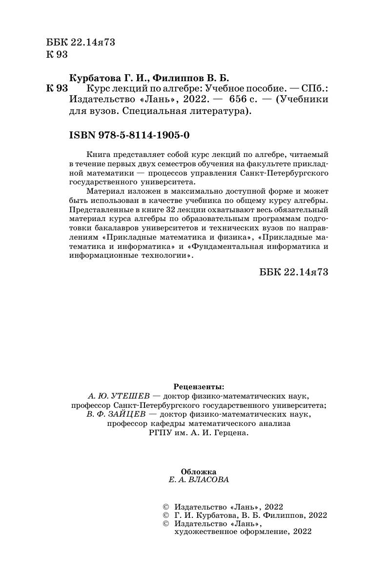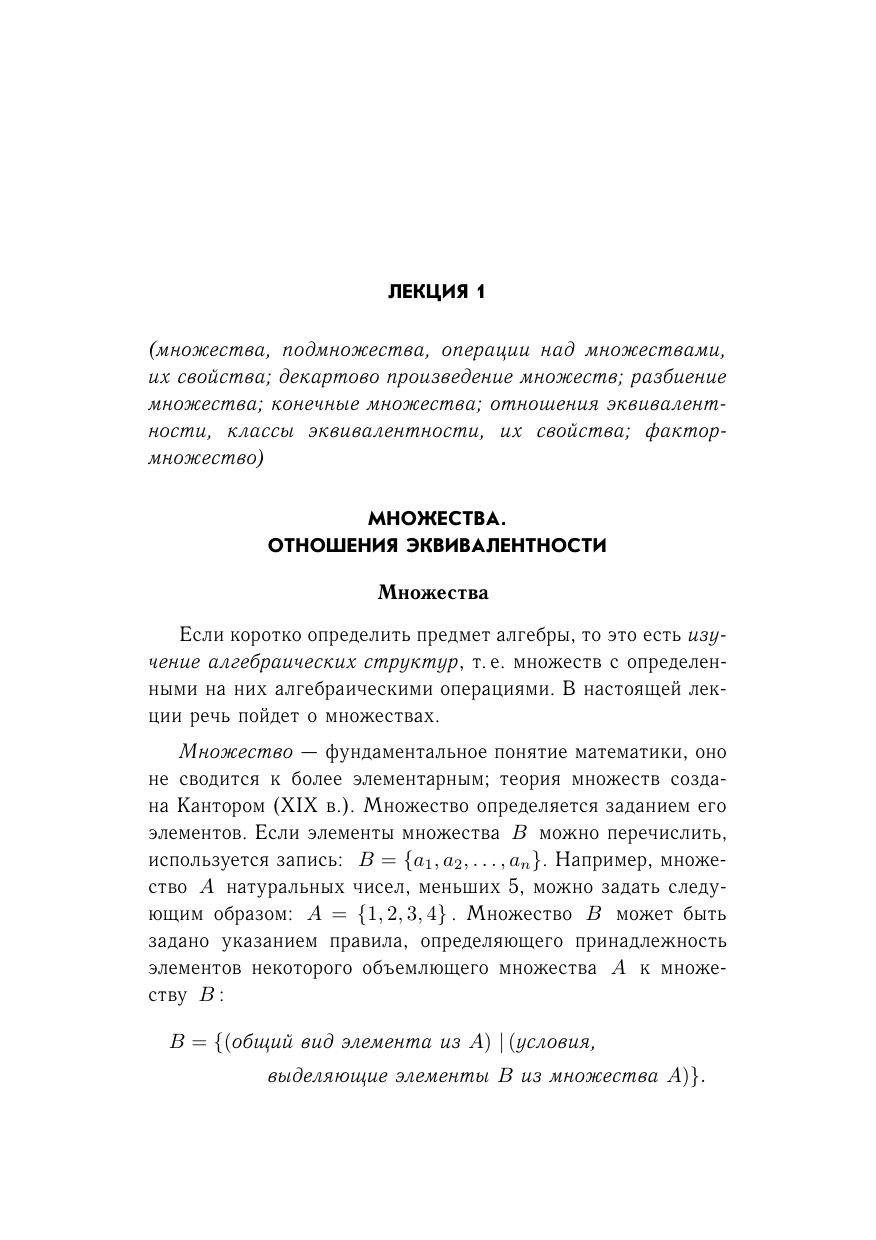 Книга представляет собой курс лекций по алгебре, читаемый в течение первых двух семестров обучения на факультете прикладной математики — процессов управления Санкт-Петербургского государственного университета. Матерал изложен в максимально доступной форме и может быть использован в качестве учебника по общему курсу алгебры. Представленные в книге 32 лекции охватывают весь обязательный материал курса алгебры по образовательным программам подготовки бакалавров университетов и технических вузов по направлениям «Прикладные математика и физика», «Прикладные математика и информатика» и «Фундаментальная информатика и информационные технологии».