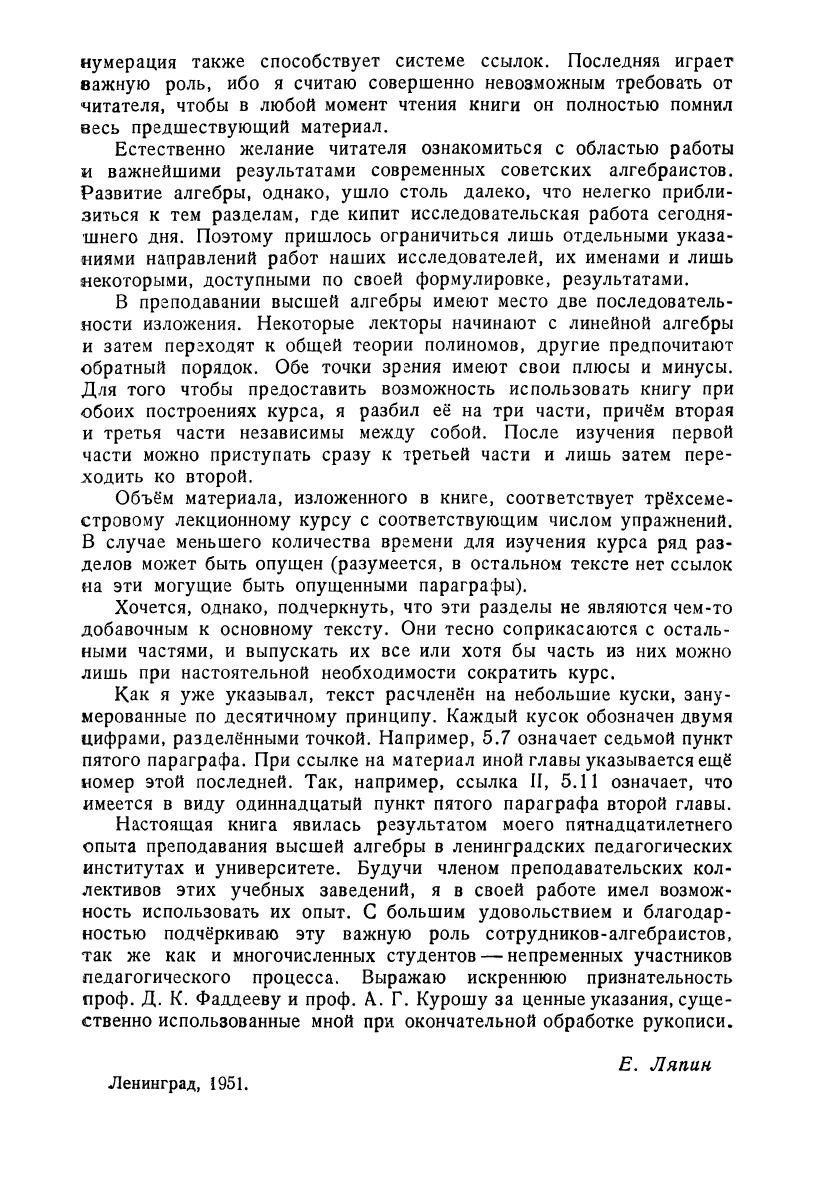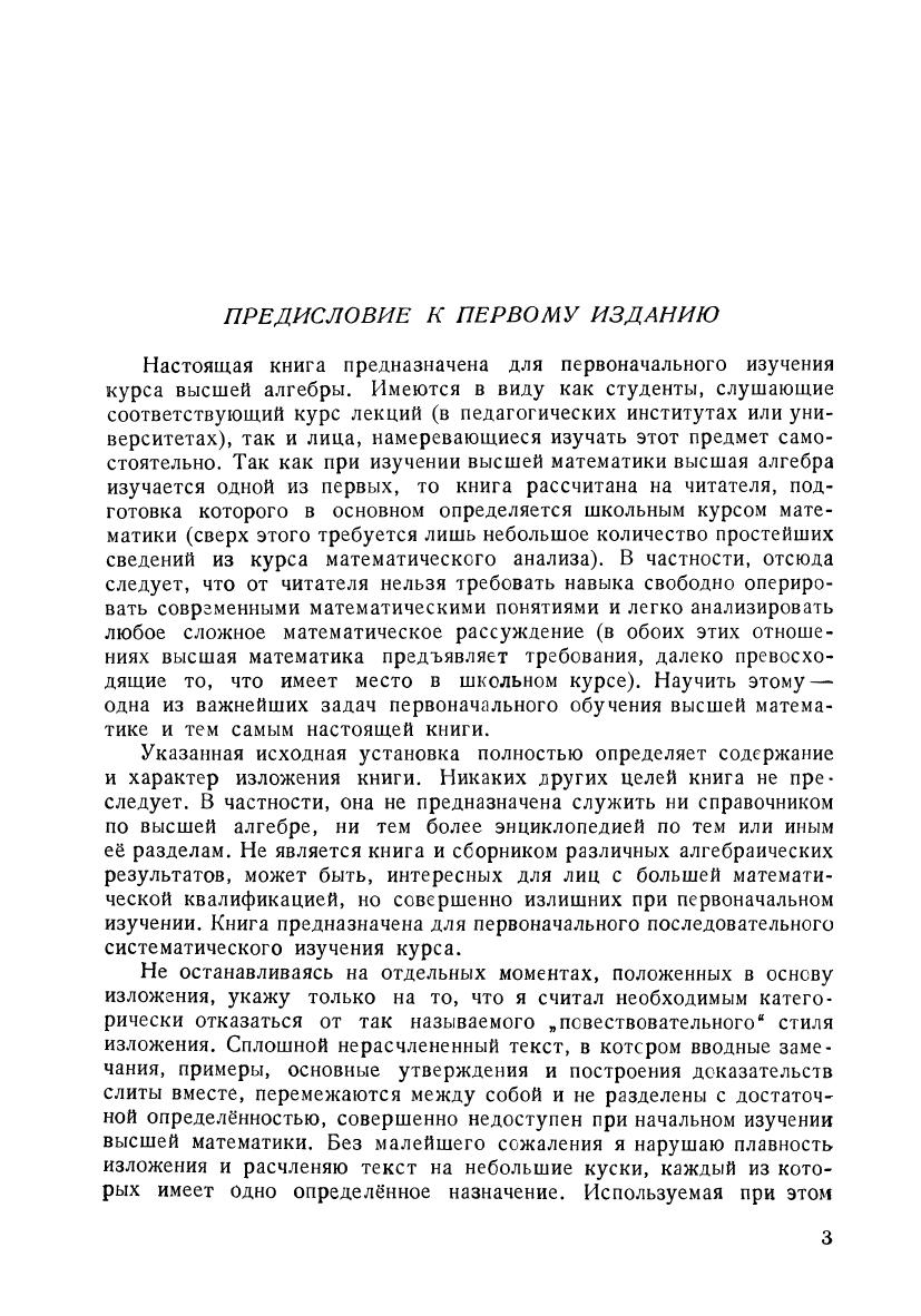 Книга предназначена для первоначального систематического изучения курса высшей алгебры и рассчитана на читателя, подготовка которого в основном определяется школьным курсом математики. Рассмотрены темы: комплексные числа, алгебраические уравнения и системы алгебраических уравнений, разложение полиномов на множители над произвольным числовым полем и над основными числовыми полями, вещественные алгебраические уравнения, алгебраические числа, определители, линейная зависимость, действия с матрицами, системы линейных уравнений, квадратичные формы. Учебник адресован студентам педагогических институтов и университетов, а также лицам, изучающим этот предмет самостоятельно.