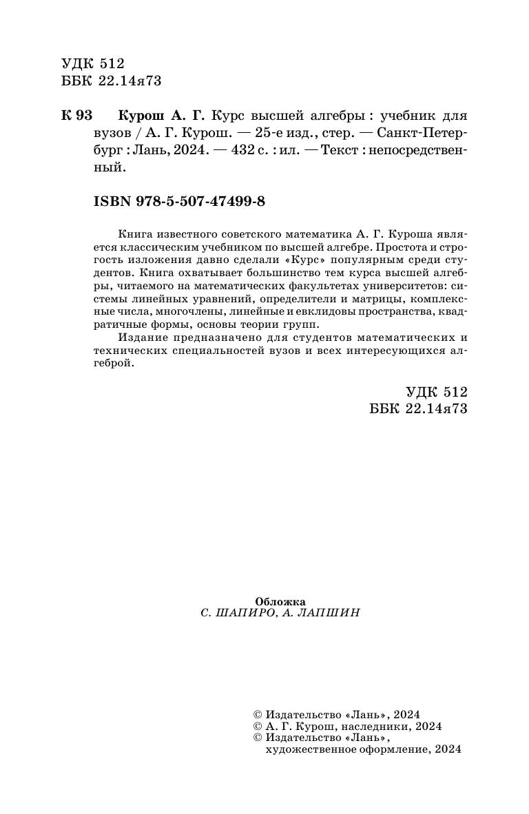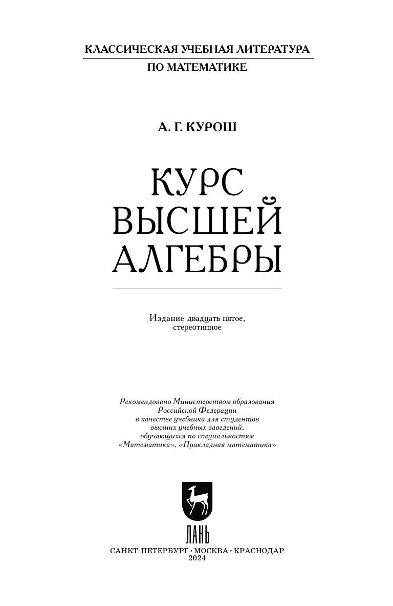 Книга известного советского математика А. Г. Куроша является классическим учебником по высшей алгебре. Простота и строгость изложения давно сделали "Курс" популярным среди студентов. Книга охватывает большинство тем курса высшей алгебры, читаемого на математических факультетах университетов: системы линейных уравнений, определители и матрицы, комплексные числа, многочлены, линейные и евклидовы пространства, квадратичные формы, основы теории групп. Издание предназначено для студентов математических и технических специальностей вузов и всех интересующихся алгеброй.