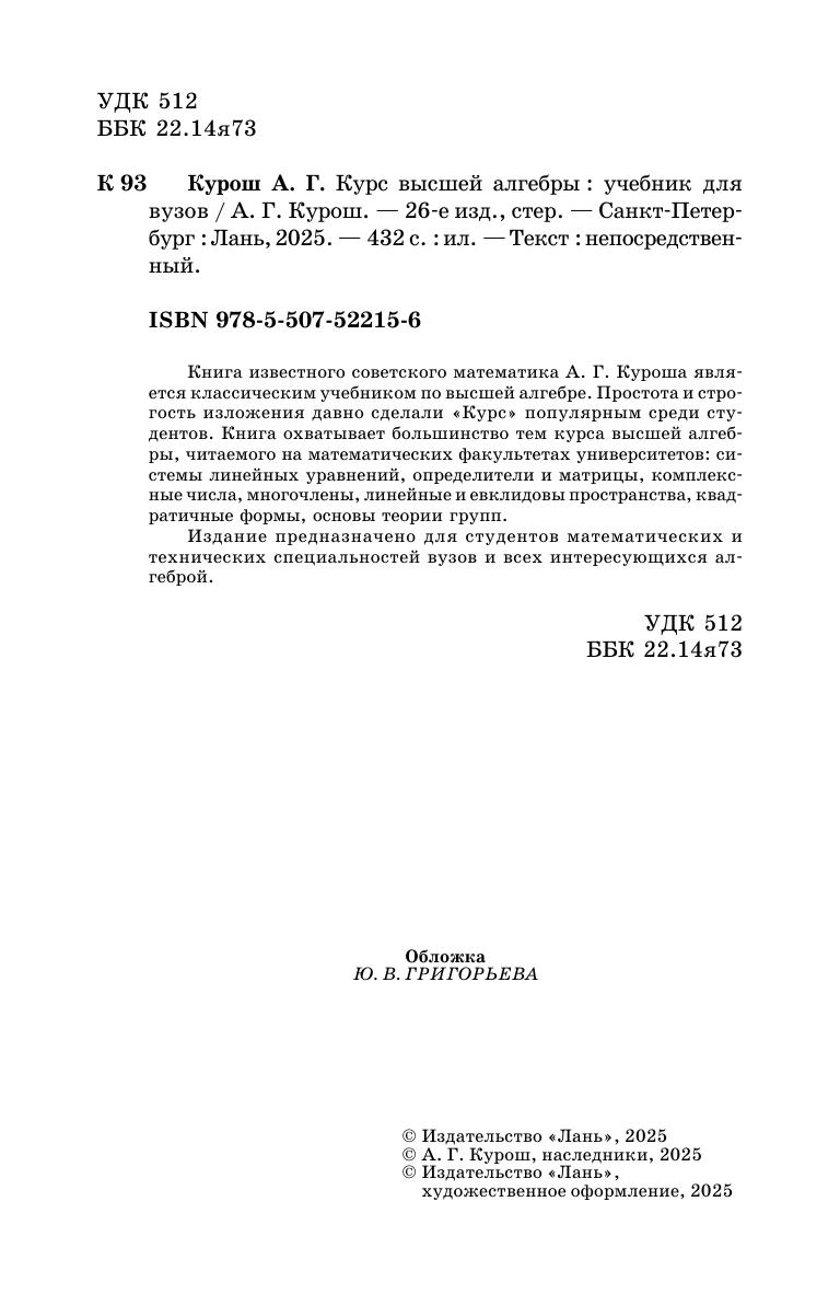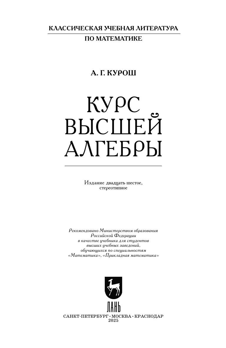 Книга известного советского математика А. Г. Куроша является классическим учебником по высшей алгебре. Простота и строгость изложения давно сделали "Курс" популярным среди студентов. Книга охватывает большинство тем курса высшей алгебры, читаемого на математических факультетах университетов: системы линейных уравнений, определители и матрицы, комплексные числа, многочлены, линейные и евклидовы пространства, квадратичные формы, основы теории групп. Издание предназначено для студентов математических и технических специальностей вузов и всех интересующихся алгеброй.