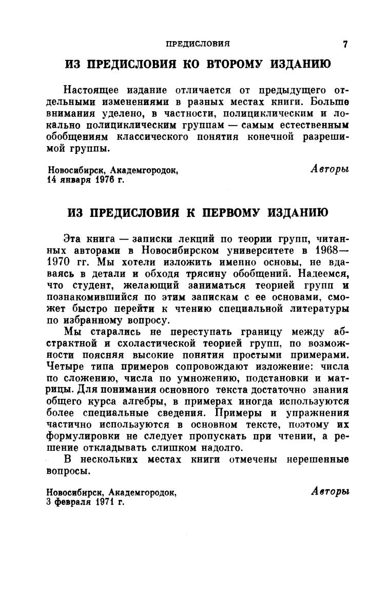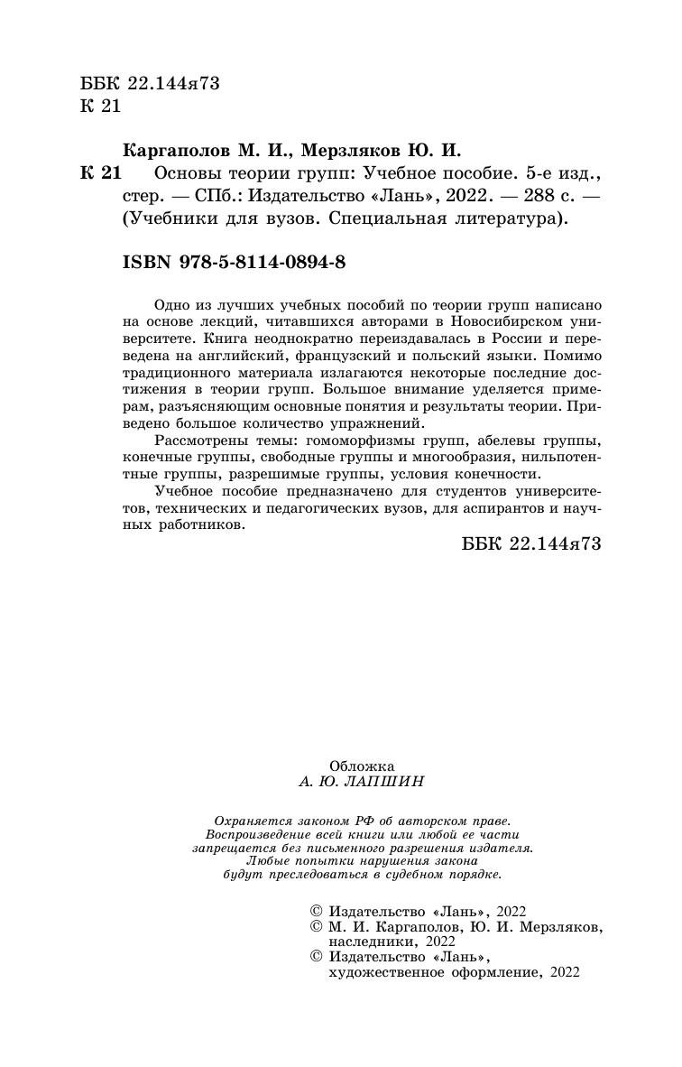 Одно из лучших учебных пособий по теории групп написано на основе лекций, читавшихся авторами в Новосибирском университете. Книга неоднократно переиздавалась в России и переведена на английский, французский и польский языки. Помимо традиционного материала излагаются некоторые последние достижения в теории групп. Большое внимание уделяется примерам, разъясняющим основные понятия и результаты теории. Приведено большое количество упражнений. Рассмотрены темы: гомоморфизмы групп, абелевы группы, конечные группы, свободные группы и многообразия, нильпотентные группы, разрешимые группы, условия конечности. Учебное пособие предназначено для студентов университетов, технических и педагогических вузов, для аспирантов и научных работников.