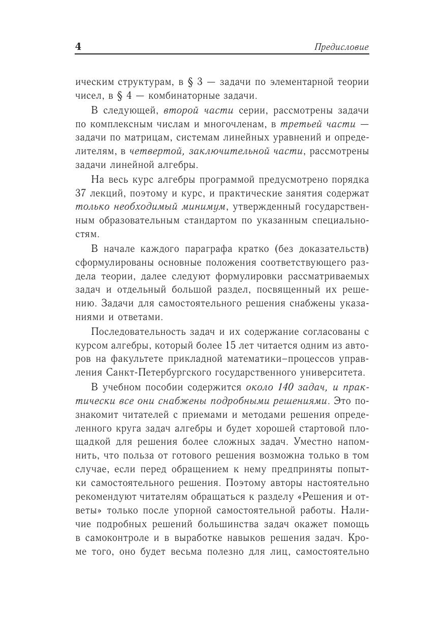Настоящее учебное пособие является первым в запланированной серии, состоящей из че-тырех частей и охватывающей весь обязательный практический материал по курсу алгеб-ры для обучающихся по образовательным программам подготовки бакалавров универси-тетов и технических вузов по направлениям «Прикладные математика и физика», «При-кладные математика и информатика» и «Фундаментальная информатика и информацион-ные технологии». Книга охватывает материал первых 5 лекций курса алгебры. В § 1 рас-смотрены задачи из элементарной теории множеств и отображений, в § 2 — простейшие задачи по алгебраическим структурам, в § 3 — задачи по элементарной теории чисел, в § 4 — комбинаторные задачи.