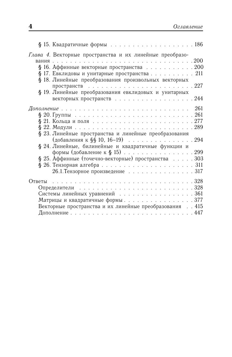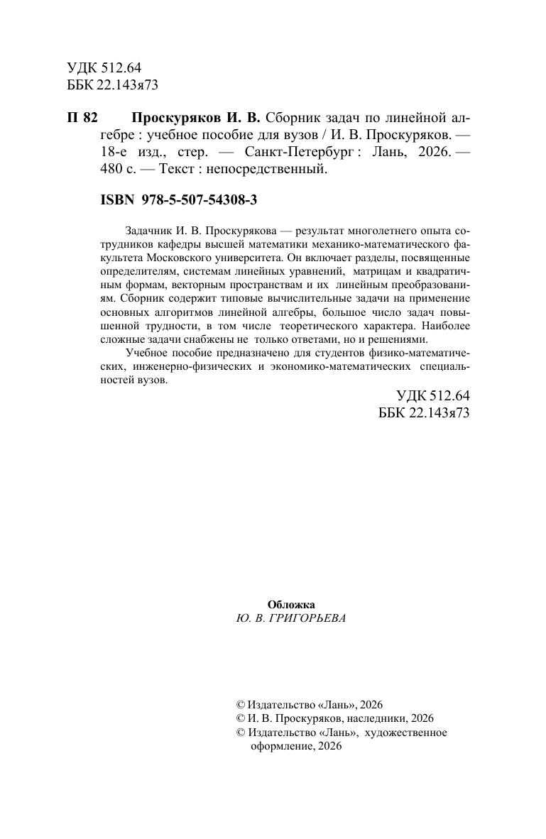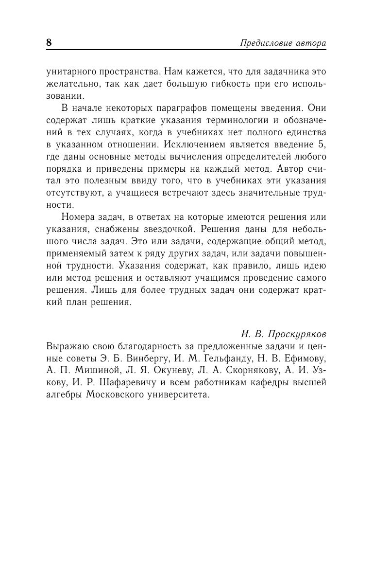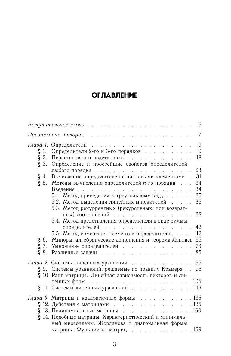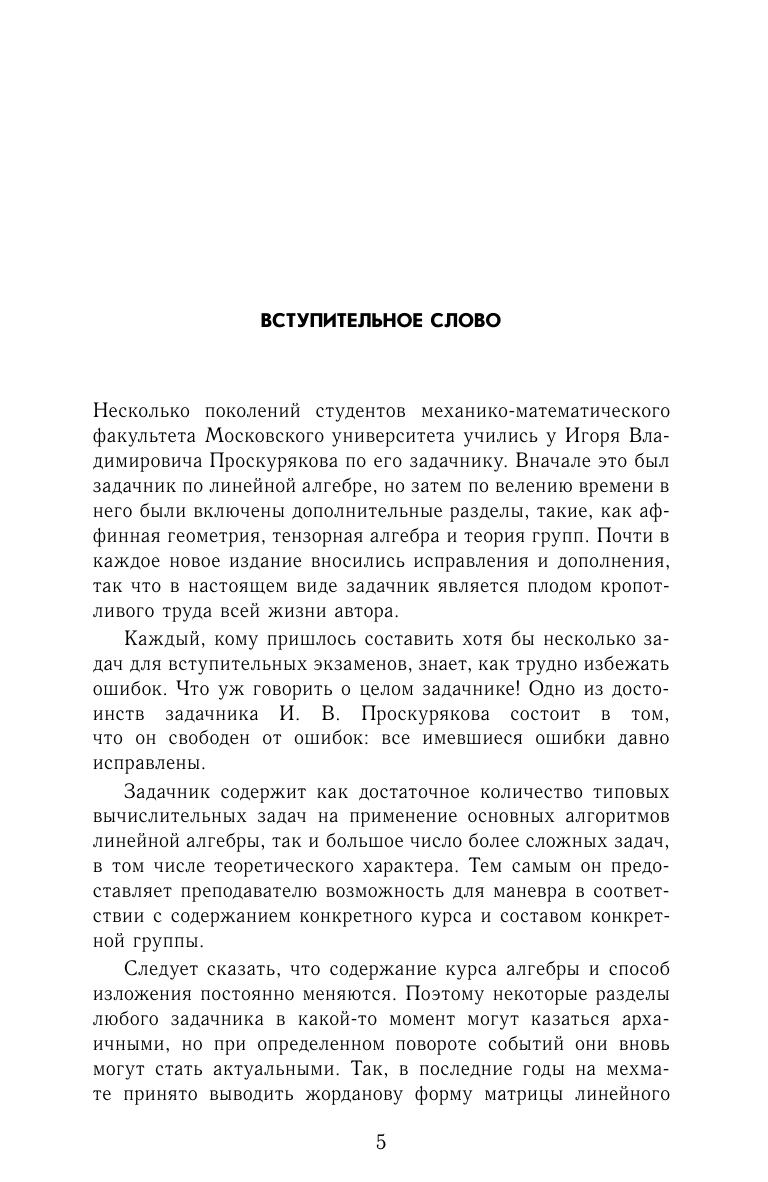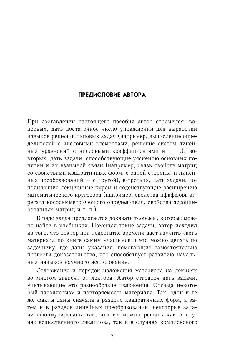 Задачник И. В. Проскурякова — результат многолетнего опыта сотрудников кафедры высшей математики механико-математического факультета Московского университета. Он включает разделы, посвященные определителям, системам линейных уравнений, матрицам и квадратичным формам, векторным пространствам и их линейным преобразованиям. Сборник содержит типовые вычислительные задачи на применение основных алгоритмов линейной алгебры, большое число задач повышенной трудности, в том числе теоретического характера. Наиболее сложные задачи снабжены не только ответами, но и решениями. Учебное пособие предназначено для студентов физико-математических, инженерно-физических и экономико-математических специальностей вузов.