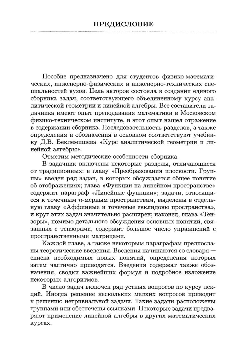 Сборник соответствует объединенному курсу аналитической геометрии и линейной алгебры. Приведено большое количество задач по следующим разделам: системы линейных уравнений, матрицы и определители, кривые и поверхности второго порядка, преобразования плоскости, линейные преобразования линейных, евклидовых и унитарных пространств, функции на линейном пространстве, аффинные и точечные евклидовы пространства, тензоры. Имеются теоретические введения ко всем разделам. Кроме задач, способствующих усвоению основных понятий, приведены серии типовых задач с ответами. Некоторые типовые и более сложные задачи снабжены полными решениями. Все составители задачника имеют опыт преподавания математики в МФТИ, и этот опыт нашел отражение в содержании сборника. Пособие предназначено для студентов физико-математических, инженерно-физических и инженерно-технических специальностей вузов.
