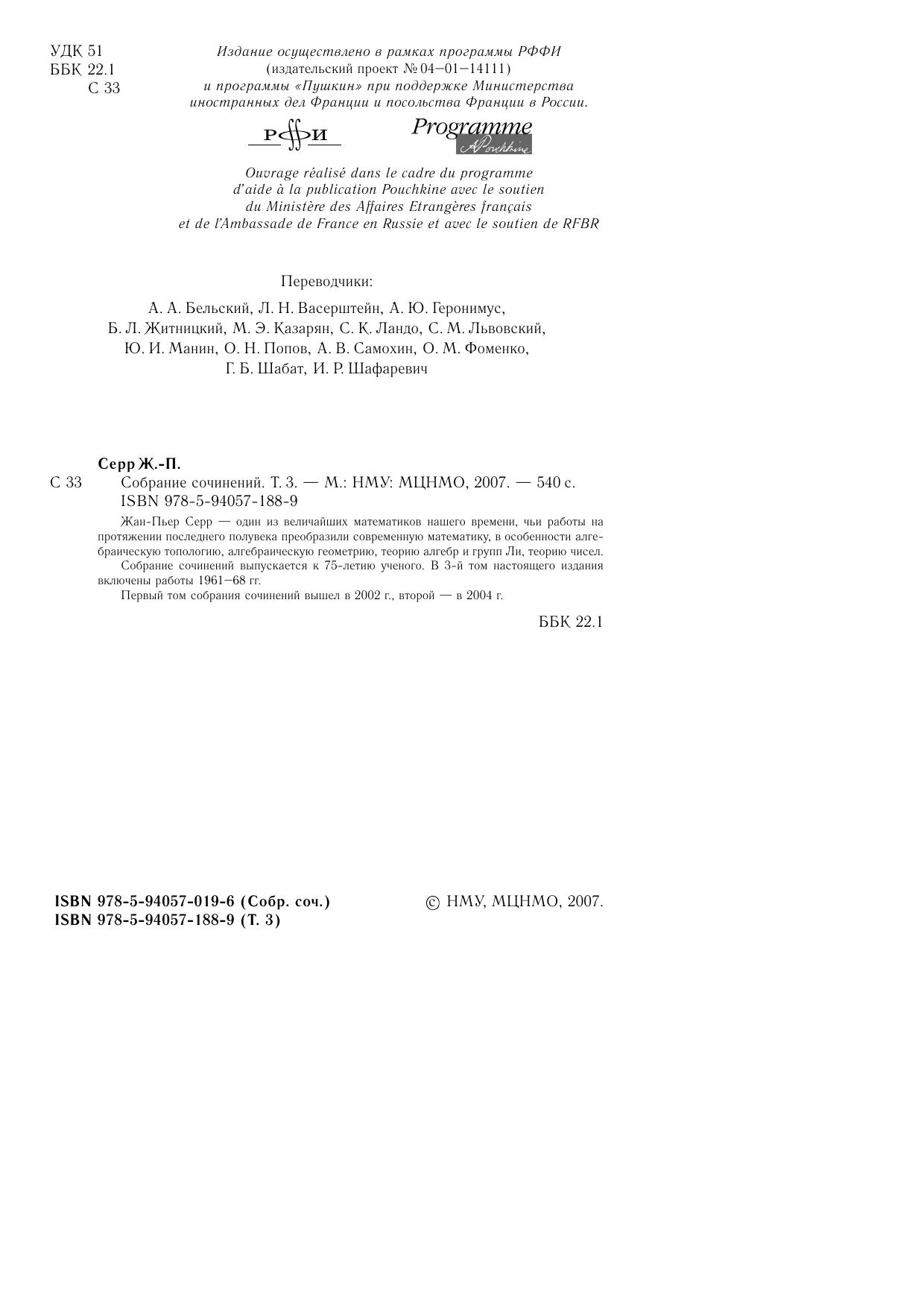 Жан-Пьер Серр — один из величайших математиков нашего времени, чьи работы на протяжении последнего полувека преобразили современную математику, в особенности алгебраическую топологию, алгебраическую геометрию, теорию алгебр и групп Ли, теорию чисел.Собрание сочинений выпускается к 75-летию ученого. В 3-й том настоящего издания включены работы 1961–68 гг.Первый том собрания сочинений вышел в 2002 г., второй — в 2004 г.