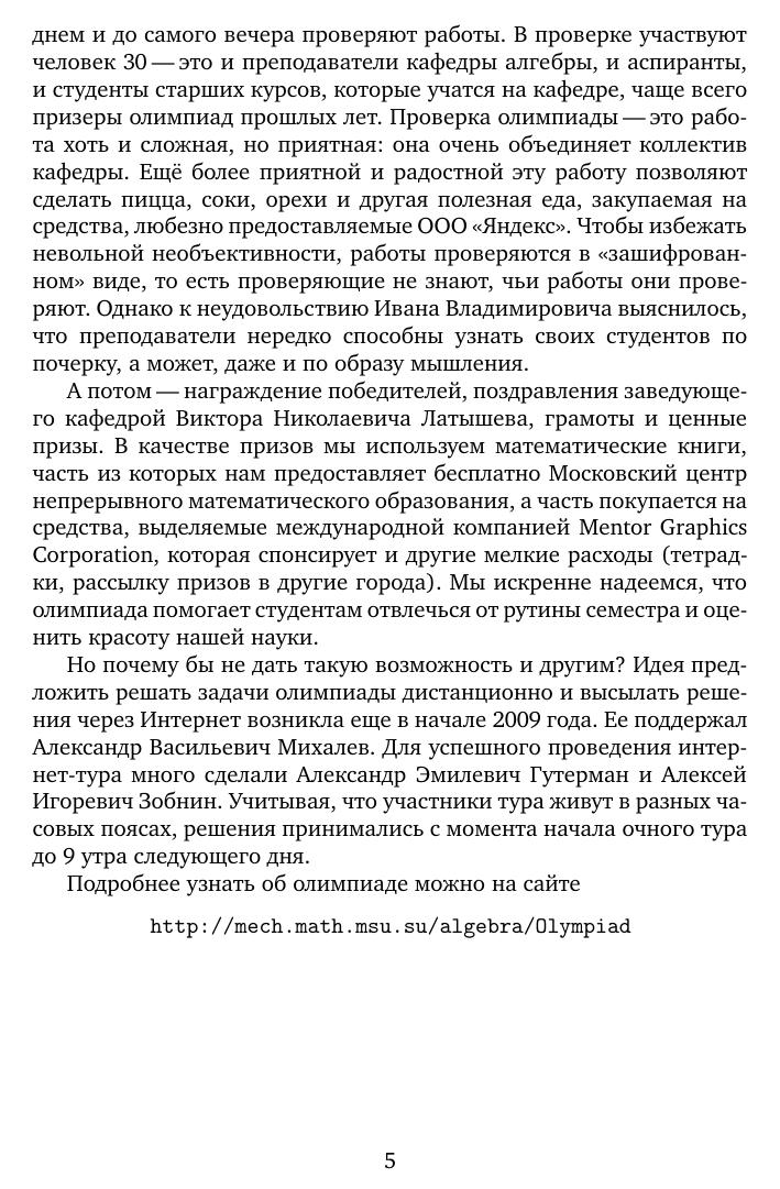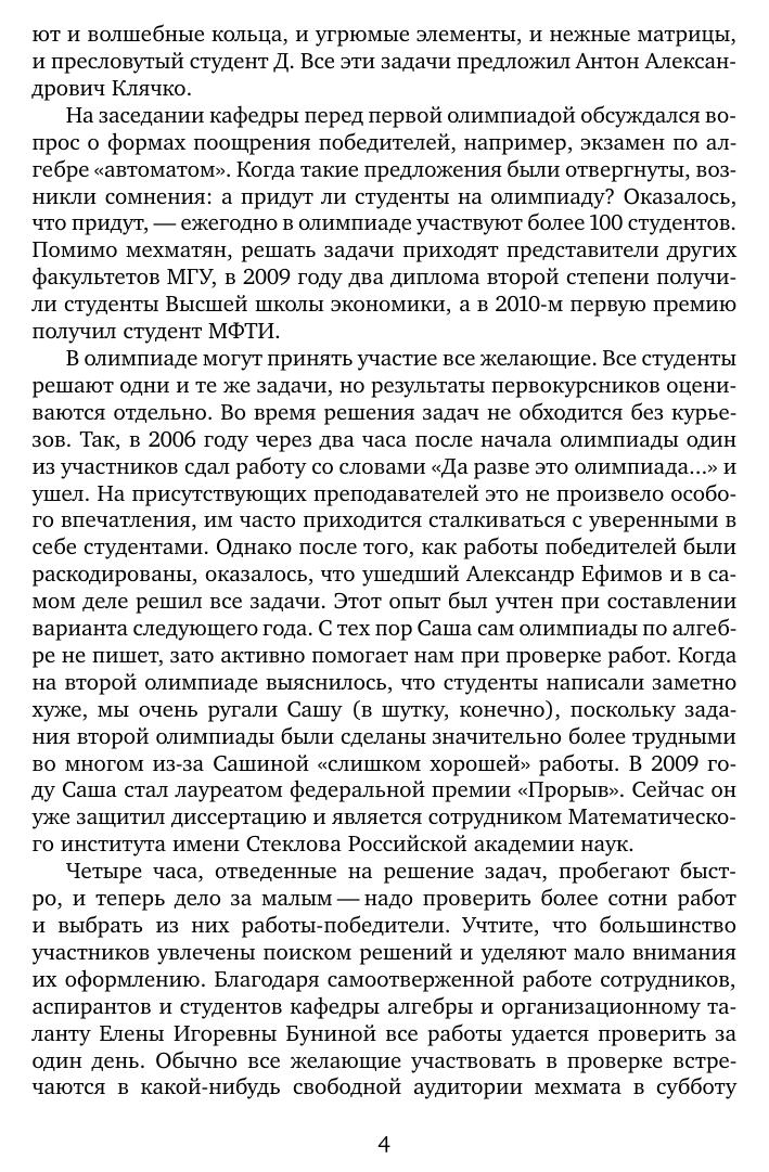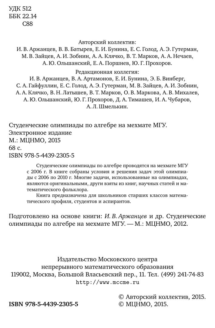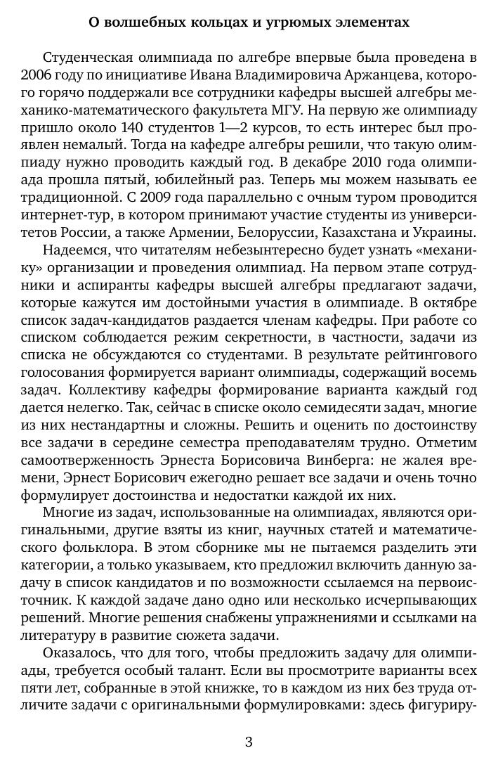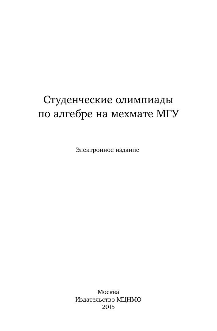 Студенческие олимпиады по алгебре проводятся на мехмате МГУ с 2006 г. В книге собраны условия и решения задач этой олимпиады с 2006 по 2010 г. Многие задачи, использованные на олимпиадах, являются оригинальными, други взяты из книг, научных статей и математического фольклора. Книга предназначена для школьников старших классов математического профиля, студентов и аспирантов.