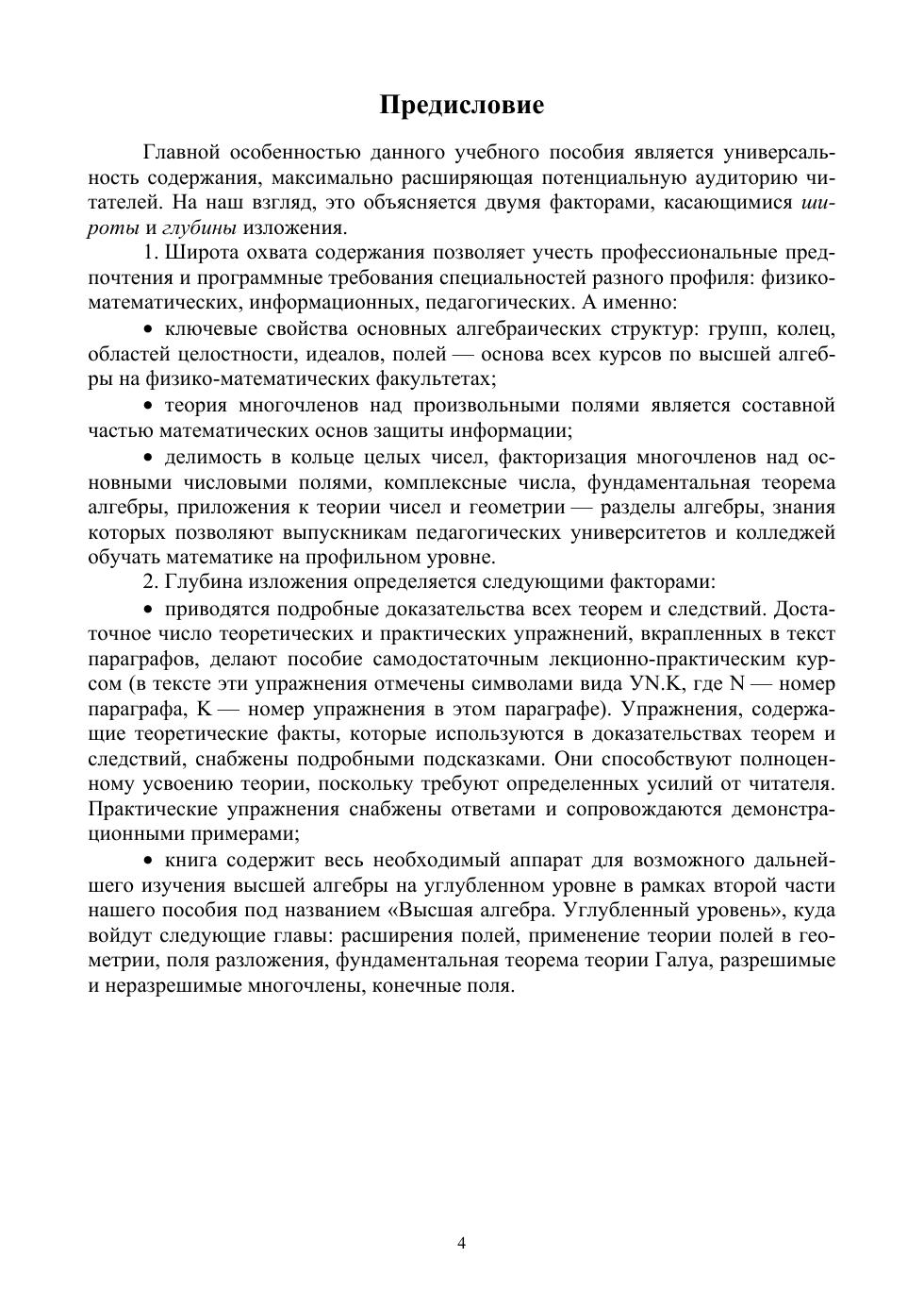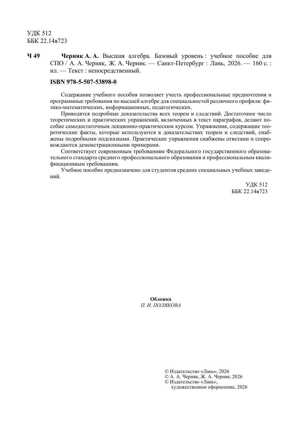 Содержание учебного пособия позволяет учесть профессиональные предпочтения и программные требования по высшей алгебре для специальностей различного профиля: физико-математических, информационных, педагогических. Приводятся подробные доказательства всех теорем и следствий. Достаточное число теоретических и практических упражнений, включенных в текст параграфов, делают пособие самодостаточным лекционно-практическим курсом. Упражнения, содержащие теоретические факты, которые используются в доказательствах теорем и следствий, снабжены подробными подсказками. Практические упражнения снабжены ответами и сопровождаются демонстрационными примерами. Соответствует современным требованиям Федерального государственного образовательного стандарта среднего профессионального образования и профессиональным квалификационным требованиям. Учебное пособие предназначено для студентов средних специальных учебных заведений.