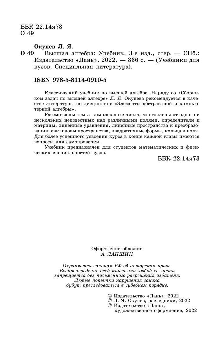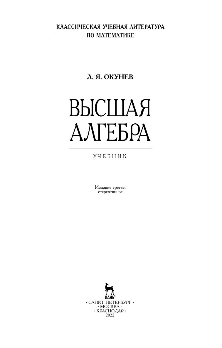Классический учебник по высшей алгебре. Наряду со «Сборником задач по высшей алгебре» Л. Я. Окунева рекомендуется в качестве литературы по дисциплине «Элементы абстрактной и компьютерной алгебры». Рассмотрены темы: комплексные числа, многочлены от одного и нескольких неизвестных над различными полями, определители и матрицы, линейные уравнения, линейные пространства и преобразования, евклидовы пространства, квадратичные формы, кольца и поля. Для более успешного усвоения курса в конце каждой главы имеются вопросы для самопроверки. Учебник предназначен для студентов математических и физических специальностей вузов.