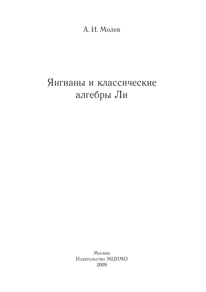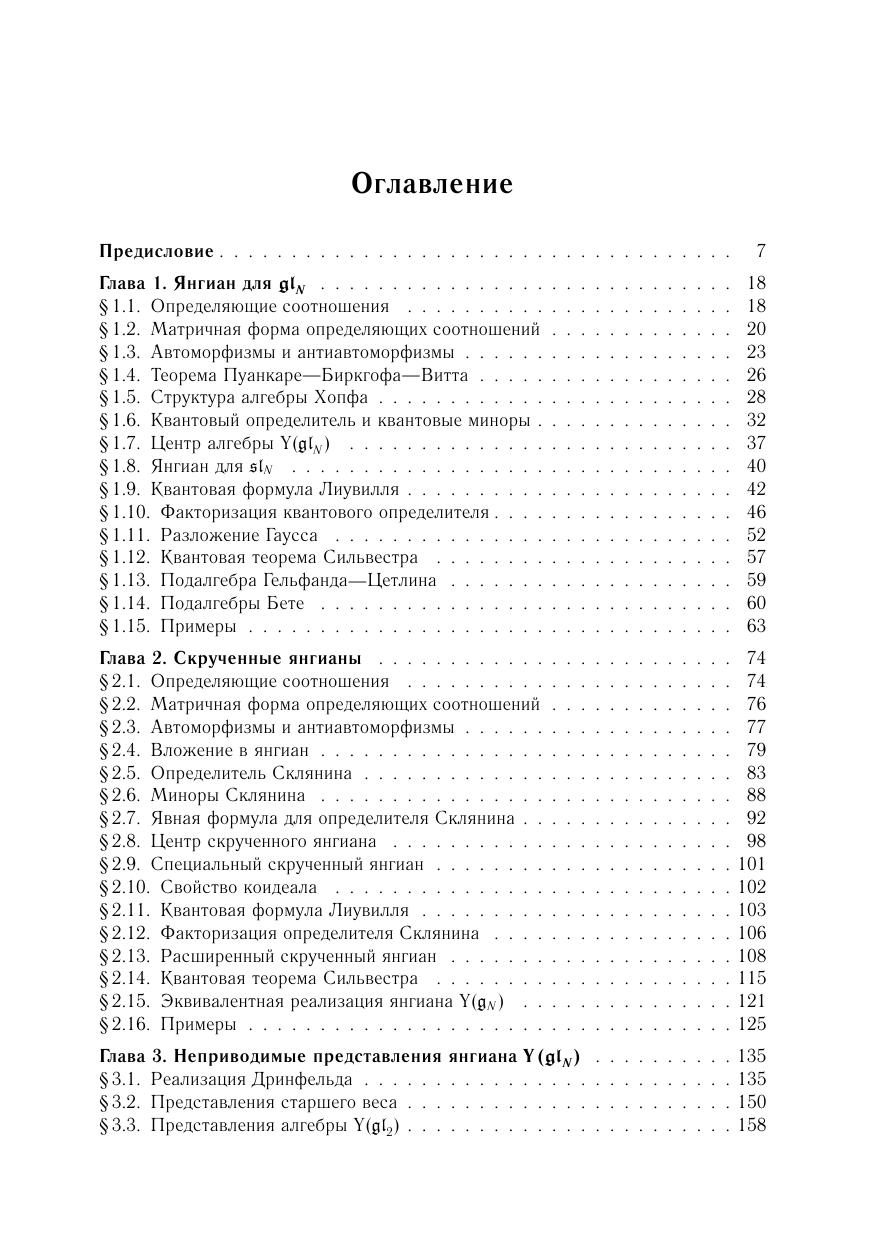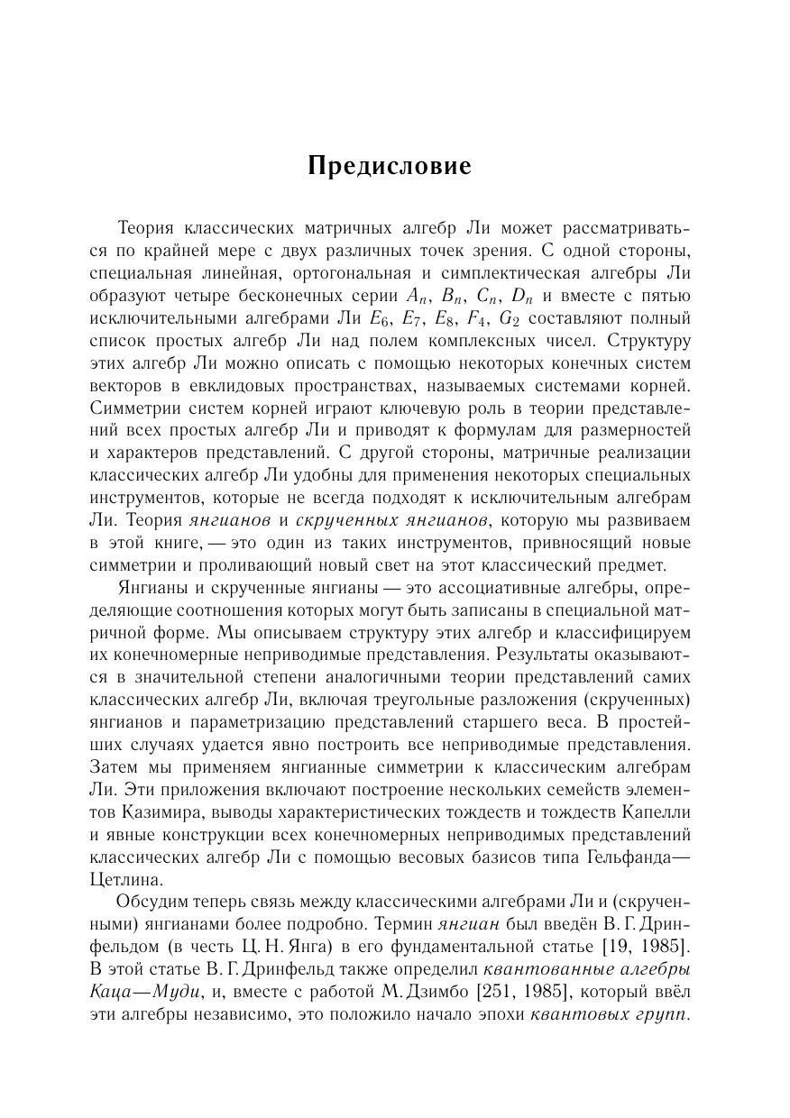 Книга является введением в теорию янгианов — ассоциативных алгебр специального типа, берущих свое начало в математической физике. Первая часть книги (главы 1–6) содержит подробное и замкнутое изложение структурной теории и теории представлений этих алгебр, включая классификацию и описание конечномерных неприводимых представлений. Во второй части (главы 7–9) рассматриваются приложения к классическим алгебрам Ли. В частности, рассматриваются несколько семейств элементов Казимира и описываются соотношения между ними доказываются обобщенные тождества Капелли с помощью базисов типа Гельфанда–Цетлина построена реализация всех конечномерных неприводимых представлений.Для студентов, аспирантов и научных сотрудников физико-математических специальностей.