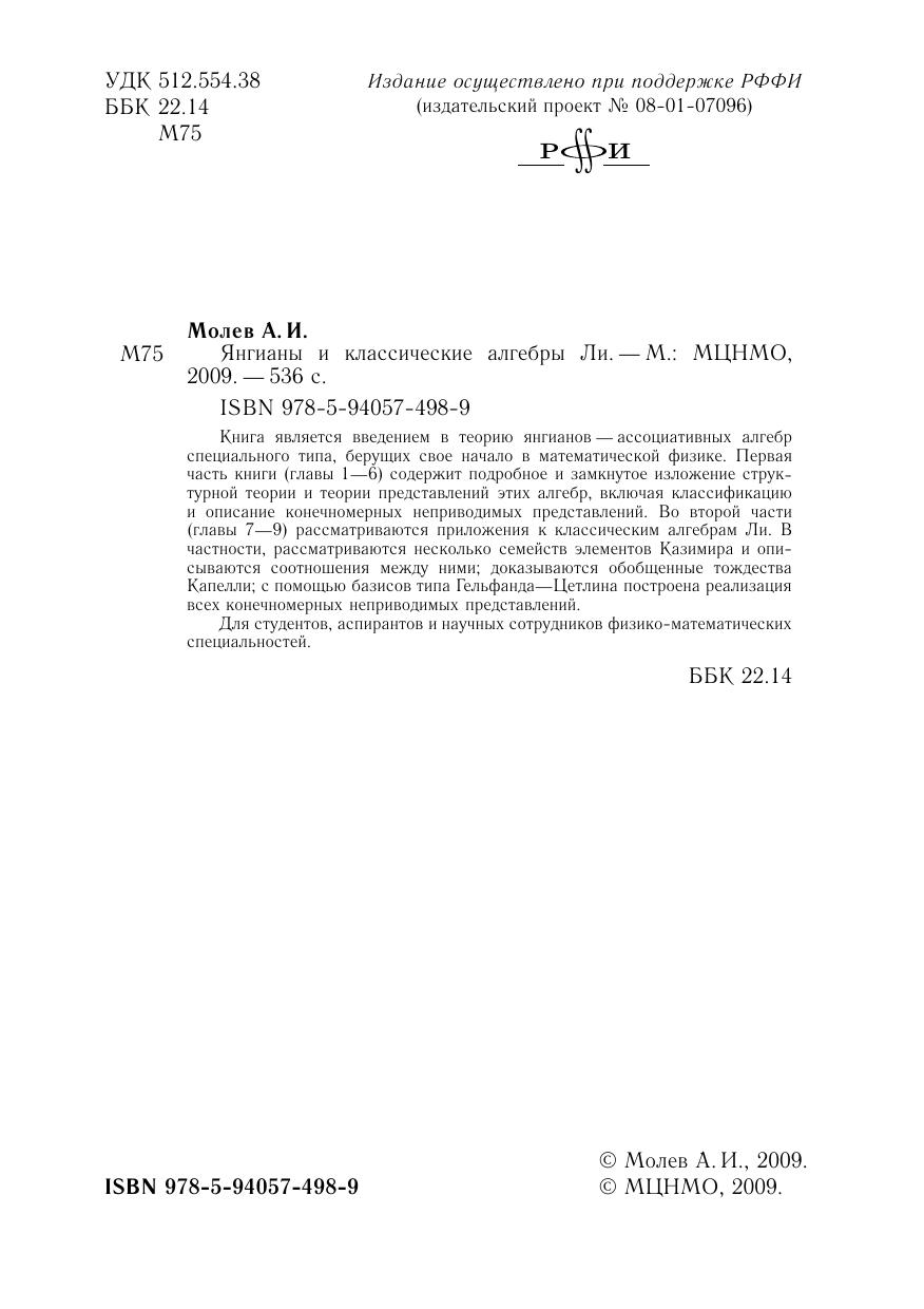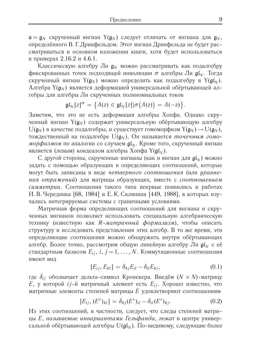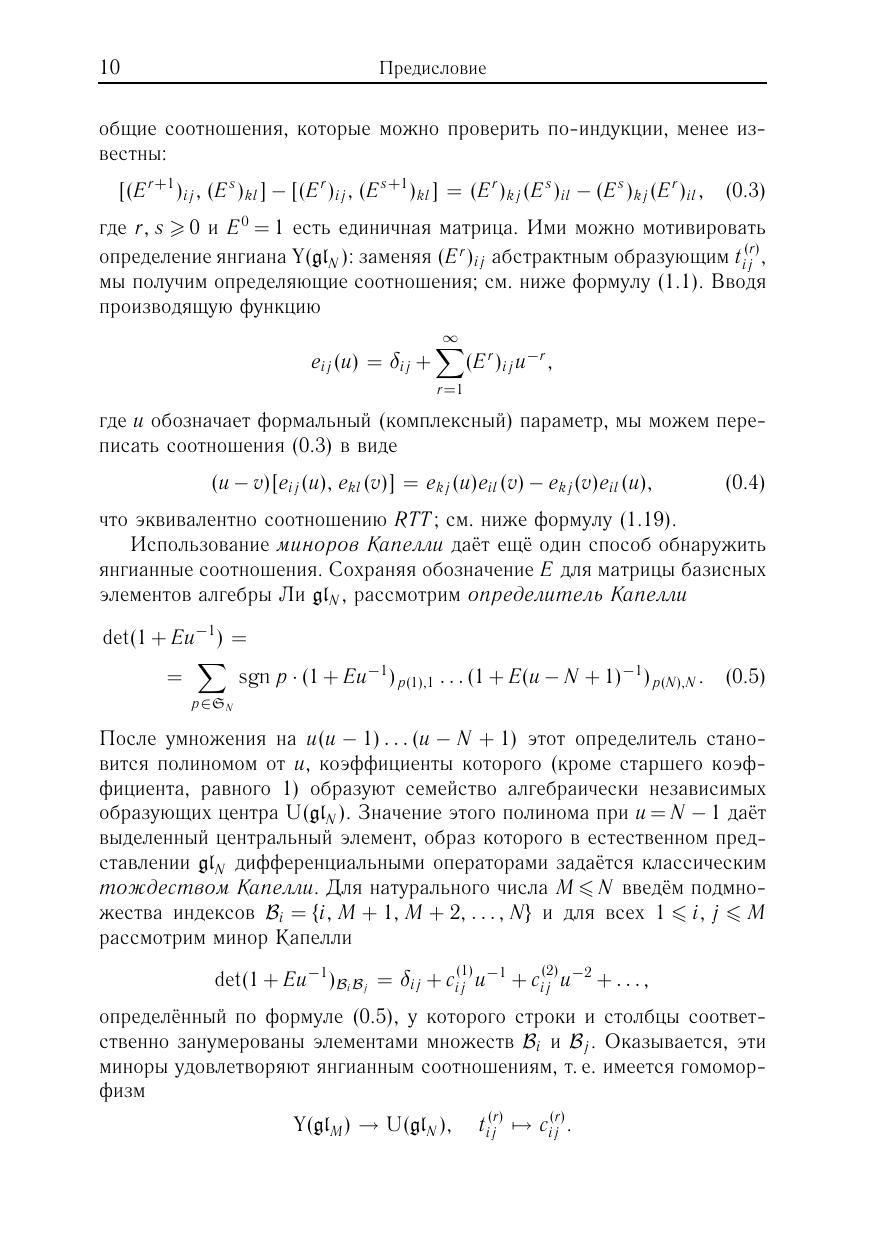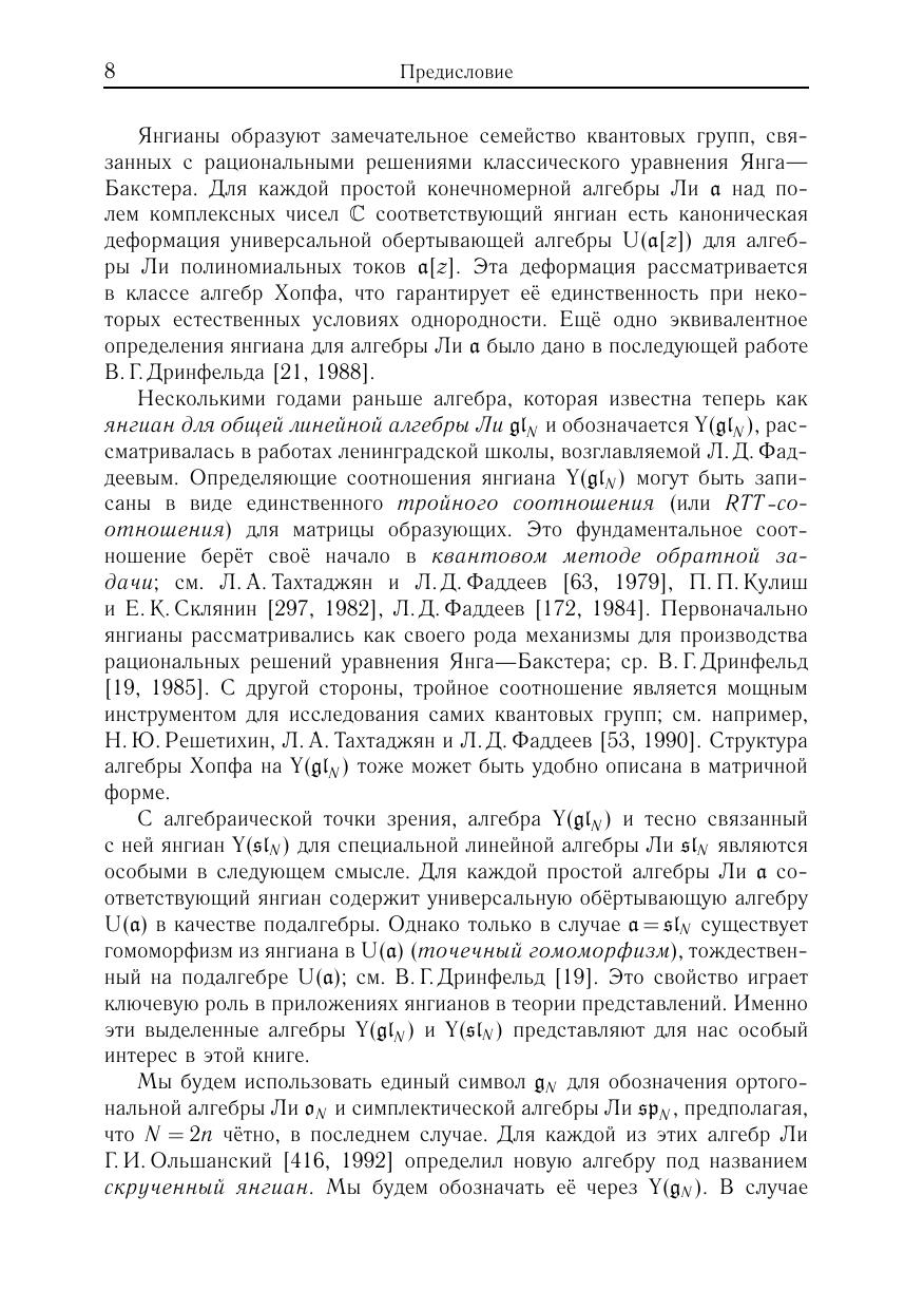 Книга является введением в теорию янгианов — ассоциативных алгебр специального типа, берущих свое начало в математической физике. Первая часть книги (главы 1–6) содержит подробное и замкнутое изложение структурной теории и теории представлений этих алгебр, включая классификацию и описание конечномерных неприводимых представлений. Во второй части (главы 7–9) рассматриваются приложения к классическим алгебрам Ли. В частности, рассматриваются несколько семейств элементов Казимира и описываются соотношения между ними доказываются обобщенные тождества Капелли с помощью базисов типа Гельфанда–Цетлина построена реализация всех конечномерных неприводимых представлений.Для студентов, аспирантов и научных сотрудников физико-математических специальностей.