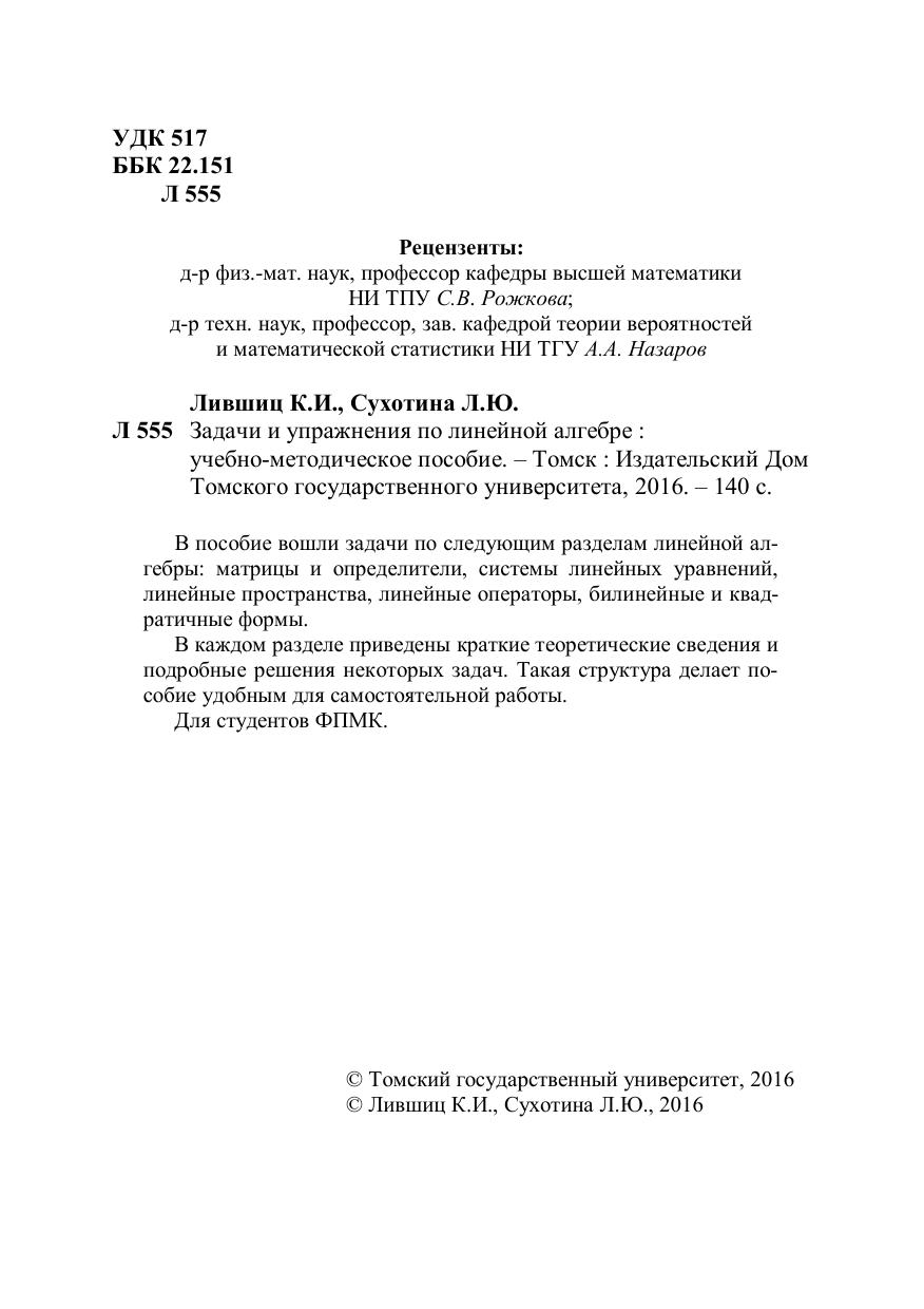 В пособие вошли задачи по следующим разделам линейной алгебры: матрицы и определители, системы линейных уравнений, линейные пространства, линейные операторы, билинейные и квадратичные формы. В каждом разделе приведены краткие теоретические сведения и подробные решения некоторых задач. Такая структура делает пособие удобным для самостоятельной работы. Для студентов ФПМК.