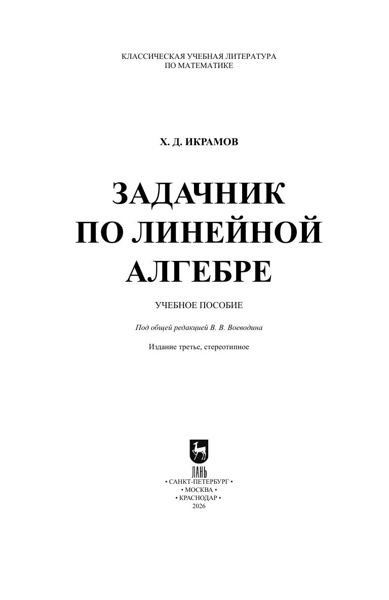 Настоящее учебное пособие отличается от многих задачников по линейной алгебре изменением традиционной структуры (тема линейных пространств предшествует задачам по теории определителей и системам линейных уравнений) и включением вопросов, посвященных понятиям современной вычислительной алгебры: норм матриц, числа обусловленности, псевдорешений систем линейных уравнений и т. д. Задачник тесно связан с учебным пособием В. В. Воеводина «Линейная алгебра» по объединенному курсу линейной алгебры и аналитической геометрии. Пособие предназначено для студентов младших курсов факультетов прикладной математики университетов и технических вузов.