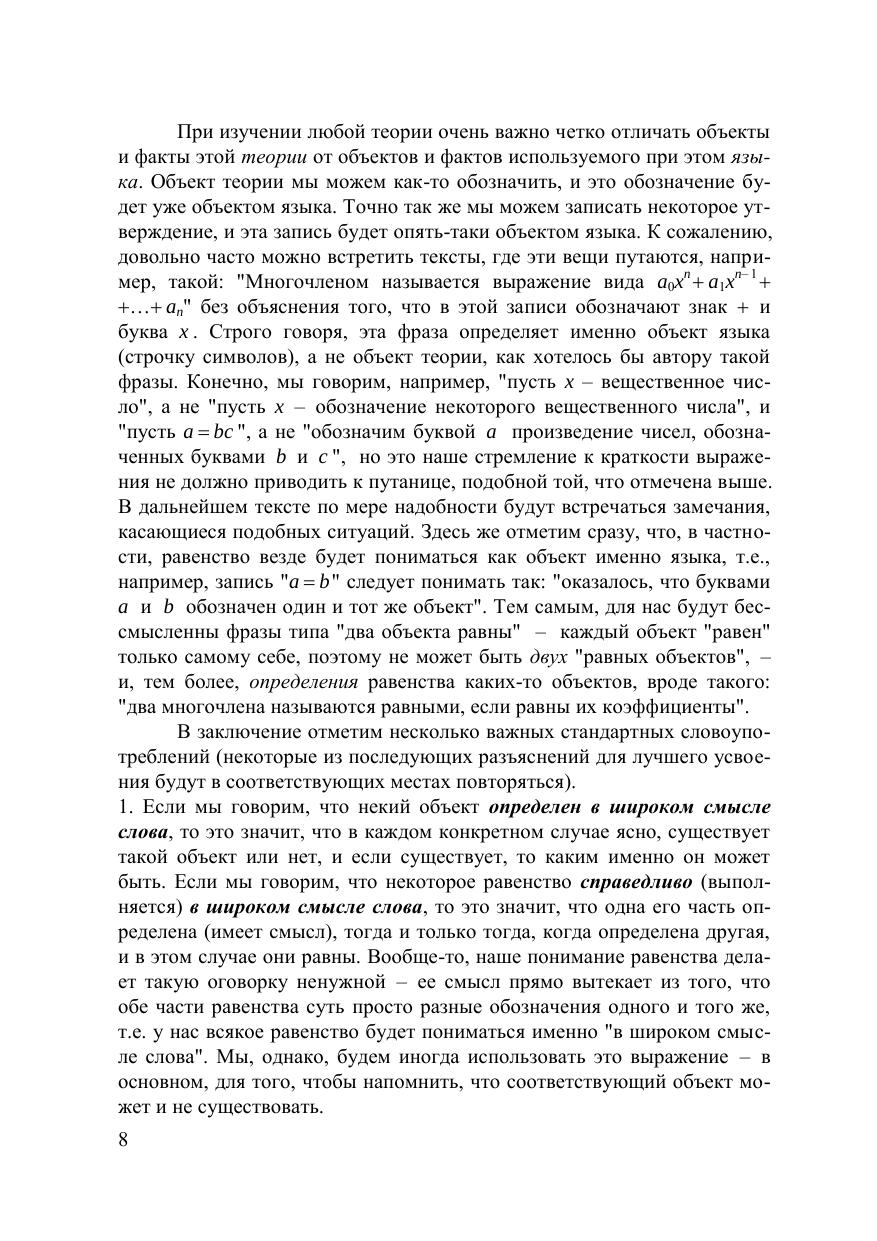 В предлагаемой книге рассмотрены такие основные понятия алгебры как множества и отношения, алгебраические структуры, матрицы, определители, линейные пространства, системы линейных уравнений, делимость в кольцах, многочлены и дробно-рациональные функции, комплексные числа, группы.