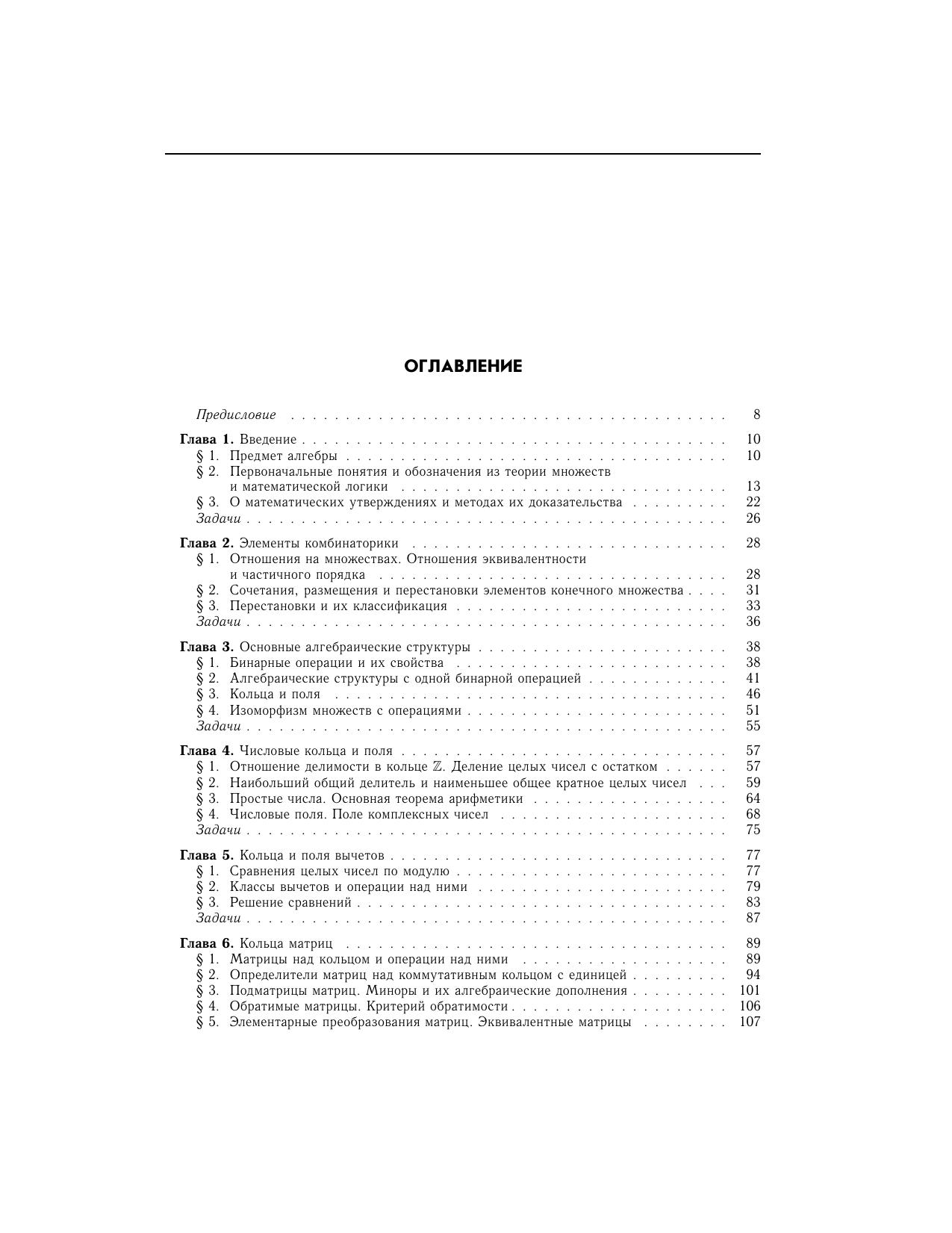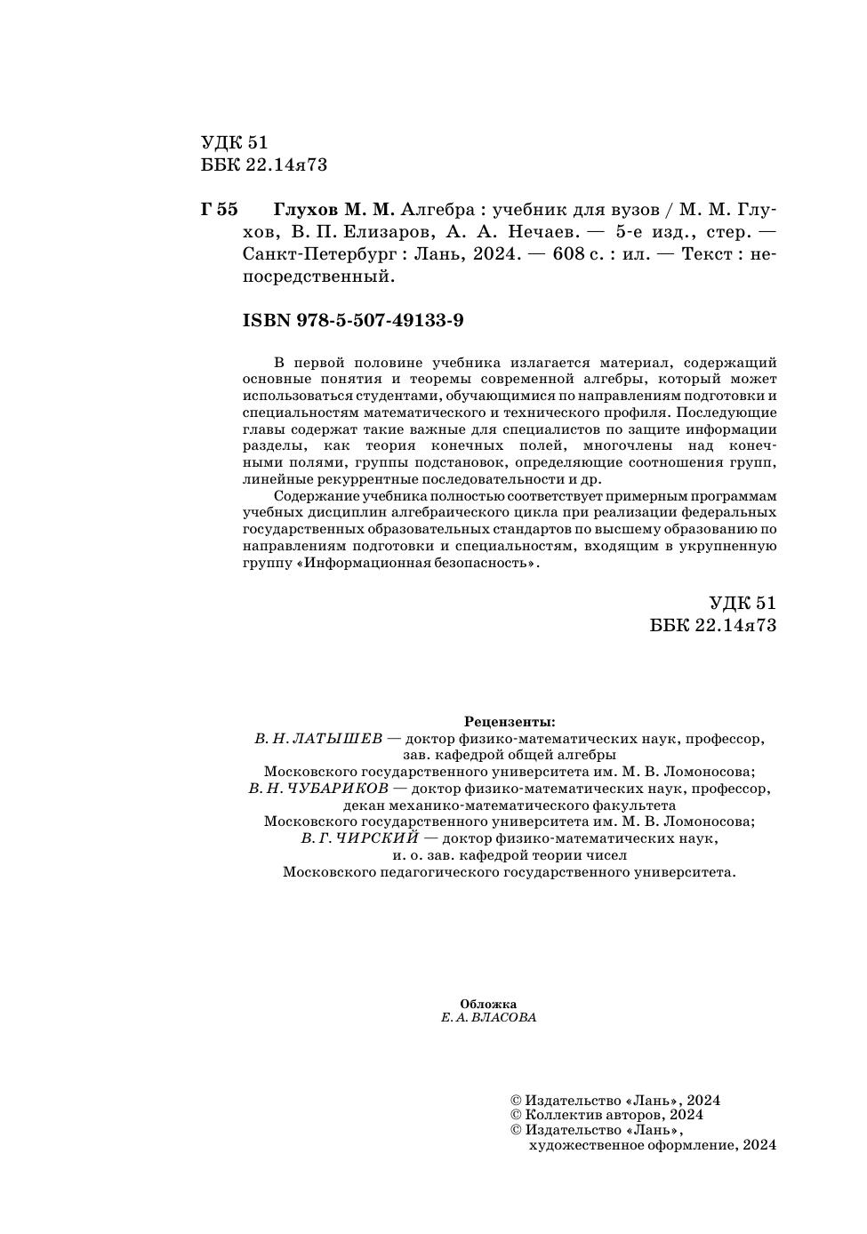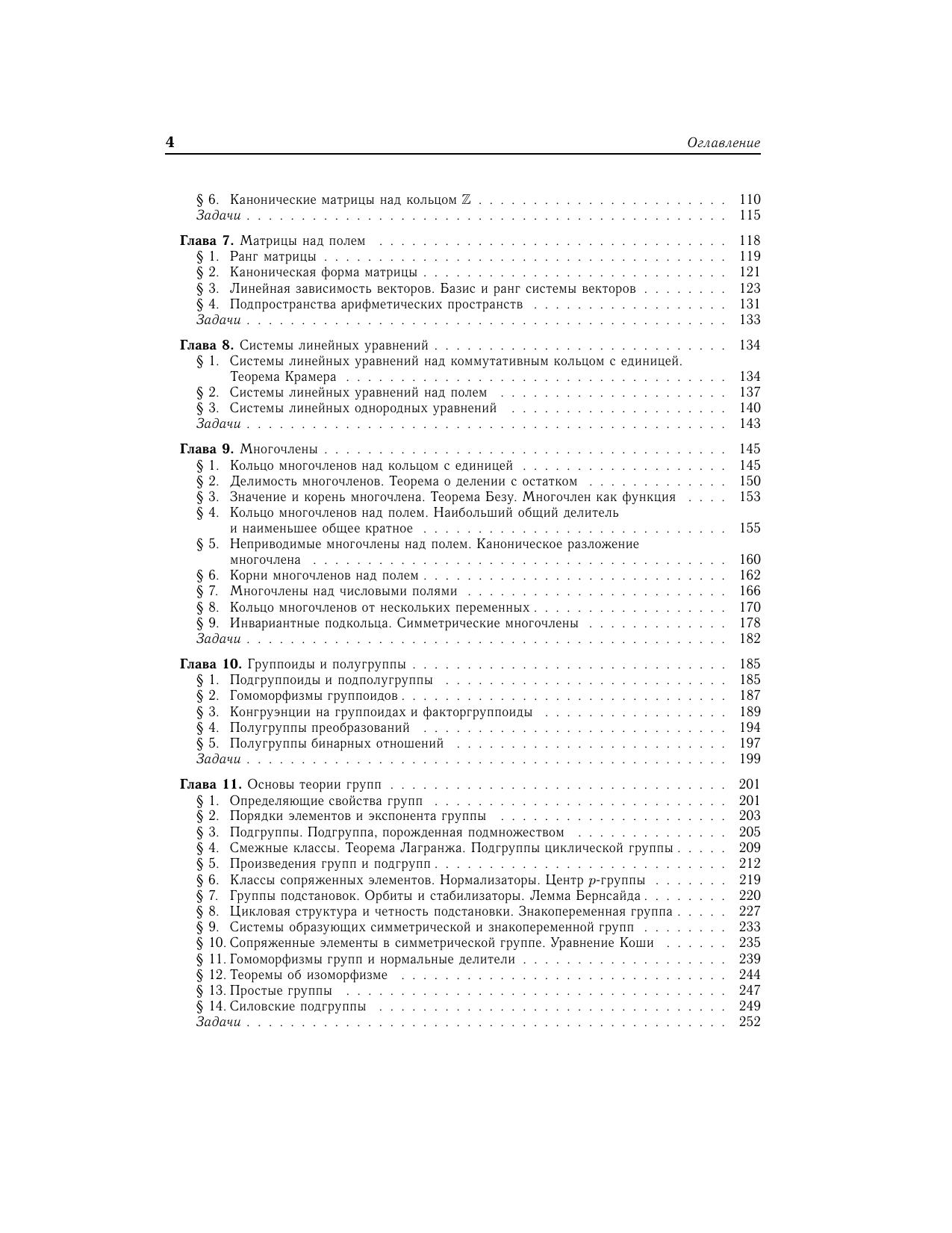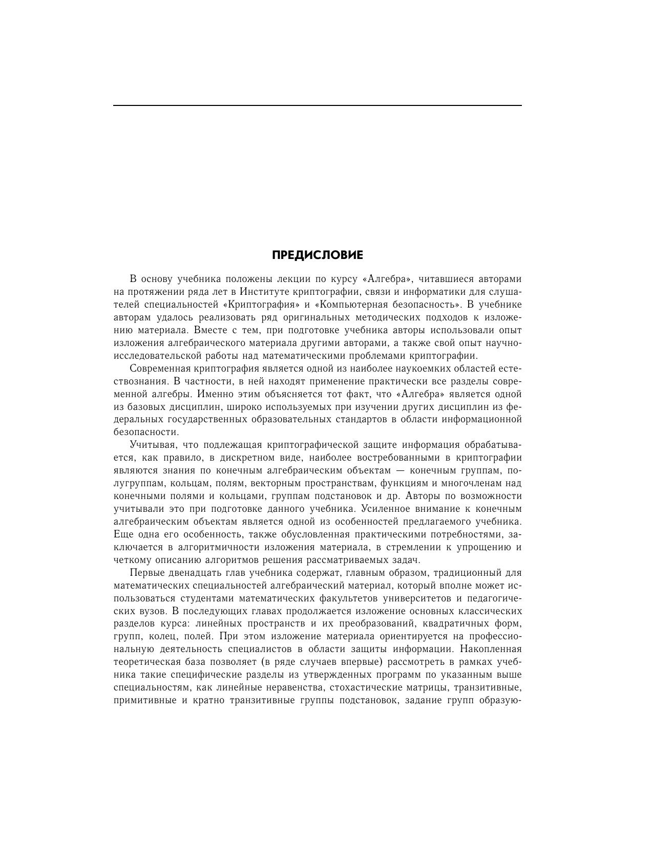 В первой половине учебника излагается материал, содержащий основные понятия и теоремы современной алгебры, который может использоваться студентами, обучающимися по направлениям подготовки и специальностям математического и технического профиля. Последующие главы содержат такие важные для специалистов по защите информации разделы, как теория конечных полей, многочлены над конечными полями, группы подстановок, определяющие соотношения групп, линейные рекуррентные последовательности и др. Содержание учебника полностью соответствует примерным программам учебных дисциплин алгебраического цикла при реализации федеральных государственных образовательных стандартов по направлениям подготовки и специальностям, входящим в укрупненную группу «Информационная безопасность».