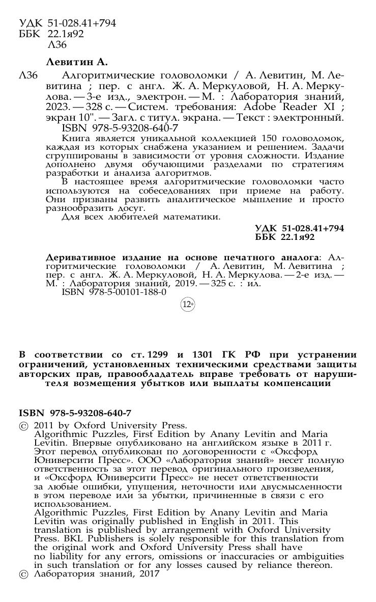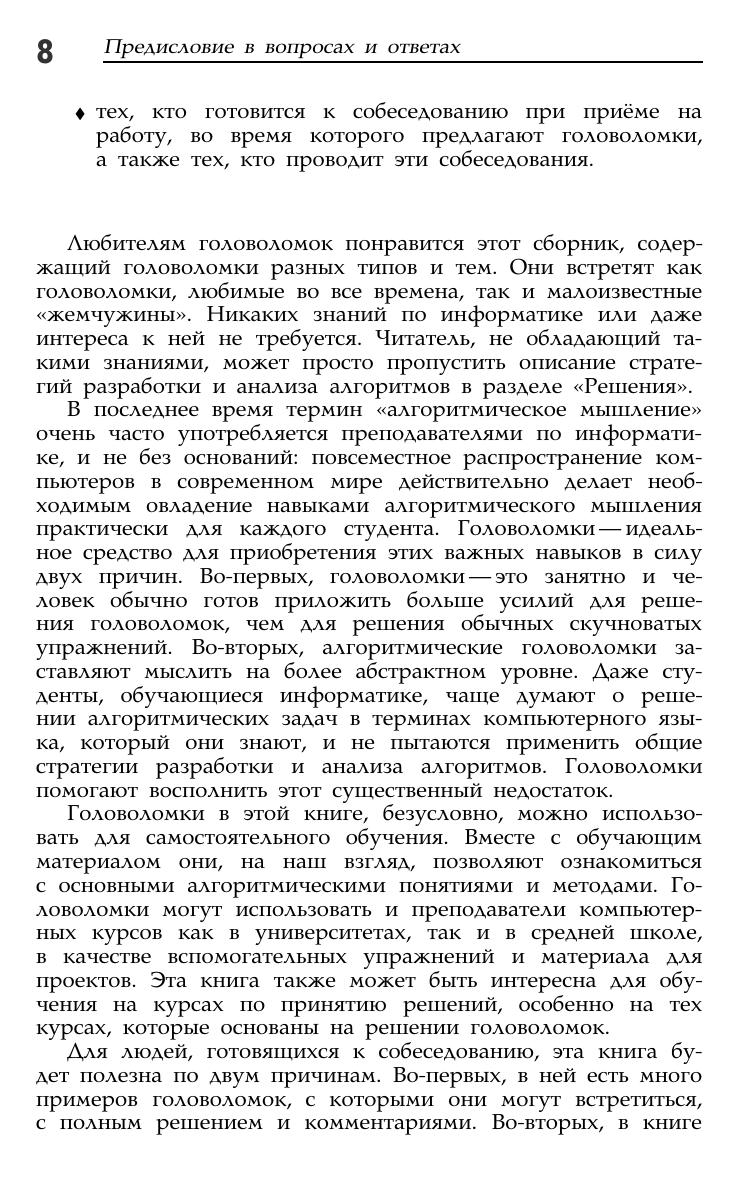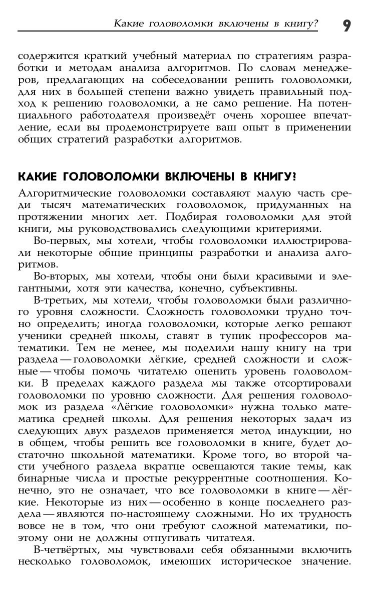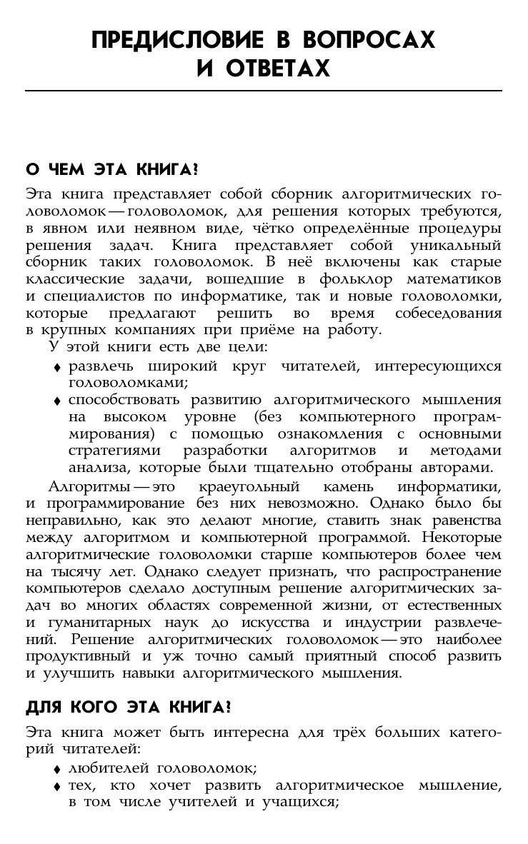 Книга является уникальной коллекцией 150 головоломок, каждая из которых снабжена указанием и решением. Задачи сгруппированы в зависимости от уровня сложности. Издание дополнено двумя обучающими разделами по стратегиям разработки и анализа алгоритмов. В настоящее время алгоритмические головоломки часто используются на собеседованиях при приеме на работу. Они призваны развить аналитическое мышление и просто разнообразить досуг. Для всех любителей математики.