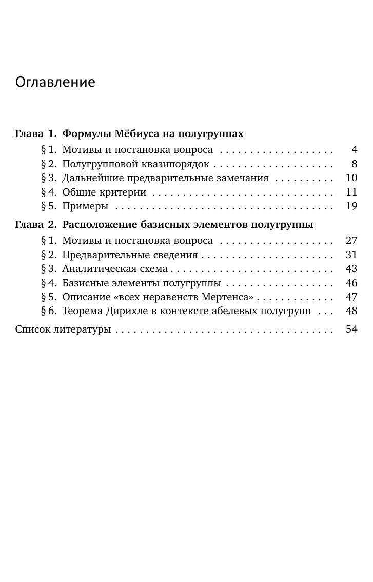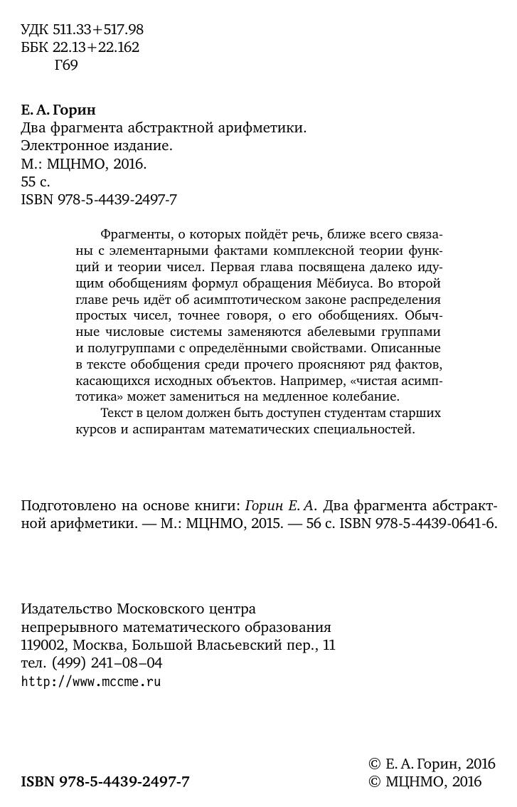 Фрагменты, о которых пойдёт речь, ближе всего связаны с элементарными фактами комплексной теории функций и теории чисел. Первая глава посвящена далеко идущим обобщениям формул обращения Мёбиуса. Во второй главе речь идёт об асимптотическом законе распределения простых чисел, точнее говоря, о его обобщениях. Обычные числовые системы заменяются абелевыми группами и полугруппами с определёнными свойствами. Описанные в тексте обобщения среди прочего проясняют ряд фактов, касающихся исходных объектов. Например, «чистая асимптотика» может замениться на медленное колебание. Текст в целом должен быть доступен студентам старших курсов и аспирантам математических специальностей.
