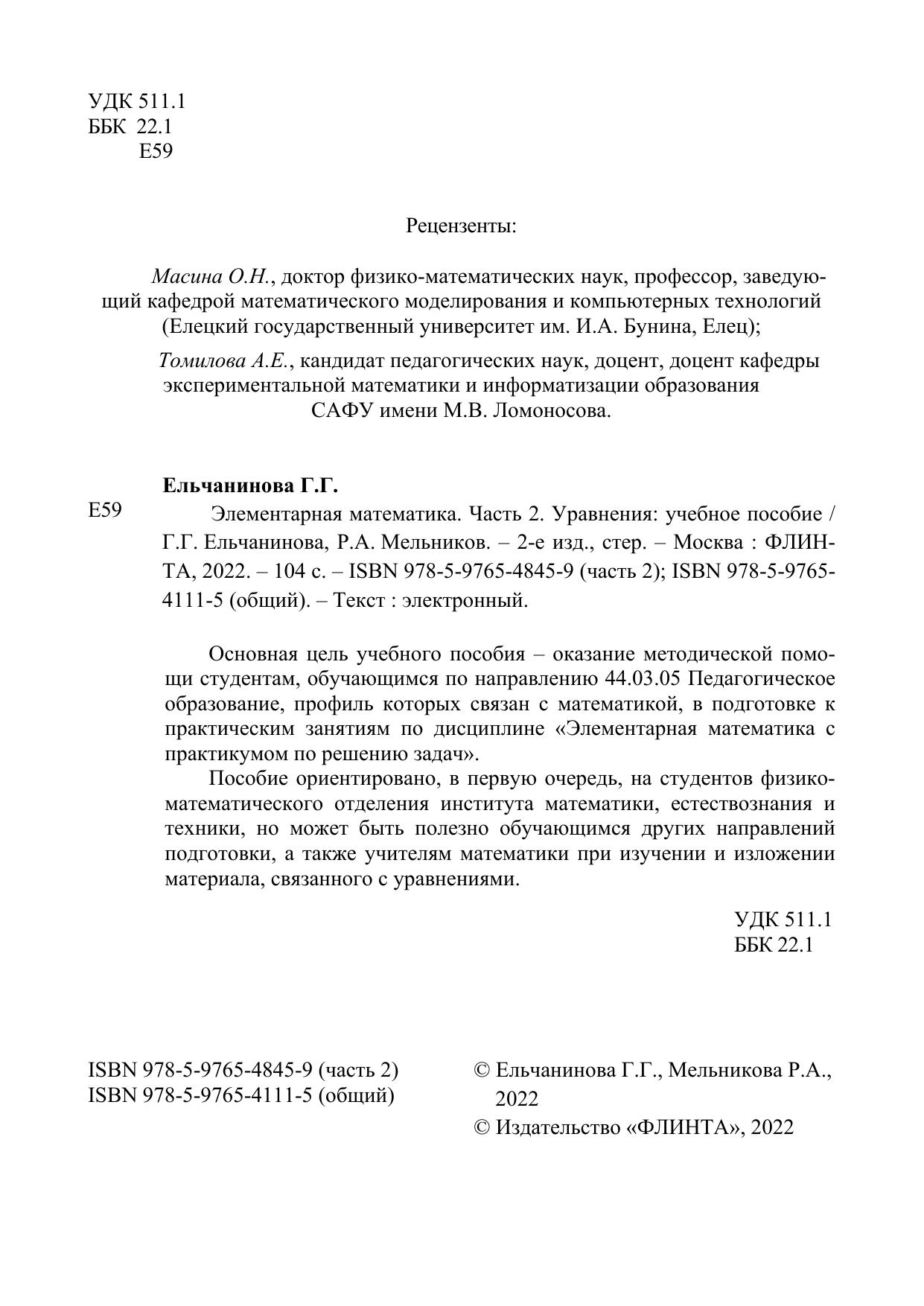 Основная цель учебного пособия – оказание методической помощи студентам, обучающимся по направлению 44.03.05 Педагогическое образование, профиль которых связан с математикой, в подготовке к практическим занятиям по дисциплине «Элементарная математика с практикумом по решению задач».