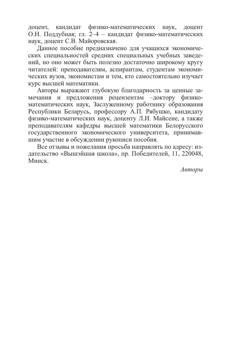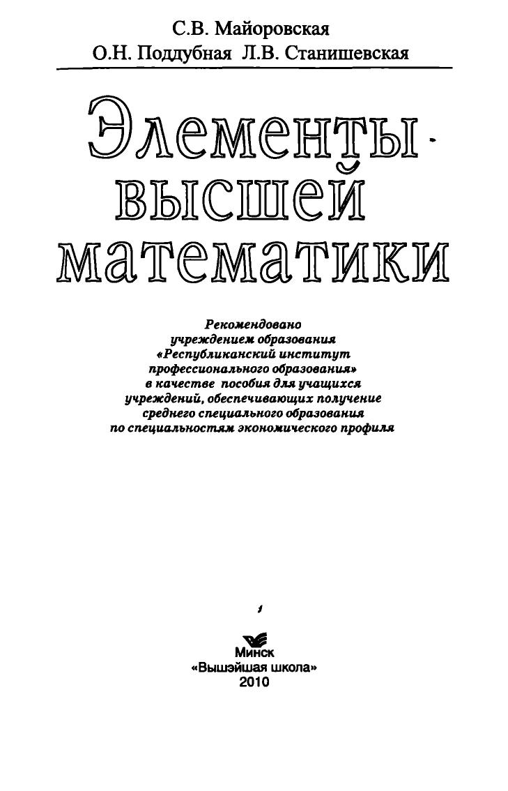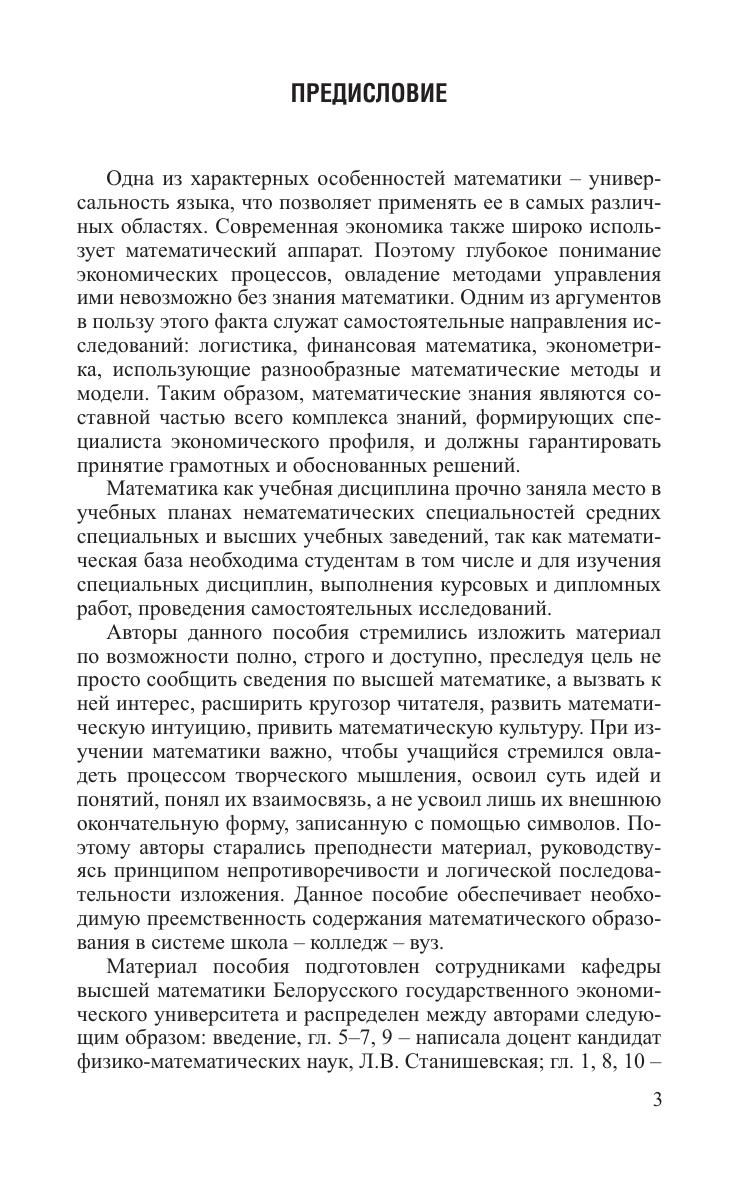 Изложен теоретический материал по основным разделам курса высшей математики. Рассмотрены примеры решения задач, в том числе экономического содержания. Даны упражнения для самостоятельной работы.