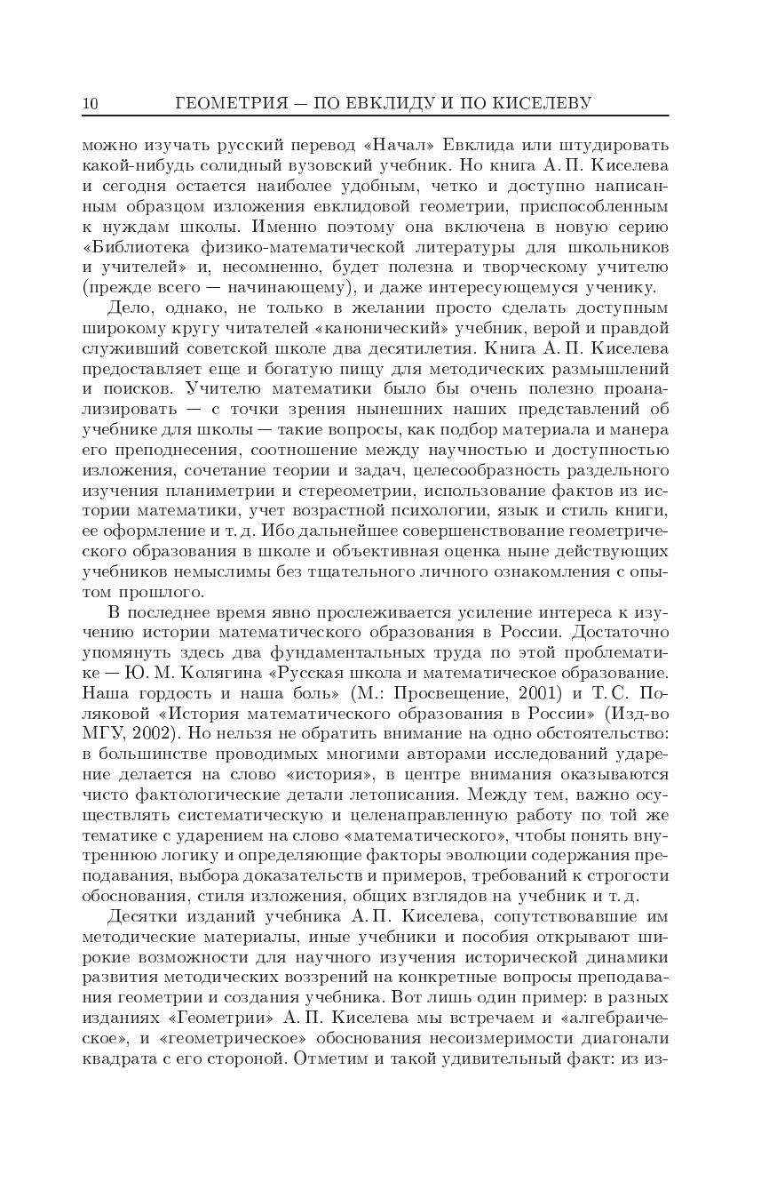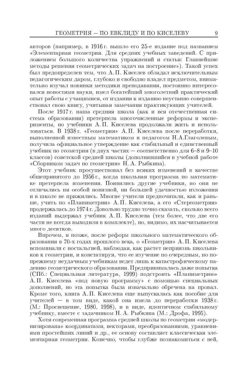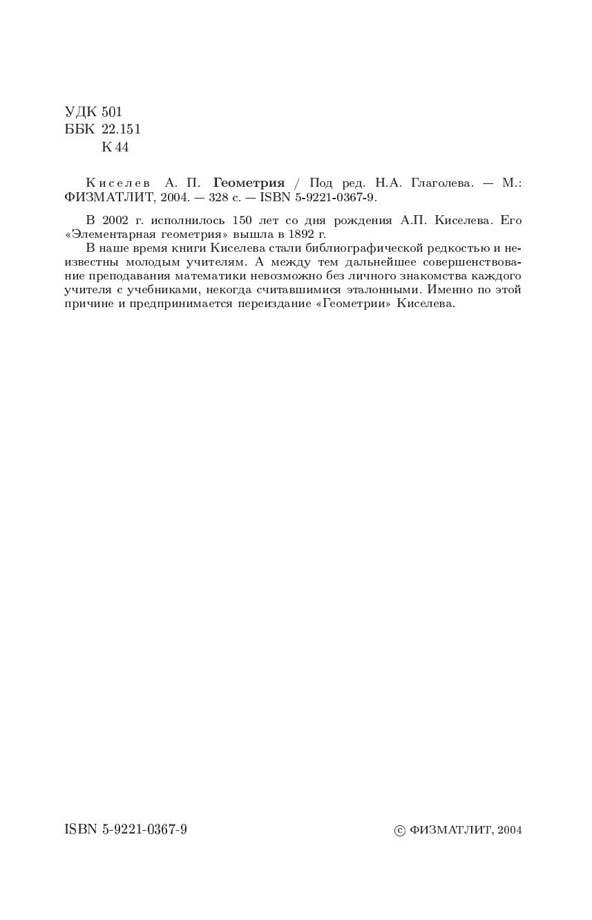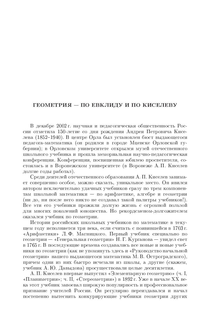 В 2002г. Исполнилось 150 лет со дня рождения А.П.Киселева. Его "Элементарная геометрия" вышел в 1892 г. В наше время книги Киселева стали библиографической редкостью и неизвестны молодым учителям. А между тем дальнейшее совершенствование преподавания математики невозможно без личного знакомства каждого учителя с учебниками, некогда считавшимися эталонными. Именно по этой причине и предпринимается переиздание "Геометрии" Киселева.