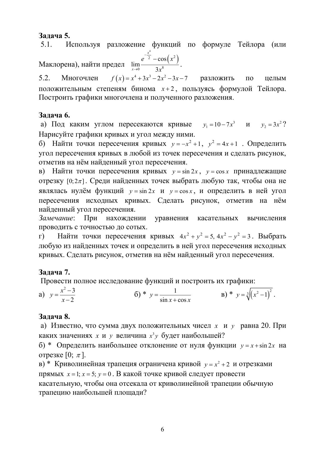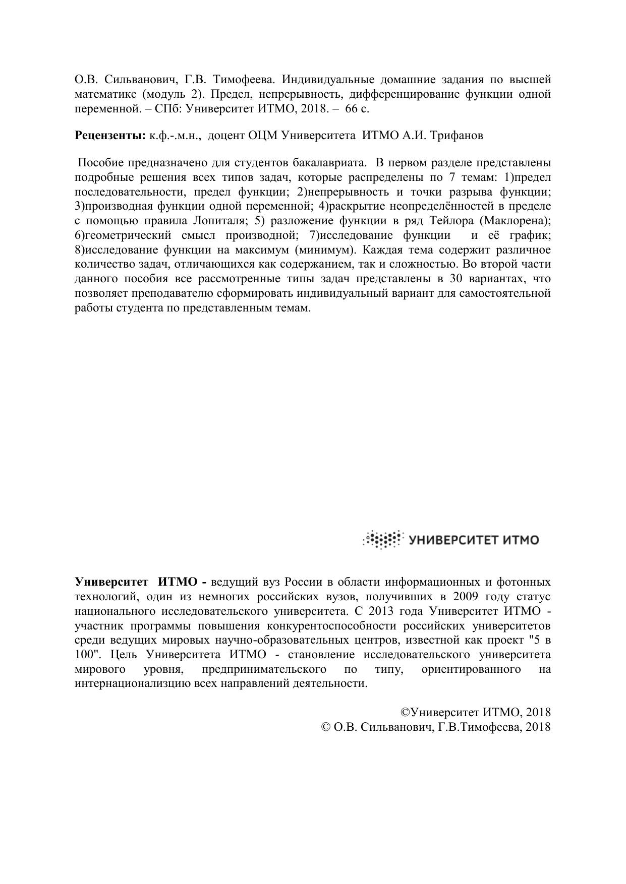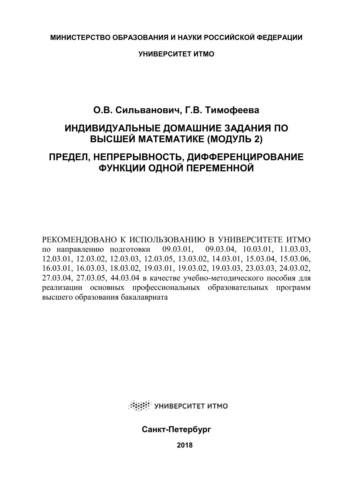 Индивидуальные домашние задания по высшей математике (модуль 2). Предел, непрерывность, дифференцирование функции одной переменной