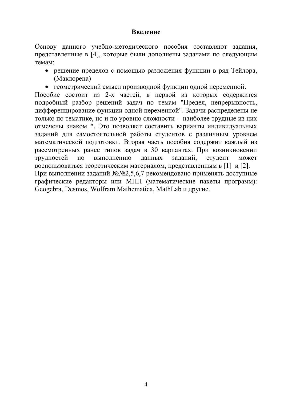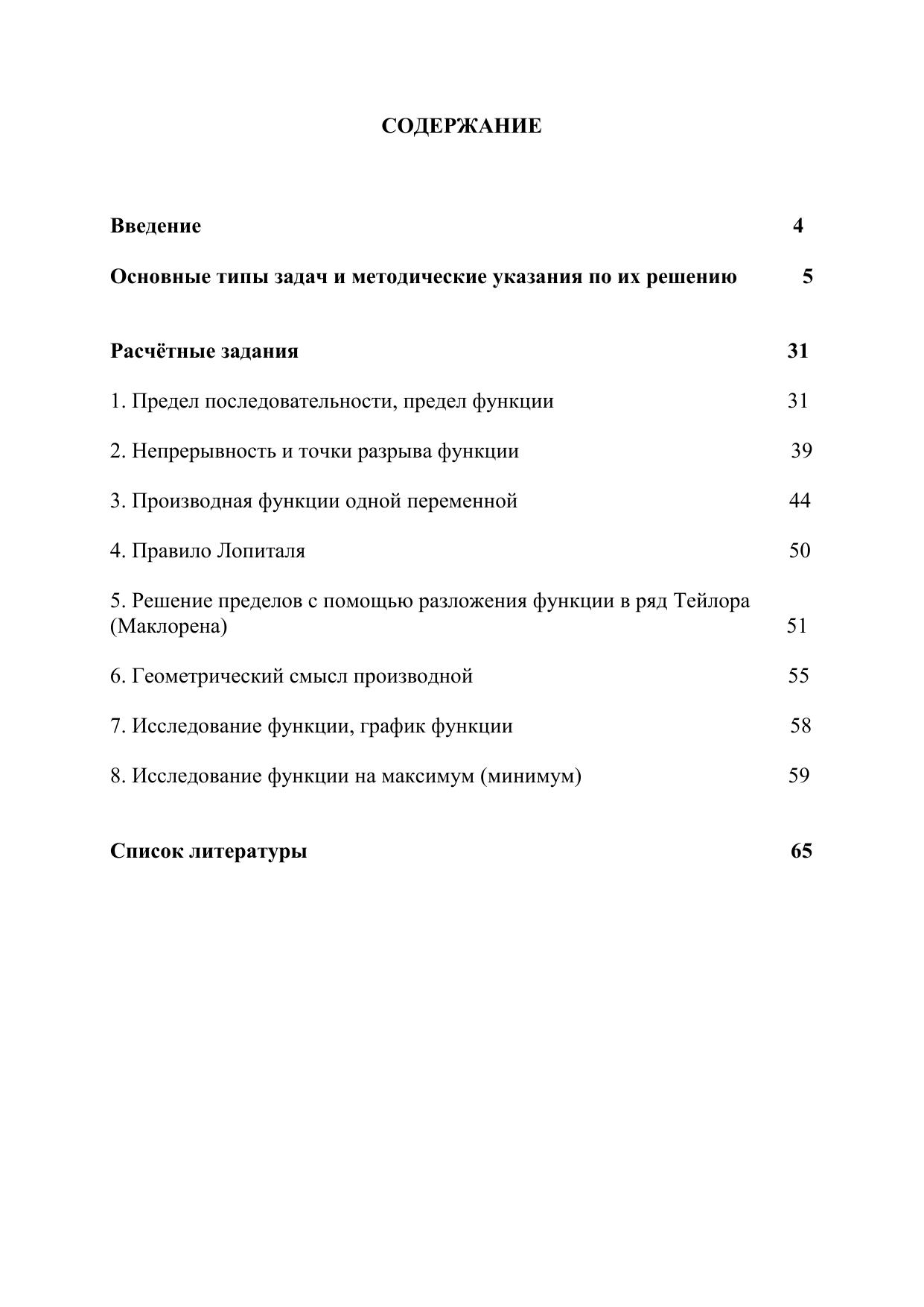 Пособие предназначено для студентов бакалавриата. В первом разделе представлены подробные решения всех типов задач, которые распределены по 7 темам: 1)предел последовательности, предел функции; 2)непрерывность и точки разрыва функции; 3)производная функции одной переменной; 4)раскрытие неопределённостей в пределе с помощью правила Лопиталя; 5) разложение функции в ряд Тейлора (Маклорена); 6)геометрический смысл производной; 7)исследование функции и её график; 8)исследование функции на максимум (минимум). Каждая тема содержит различное количество задач, отличающихся как содержанием, так и сложностью. Во второй части данного пособия все рассмотренные типы задач представлены в 30 вариантах, что позволяет преподавателю сформировать индивидуальный вариант для самостоятельной работы студента по представленным темам.