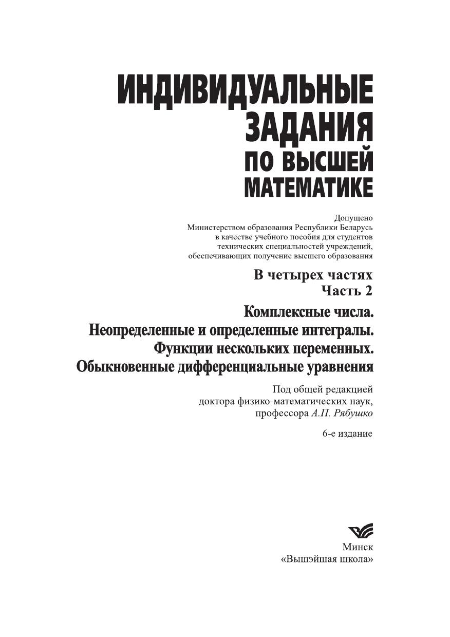Индивидуальные задания по высшей математике. В 4 ч. Ч.2. Комплексные числа. Неопределенные и определенные интегралы. Функции нескольких переменных. Обыкновенные дифференциальные уравнения