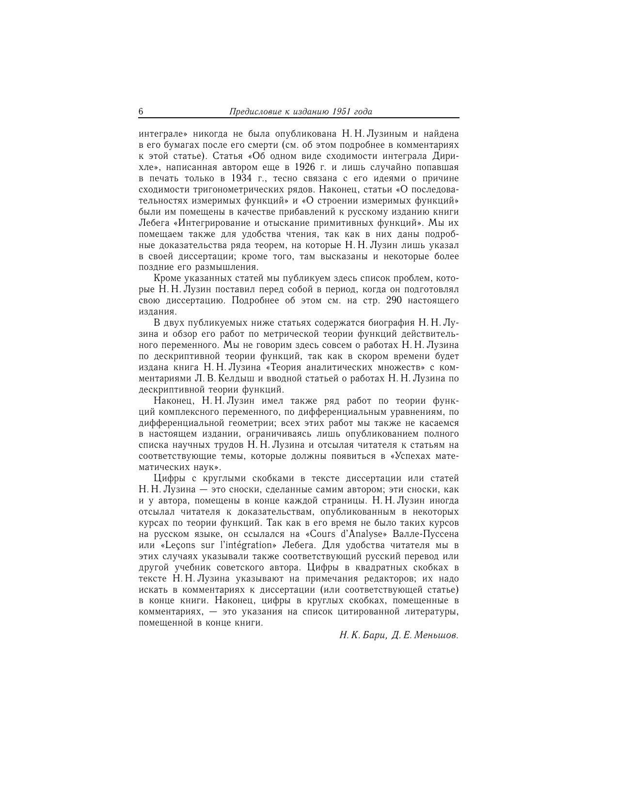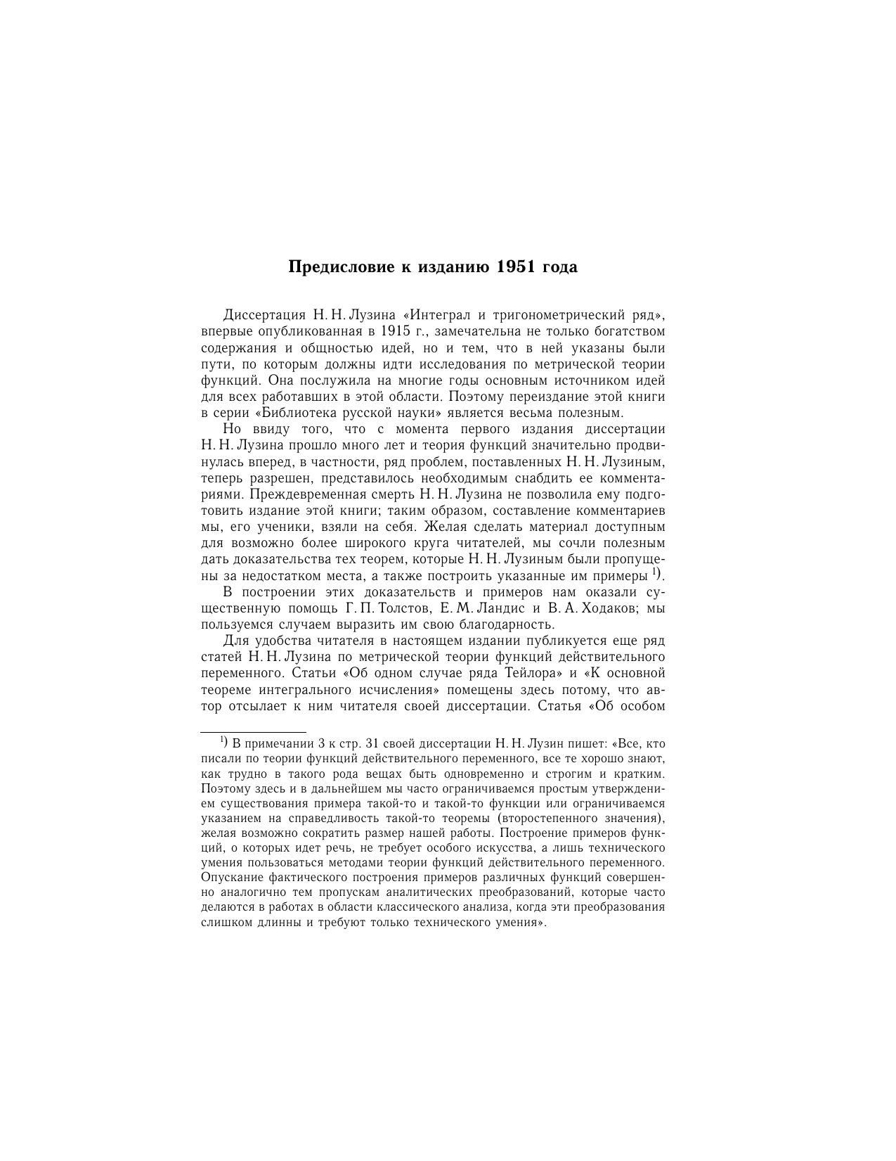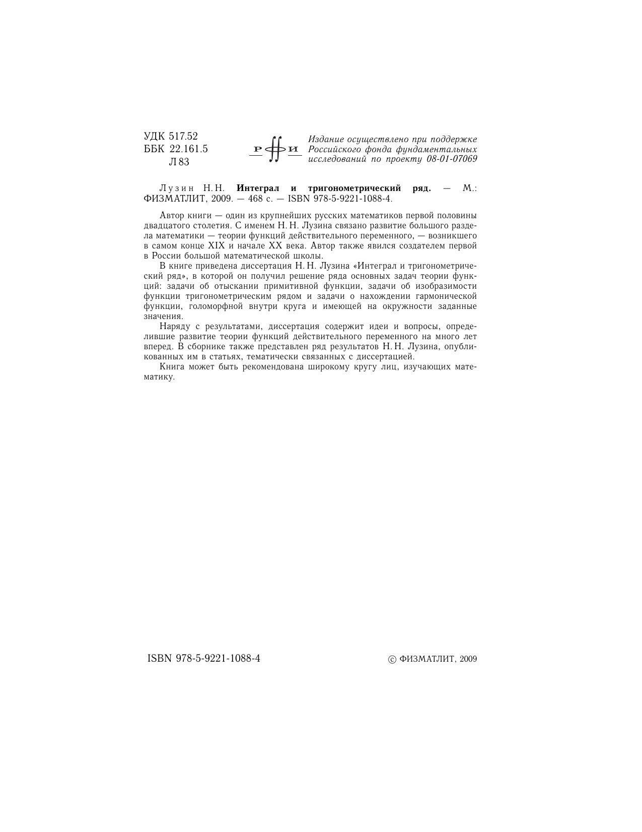 Автор книги - один из крупнейших русских математиков первой половины двадцатого столетия. С именем Н.Н. Лузина связано развитие большого раздела математики - теории функций действительного переменного, - возникшего в самом конце XIX и начале XX века. Автор также явился создателем первой в России большой математической школы. В книге приведена диссертация Н.Н. Лузина «Интеграл и тригонометрический ряд», в которой он получил решение ряда основных задач теории функций: задачи об отыскании примитивной функции, задачи об изобразимости функции тригонометрическим рядом и задачи о нахождении гармонической функции, голоморфной внутри круга и имеющей на окружности заданные значения. Наряду с результатами, диссертация содержит идеи и вопросы, определившие развитие теории функций действительного переменного на много лет вперед. В сборнике также представлен ряд результатов Н.Н. Лузина, опубликованных им в статьях, тематически связанных с диссертацией. Книга может быть рекомендована широкому кругу лиц, изучающих математику.