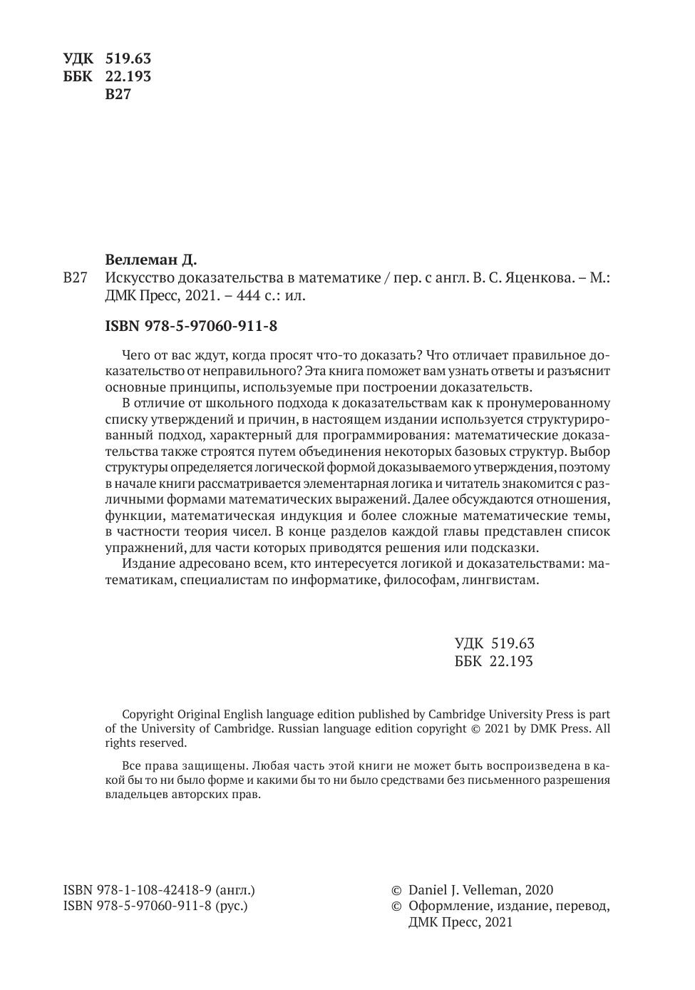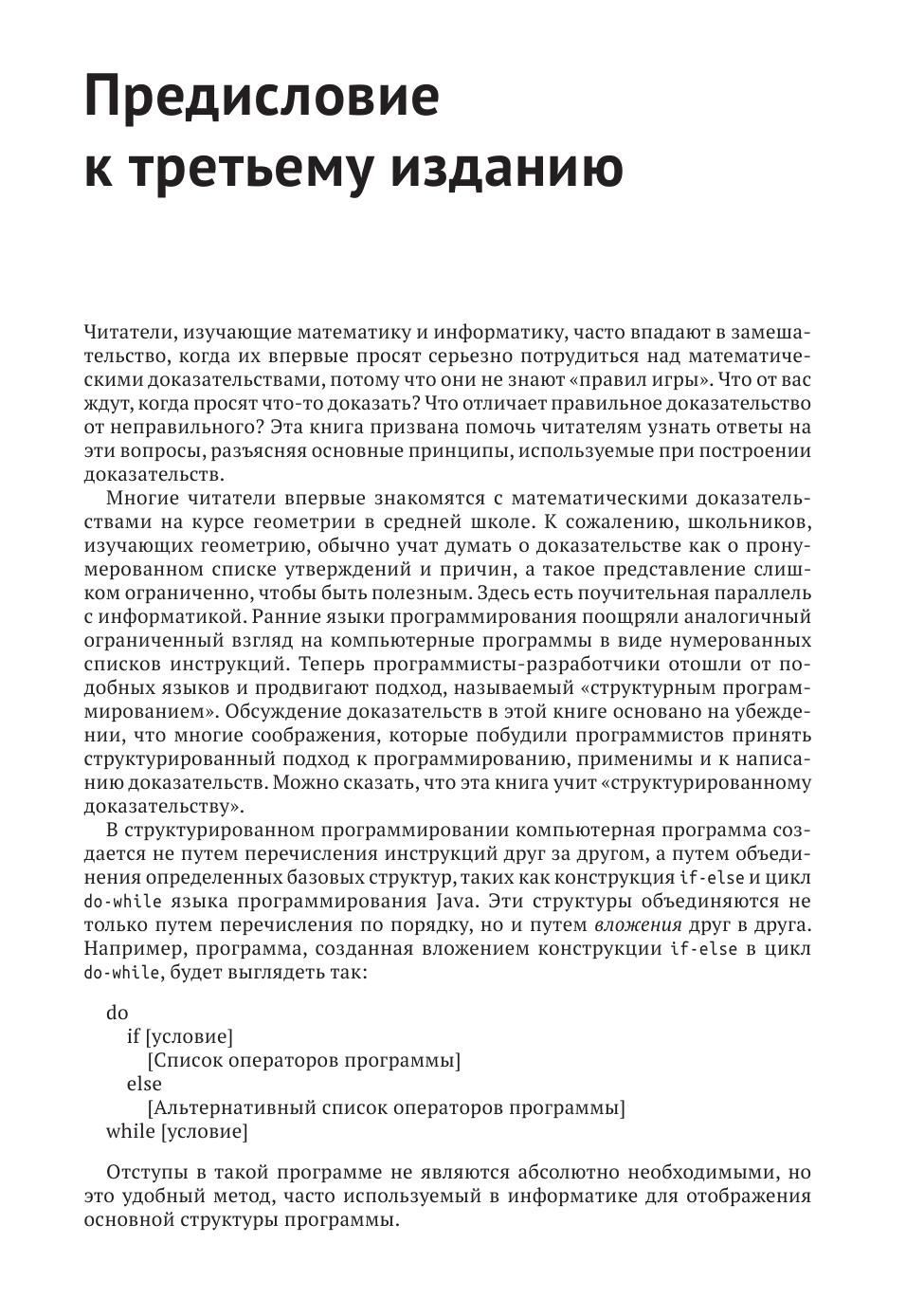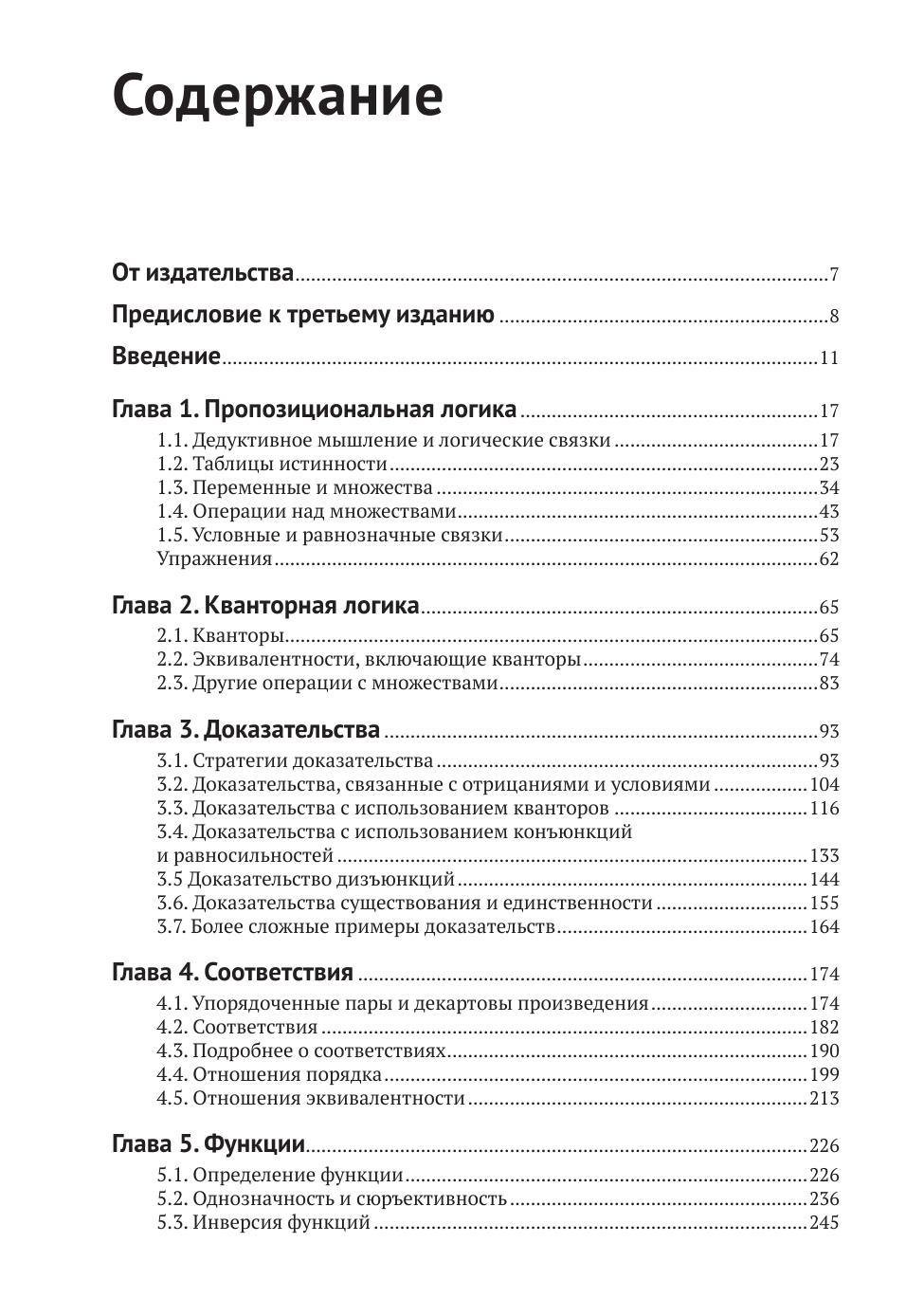 Доказательства играют центральную роль в высшей математике и теоретической информатике, однако многие студенты испытывают трудности при изучении предметов, которые в значительной степени основаны на доказательствах. Третье издание этого бестселлера помогает студентам перейти от механического решения задач к осмысленному доказательству теорем, обучая их приемам, необходимым для чтения и написания доказательств. Это расширенное издание, включающее более 150 новых упражнений и новую главу по теории чисел, знакомит учащихся с миром высшей математики через мастерство доказательства. Книга начинается с основ-ных понятий логики и теории множеств, на примере которых учащихся знакомятся с языком математики и его интерпретацией. Эти концепции заложены в основу методов, которые впоследствии применяются для сложных умозаключений, включая подробные пошаговые описания стратегий построения доказательств теорий о свойствах чисел, множеств, отношений и функций.