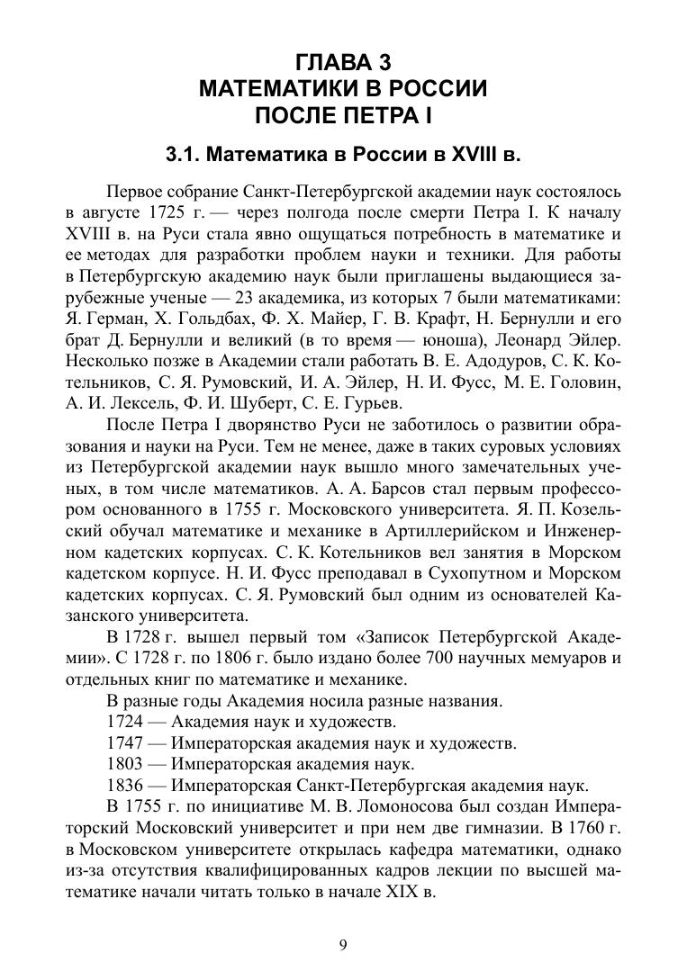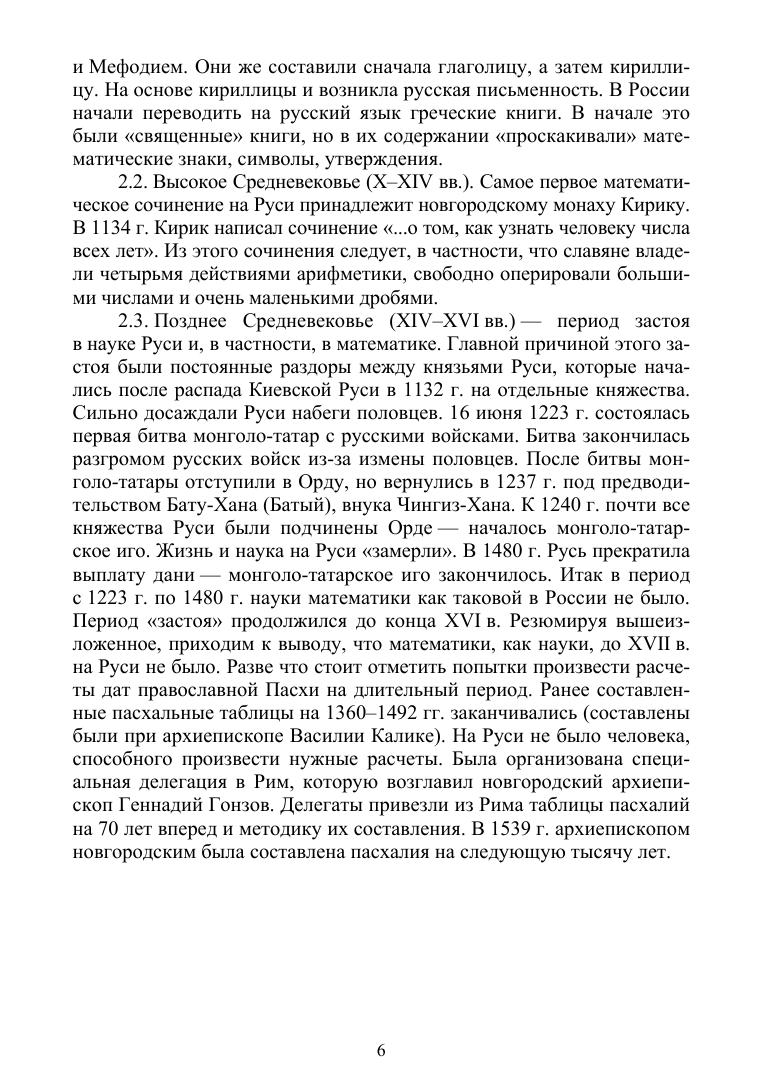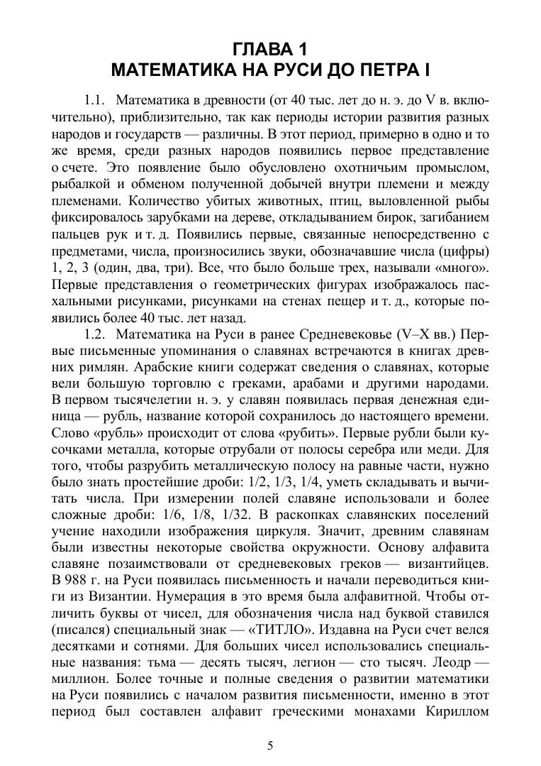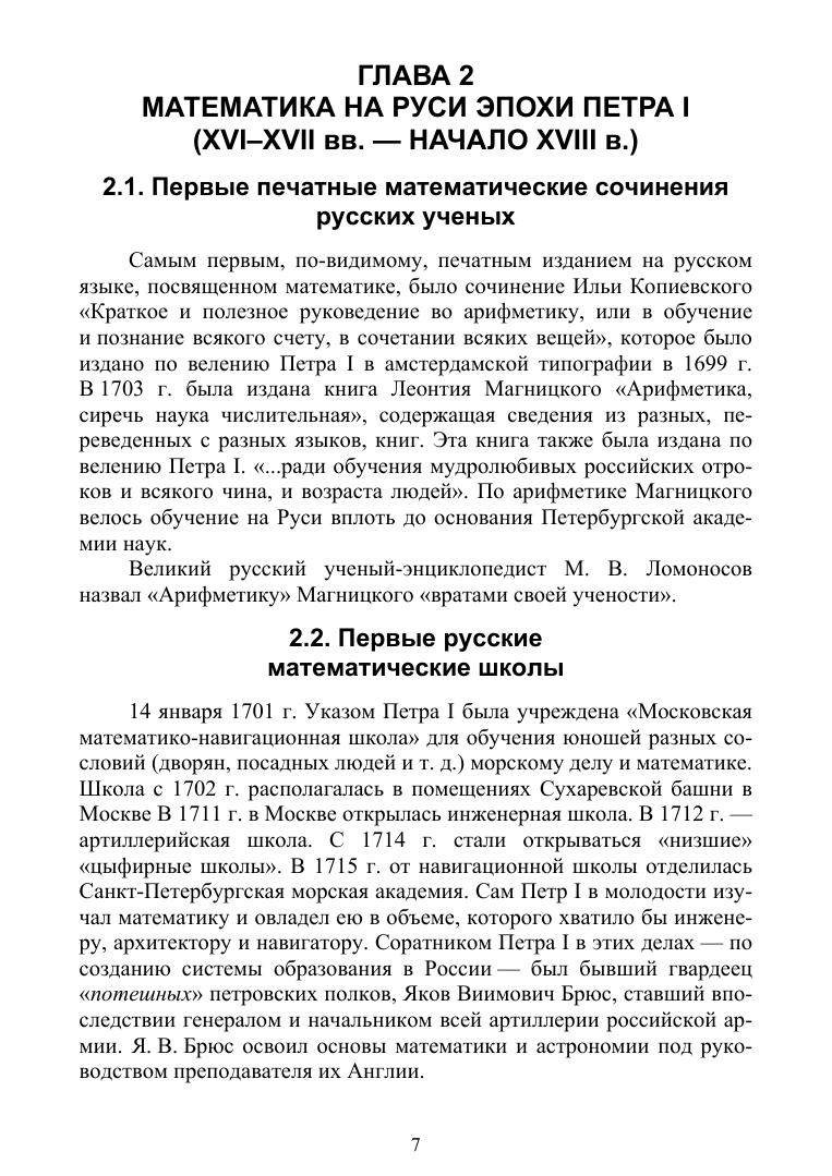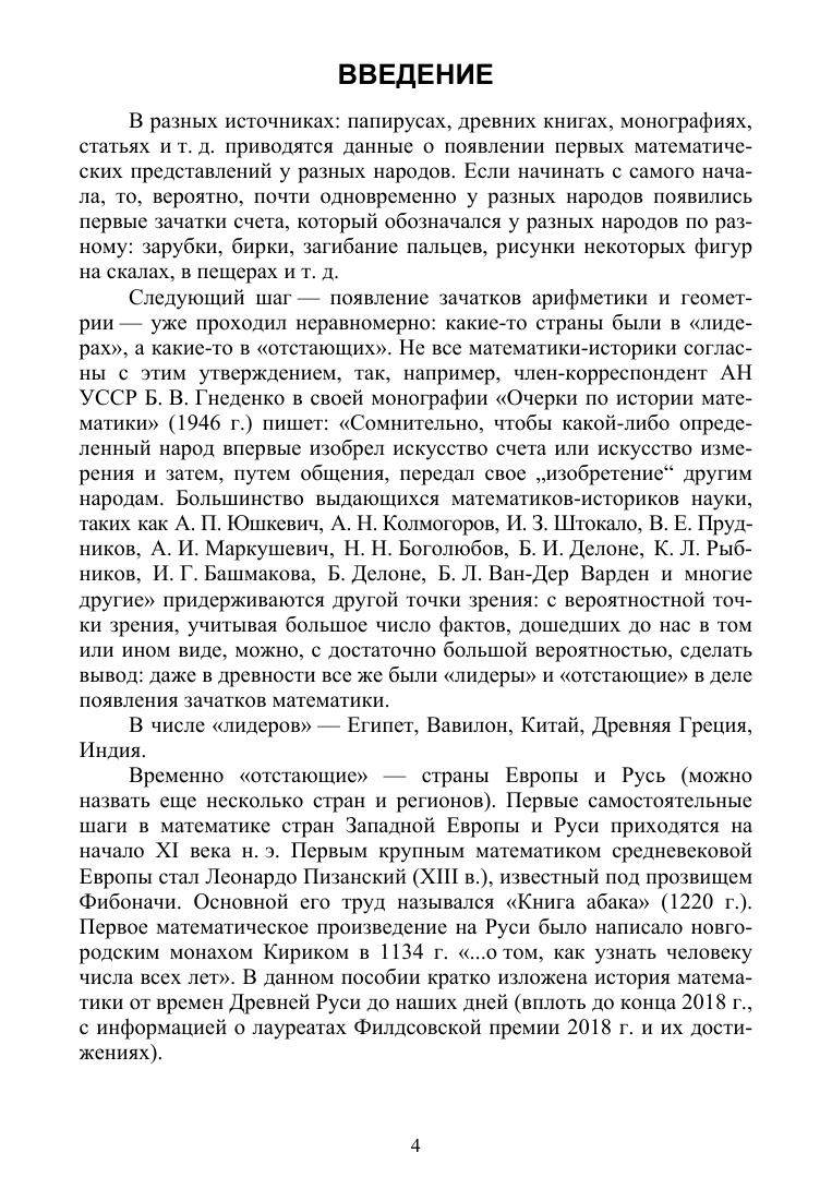 В данном пособии содержится обширный исторический материал, посвященный возникновению развитию математики от древнейших времен до наших дней, приведены все основные достижения в математике в разных странах мира, даны краткие сведения о великих математиках, сделавших выдающиеся открытия как в математике, так и в ее приложениях. Подробно изложена история становления и развития математики в Древней Руси, России до Петра Первого, в эпоху Петра Первого и в послепетровскую эпоху до наших дней.