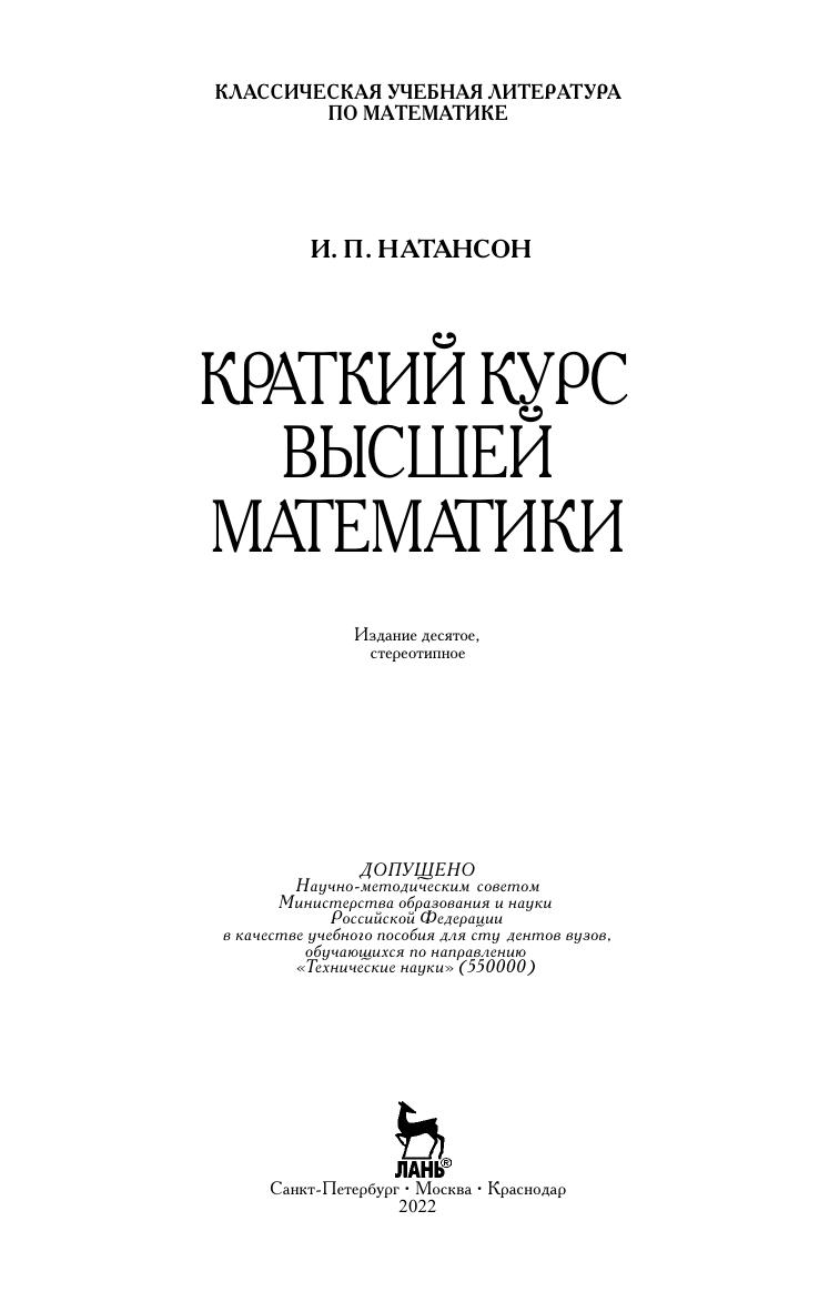 Книга выдающегося педагога и ученого проф. И. П. Натансона «Краткий курс высшей математики» содержит разделы, посвященные аналитической геометрии, математическому анализу, кратко описываются обыкновенные дифференциальные уравнения. Учебное пособие предназначено для студентов вузов, обучающихся по техническим специальностям.