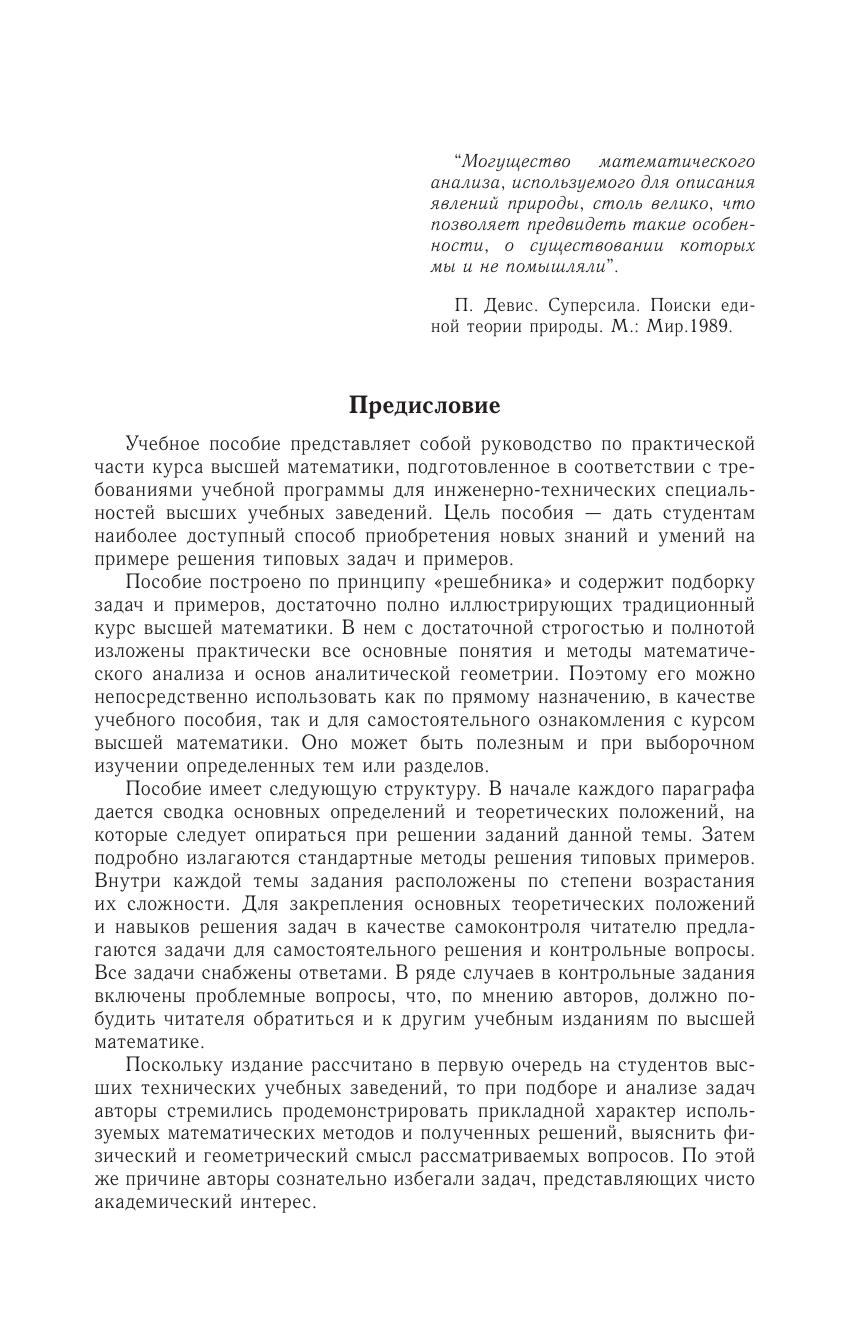 Пособие соответствует программе курса высшей математики для студентов инженерно-технических специальностей и представляет собой достаточно полное и доступное руководство к решению задач и примеров традиционного курса высшей математики. Пособие построено по принципу проведения практических занятий - каждый параграф соответствует определенной теме и включает краткую сводку основных теоретических положений, большое число детально решенных типовых задач и примеров, определенное количество здач и примеров для самостоятельной работы и контрольные вопросы, которые предпологают глубокое понимание теоретического материала.