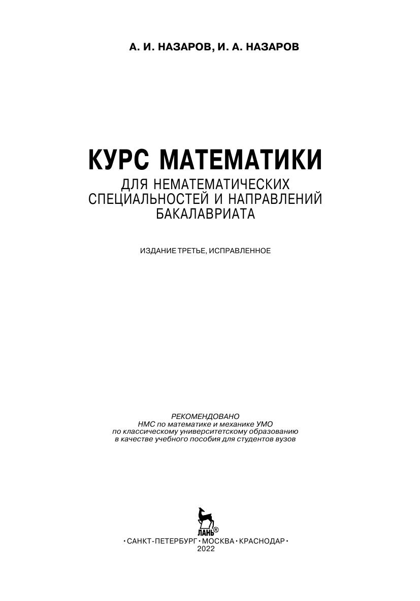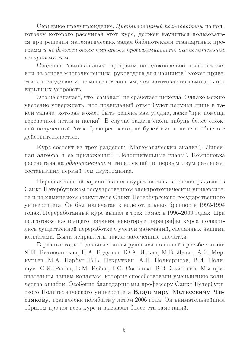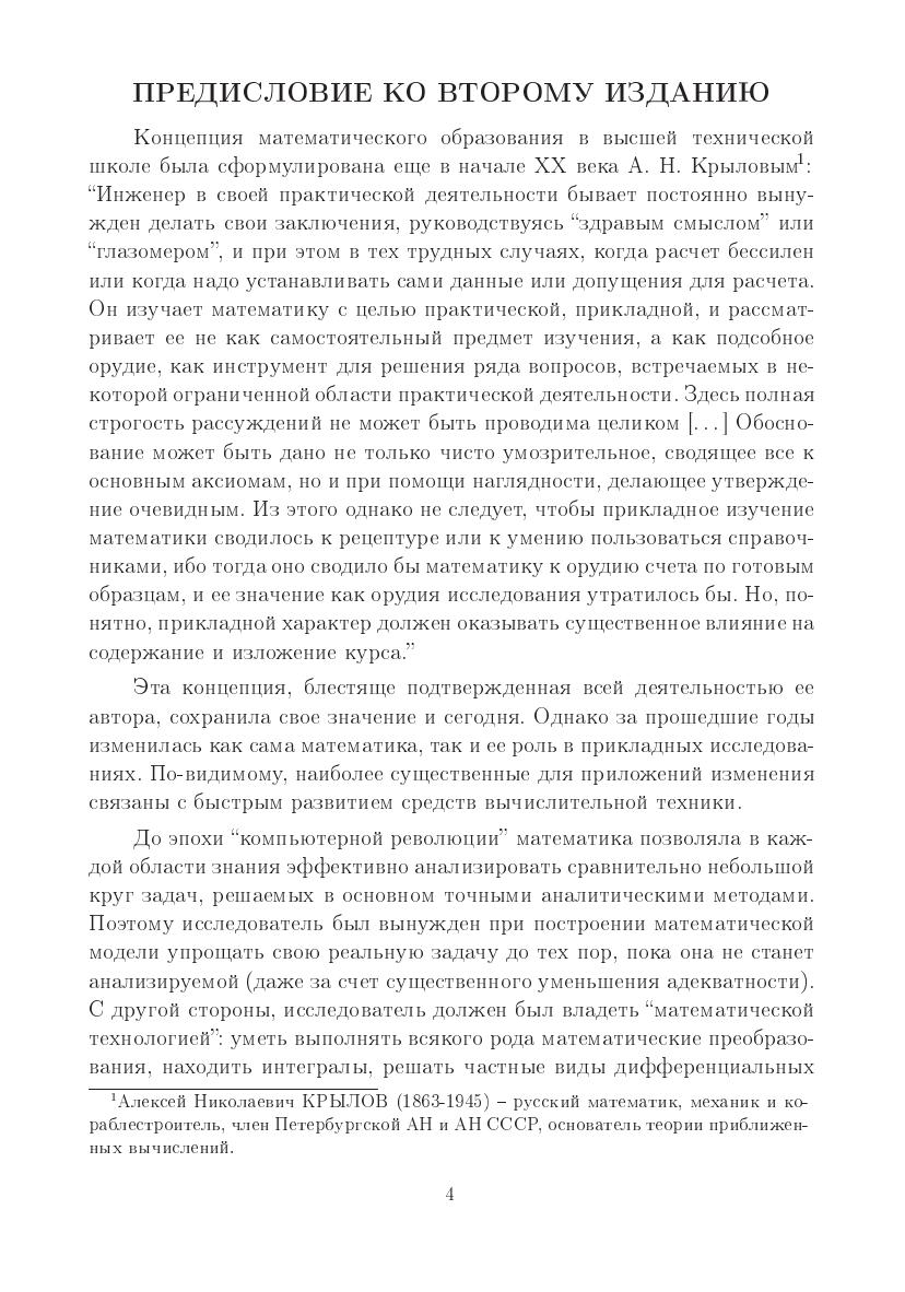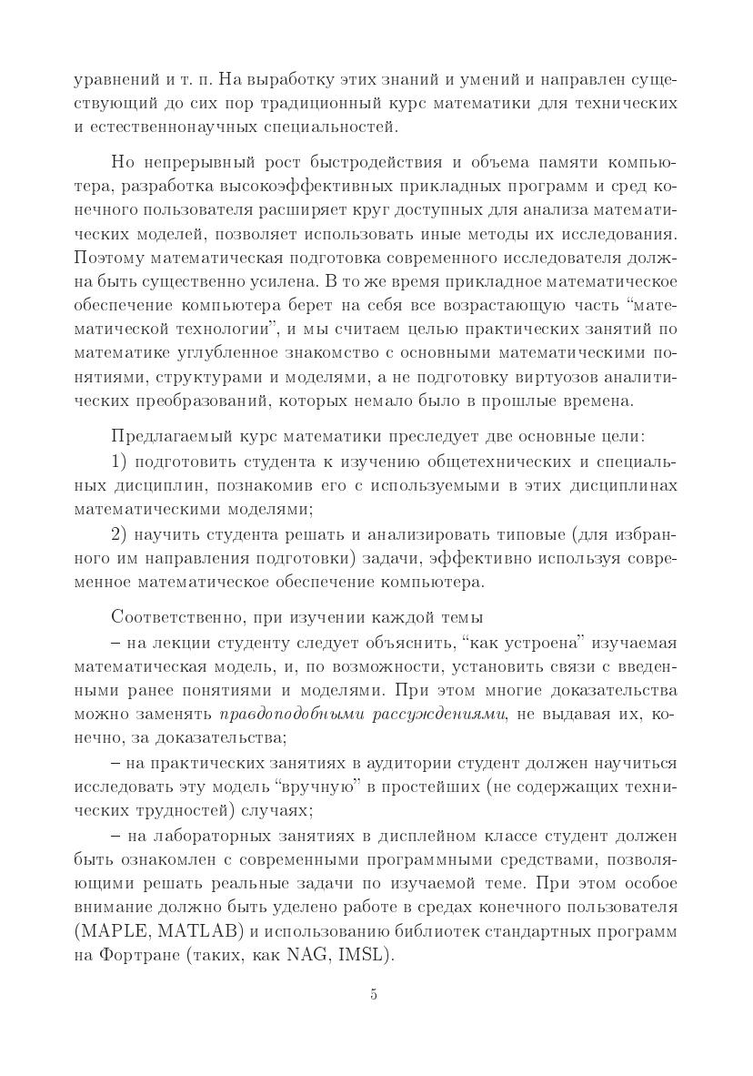 Курс ориентирован на студентов технических и естественно-научных специальностей и направлений бакалавриата, для которых математика будет не областью профессиональной деятельности, а средством для решения практических задач. Раздел «Математический анализ» содержит дифференциальное и интегральное исчисление функций одной и многих переменных. Особенность изложения материала — раннее введение степенных рядов и построение дифференциального исчисления на их основе, а также активное использование сплайнов, которые находят все большее применение в содержательных науках. Раздел «Линейная алгебра и ее приложения» охватывает как стандартные (системы линейных уравнений, матричная алгебра, элементы теории линейных пространств и линейных операторов), так и мало освещенные в учебной литературе главы линейной алгебры — метод наименьших квадратов, элементы линейного программирования и анализ погрешностей решения линейных систем. Компоновка курса рассчитана на одновременное чтение лекций по этим разделам. Раздел «Дополнительные главы» разделен на три части: «Разностные и обыкновенные дифференциальные уравнения. Задача Коши», «Математическая физика», «Теория вероятностей и математическая статистика». В приложении описаны простейшие свойства «машинных чисел».