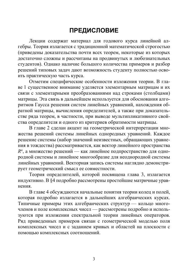 Лекции являются учебным пособием по линейной алгебре, возникшем в результате обработки, расширения и углубления курса лекций, читаемым автором в течение ряда лет для студентов МИЭМ НИУ ВШЭ, обучающихся по программе Компьютерная безопасность. Изложение материала базируется на нескольких методических принципах. Во первых, это традиция преподавания линейной алгебре на кафедре Алгебры и Анализа (затем на кафедре Алгебры и Логики) МИЭМ. Автор не может не выразить благодарность своим коллегам, внесшим свой вклад в формирование этой традиции. Речь идет о сочетании математической строгости изложения теории с алгоритмизацией процесса решения различных алгебраических задач, что позволяет большинству студентов успешно справляться с практическими заданиями. Вторым, не менее важным методическим принципом курса является взгляд на линейную алгебру как на многомерную геометрию. Это позволяет использовать геометрическую интуицию и трехмерные геометрические модели для демонстрации наглядного смысла как абстрактных алгебраических понятий, так и доказательств различных теорем. В курсе приводится решение многочисленных примеров, аналоги которых традиционно разбираются на семинарах.