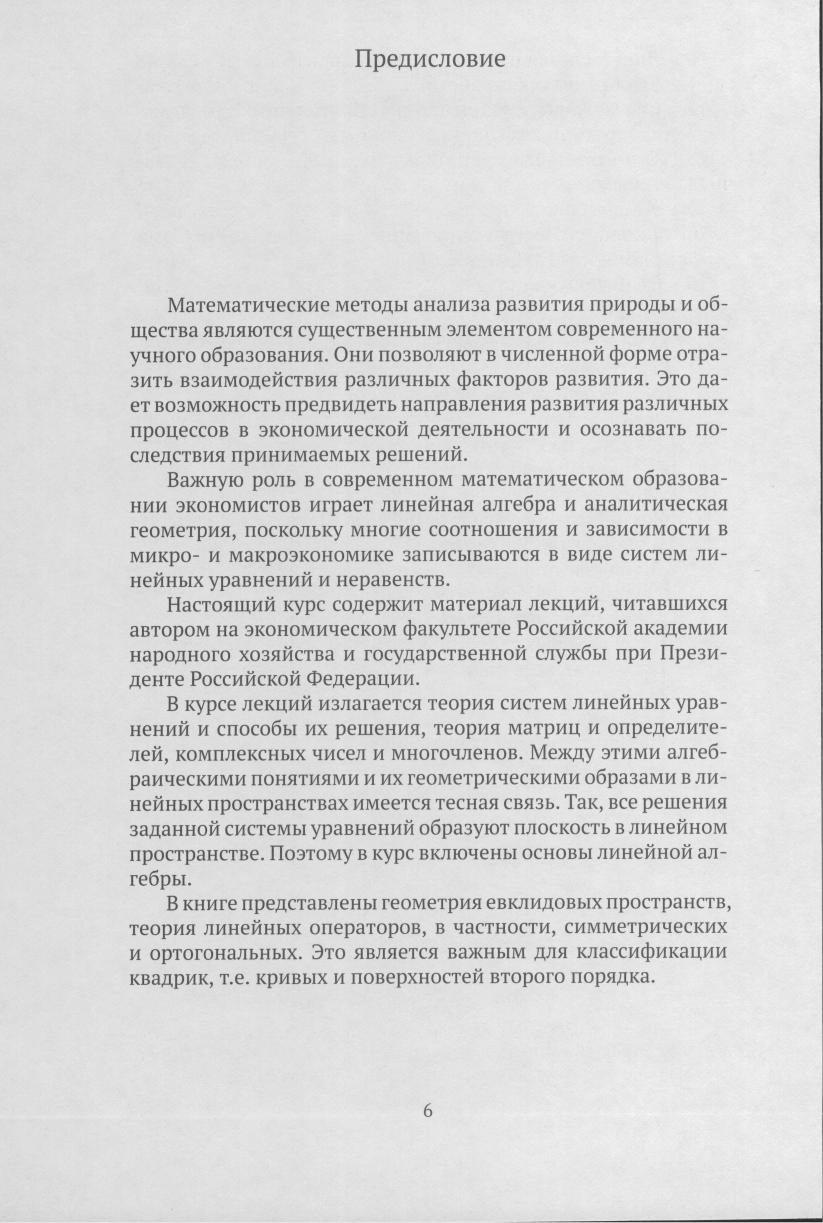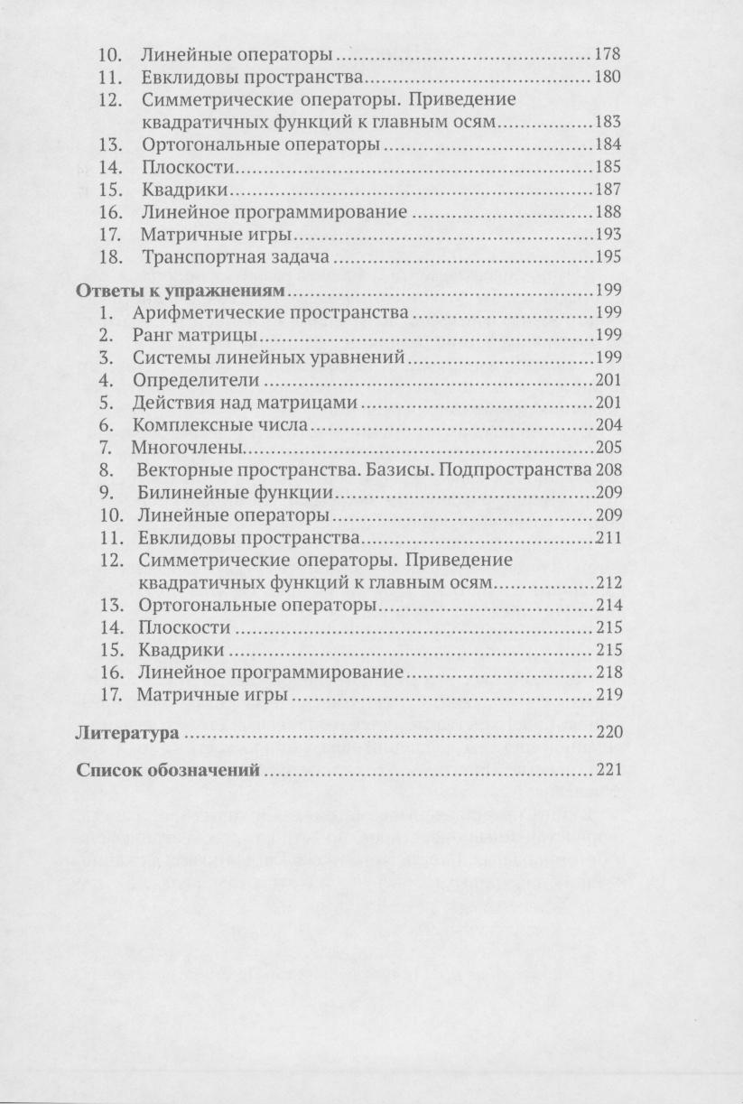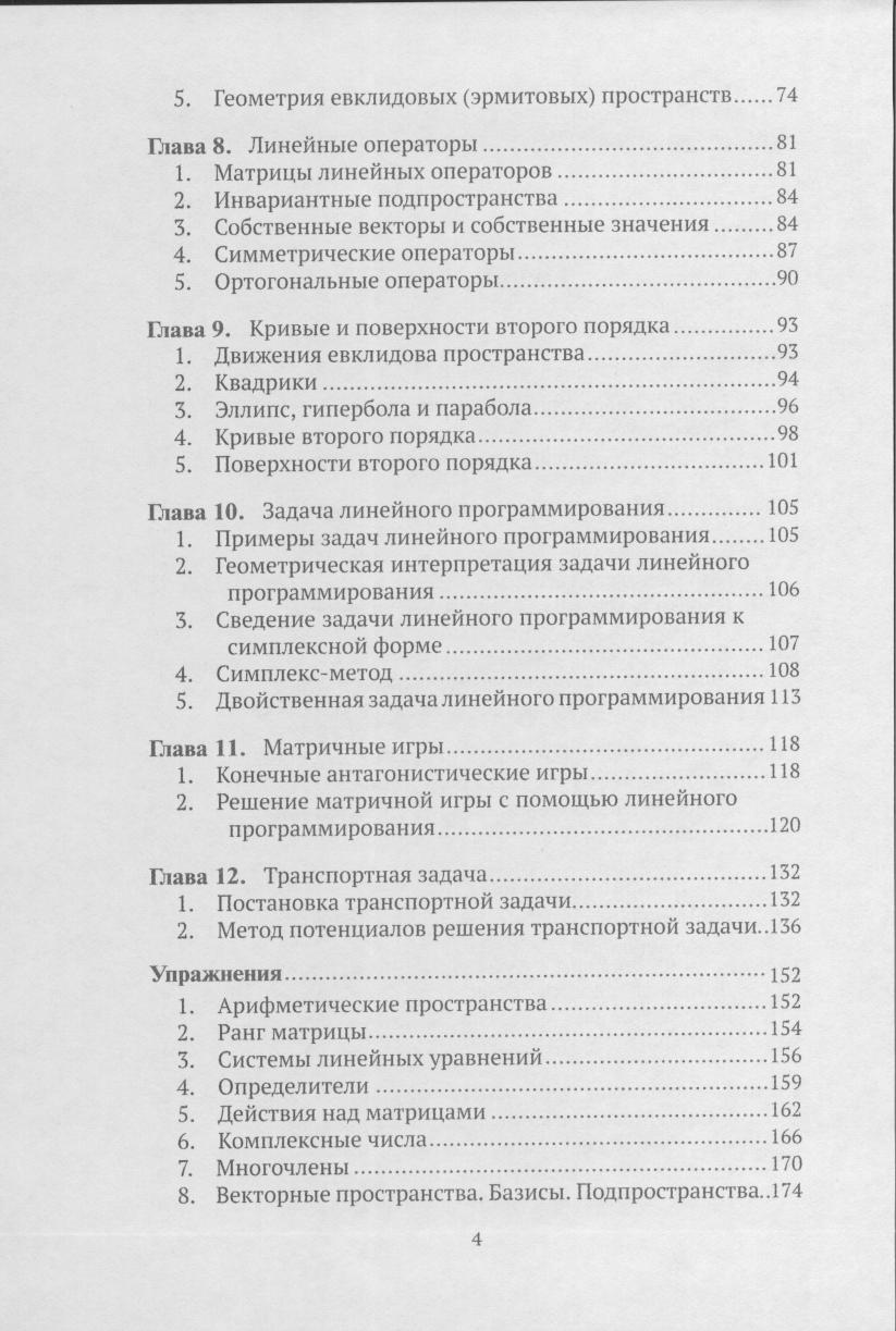 Излагается теория систем линейных уравнений и способы их решения, теория матриц и определителей, комплексных чисел и многочленов, рассматривается линейное пространство. Освещаются геометрия евклидовых пространств и теория линейных операторов. Дается классификация кривых и поверхностей второго порядка. Рассматриваются линейное программирование и теория конечных антагонистических игр, а также симплекс-метод и метод решения транспортной задачи. В качестве примера одного из алгоритмов решения оптимизации на графах дается решение задачи о распределении кредита.