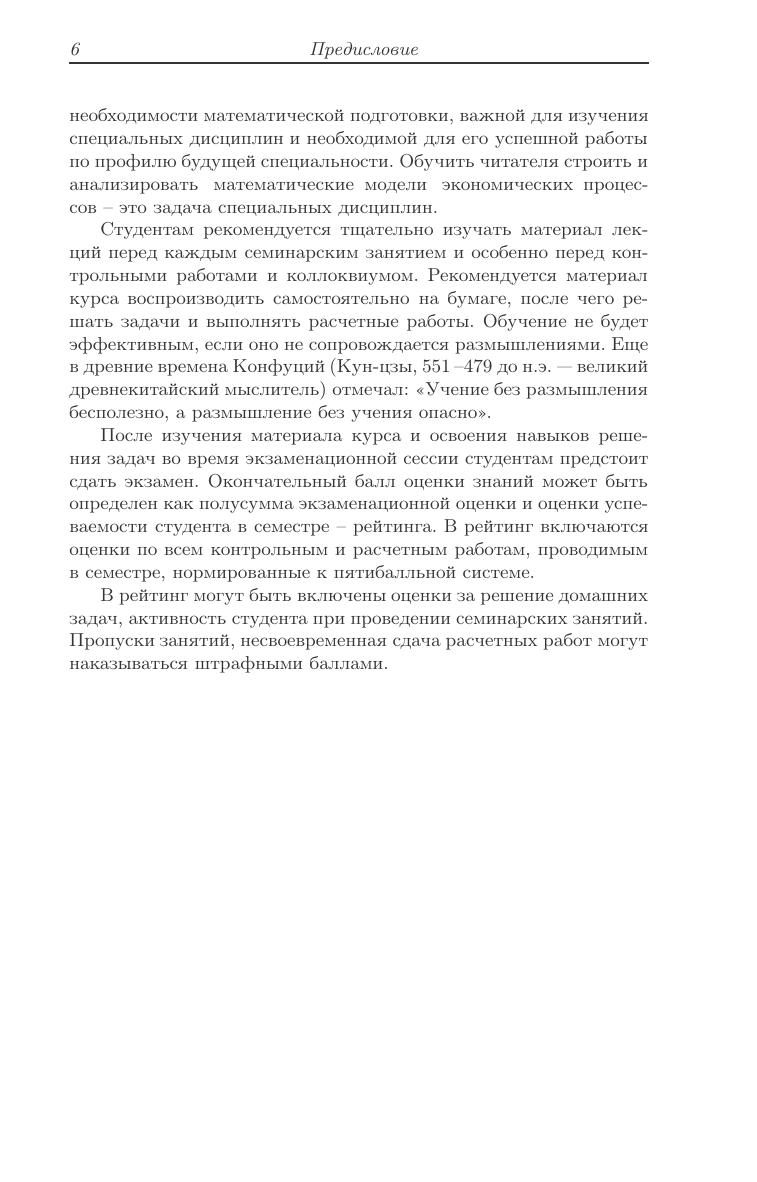 Учебник соответствует Государственному образовательному стандарту высшего профессионального образования для подготовки бакалавров и специалистов по программам математических дисциплин направления «Науки об обществе». Изложение материала сопровождается примерами решения экономических задач. Методики решения задач приведены в разработках семинарских занятий. Даны условия задач для самостоятельного решения и задания для выполнения расчетных работ. Приведены вопросы, в том числе в виде тестов, для самопроверки усвоения материала, а также типовые контрольные работы для проверки глубины усвоения теоретического материала и проверки навыков решения задач.