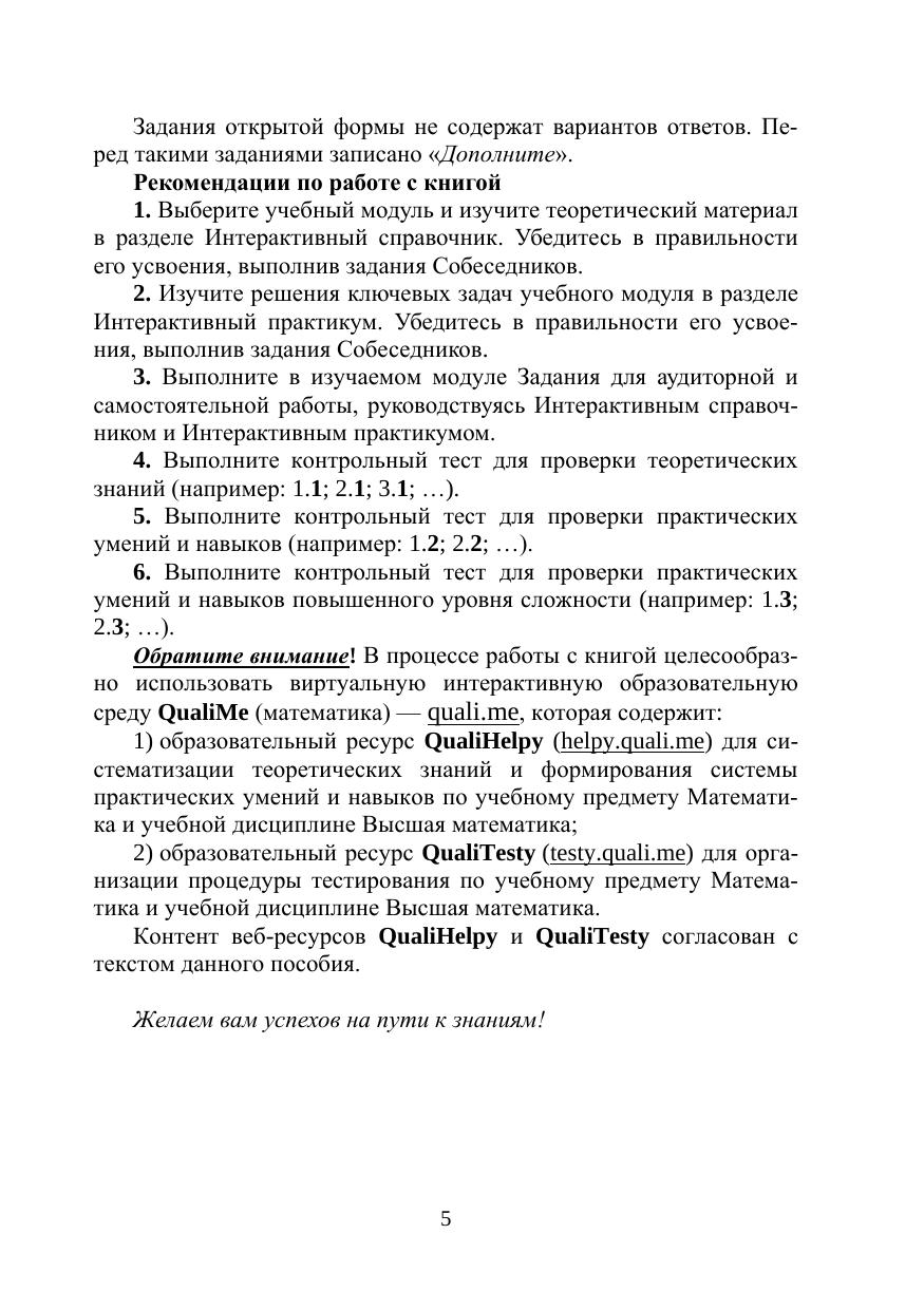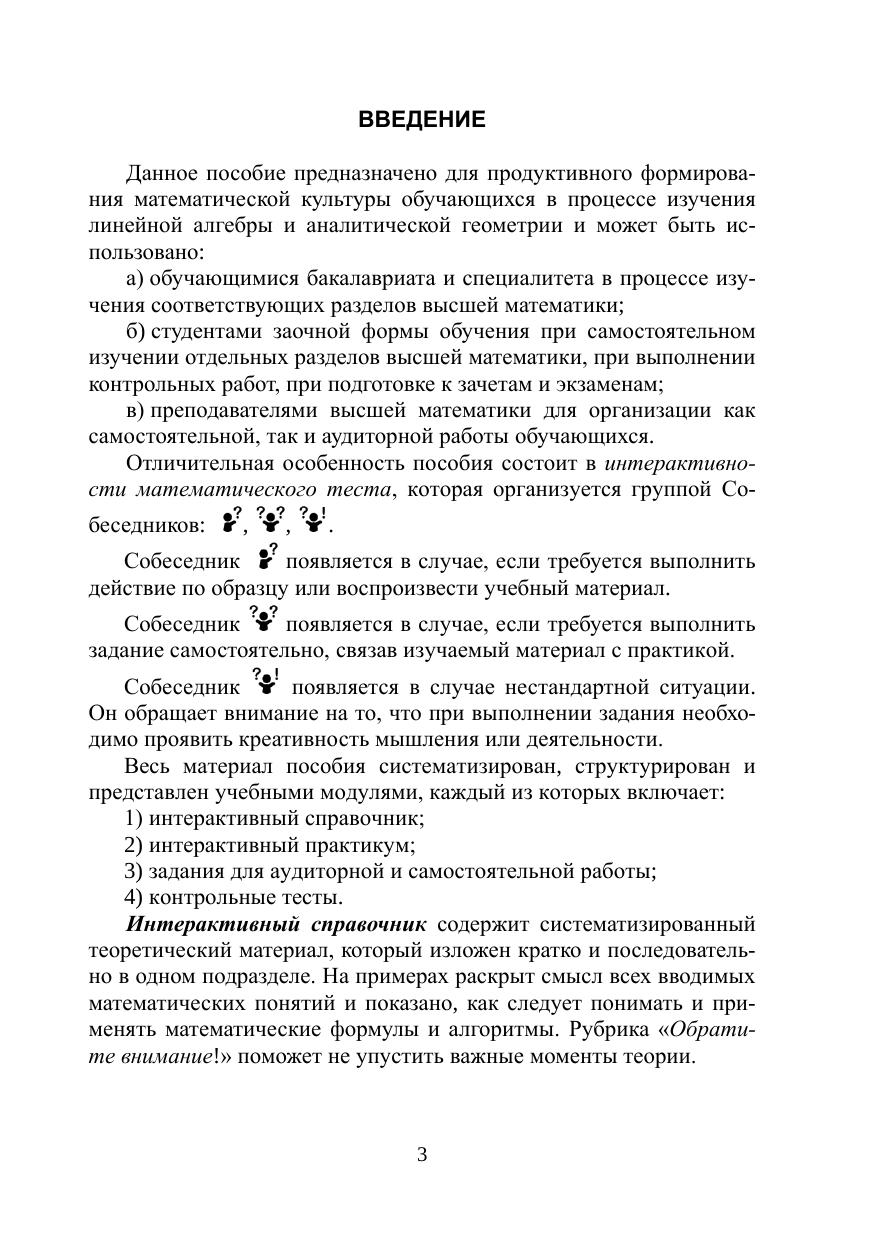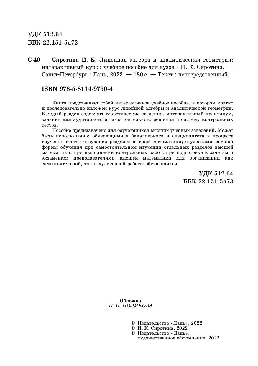 Книга представляет собой интерактивное учебное пособие, в котором кратко и последовательно изложен курс линейной алгебры и аналитической геометрии. Каждый раздел содержит теоретические сведения, интерактивный практикум, задания для аудиторного и самостоятельного решения и систему контрольных тестов. Пособие предназначено для обучающихся высших учебных заведений. Может быть использовано: обучающимися бакалавриата и специалитета в процессе изучения соответствующих разделов высшей математики, студентами заочной формы обучения при самостоятельном изучении отдельных разделов высшей математики, при выполнении контрольных работ, при подготовке к зачетам и экзаменам, преподавателями высшей математики для организации как самостоятельной, так и аудиторной работы обучающихся.