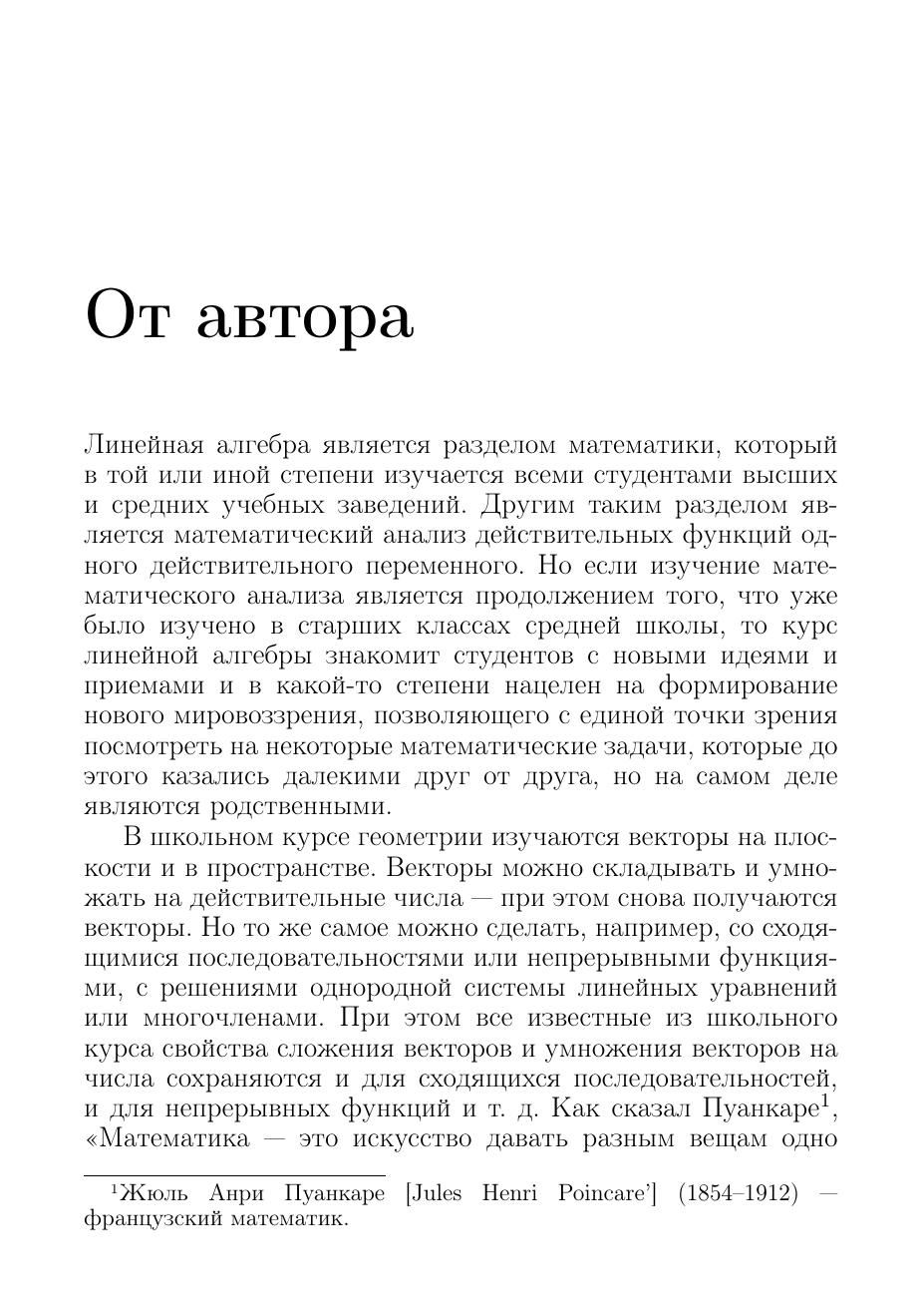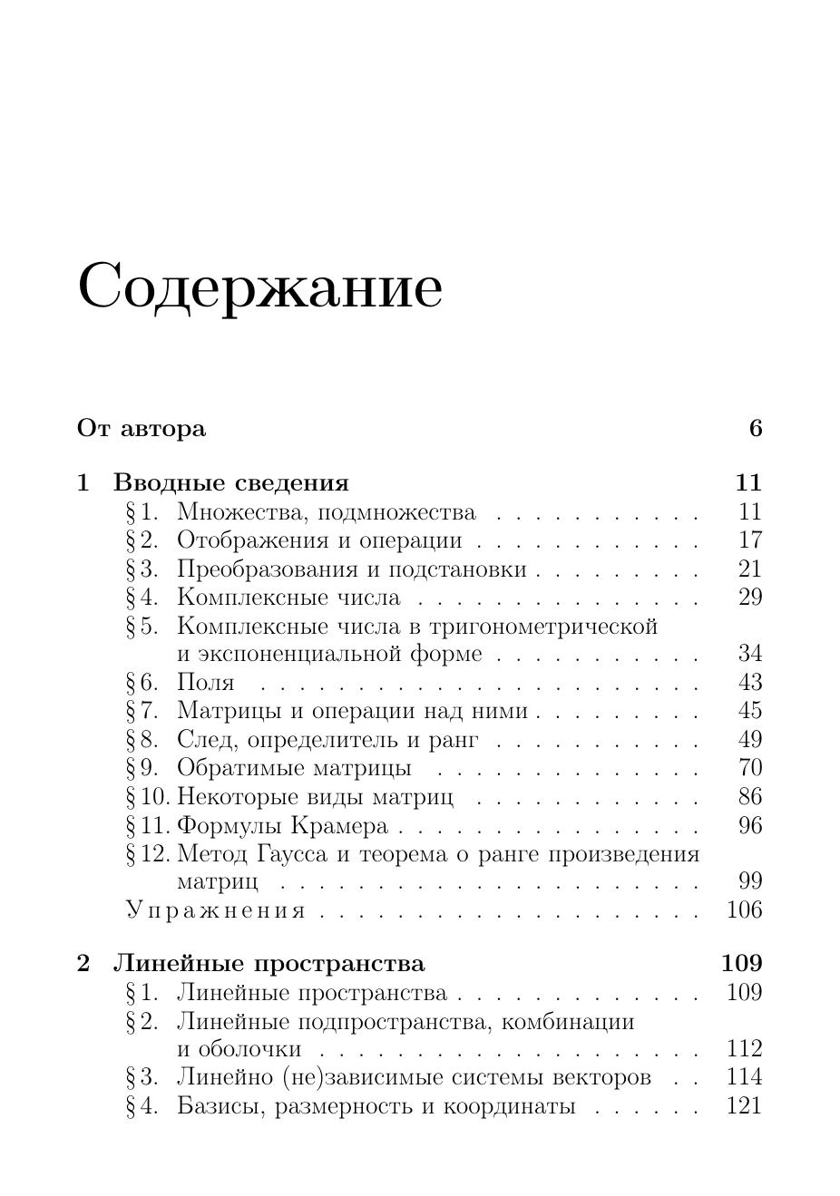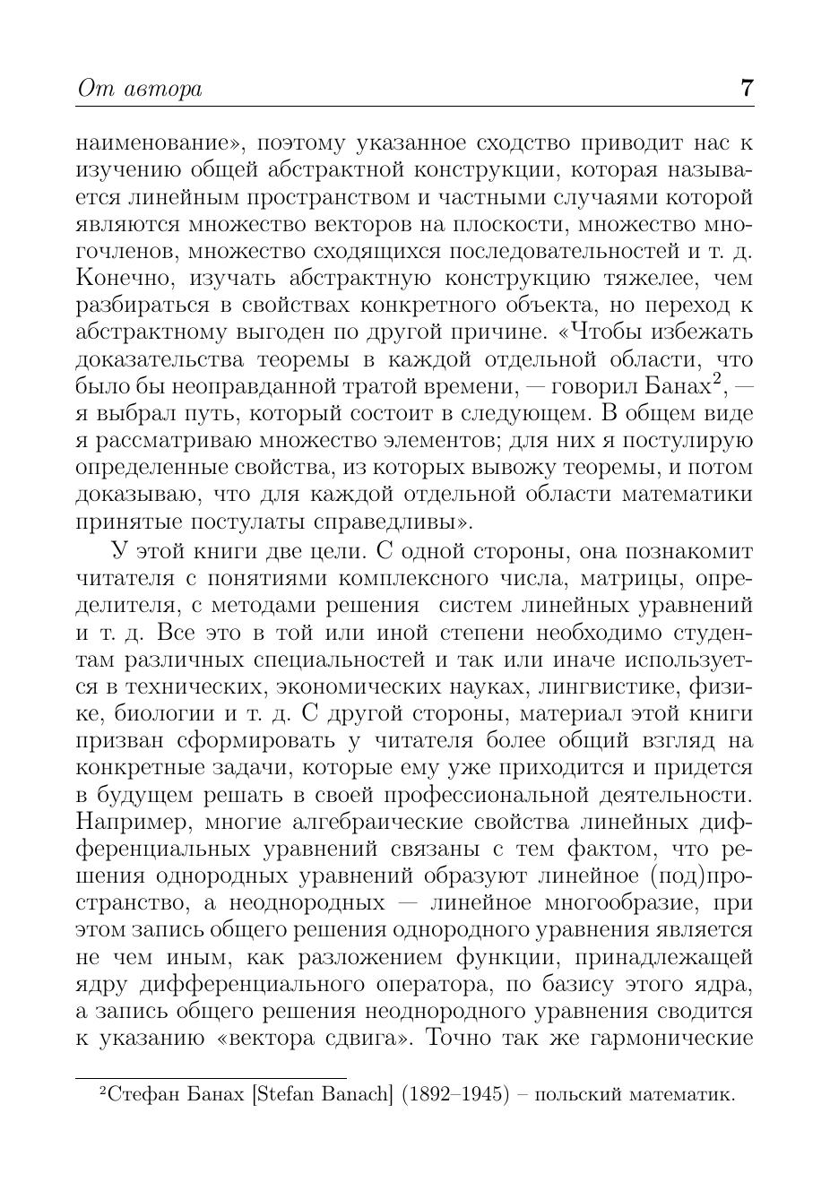 В книге рассматриваются основные понятия, идеи и методы линейной алгебры. Многочисленные примеры, связанные как с конечномерными и конечными линейными пространствами, так и бесконечномерными, демонстрируют их применение в других разделах математики: математическом анализе, теории обыкновенных дифференциальных уравнений, теории рядов и т. д. Часть примеров относится к линейным пространствам над конечными полями. Материал книги может использоваться в процессе обучения целиком или частично.