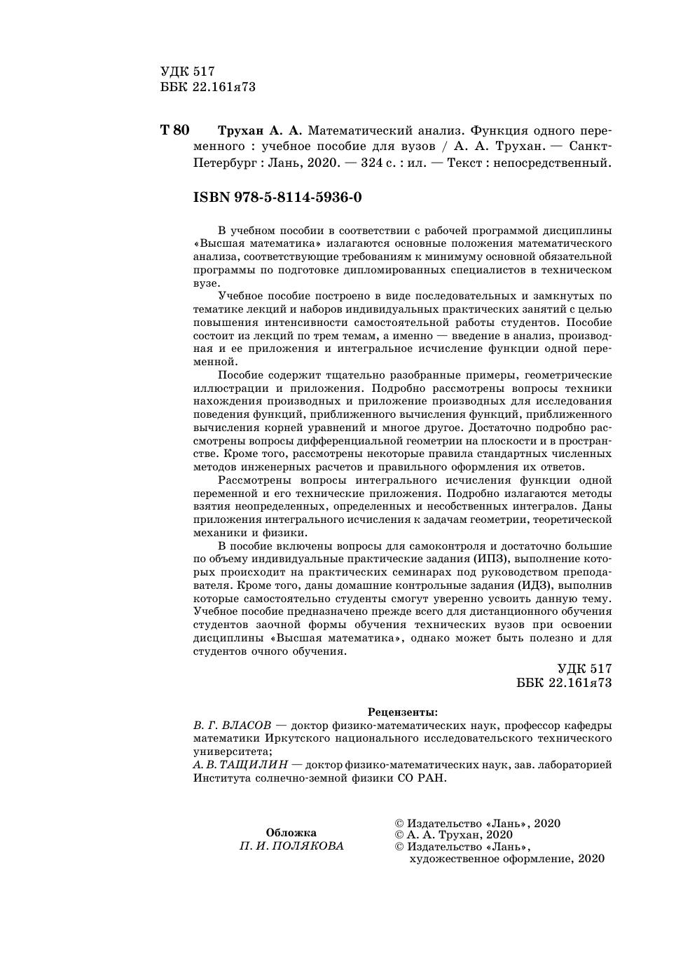 Пособие содержит тщательно разобранные примеры, геометрические иллюстрации и приложения. Подробно рассмотрены вопросы техники нахождения производных и приложение производных для исследования поведения функций, приближенного вычисления функций, приближенного вычисления корней уравнений и многое другое. Достаточно подробно рассмотрены вопросы дифференциальной геометрии на плоскости и в пространстве. Кроме того, рассмотрены некоторые правила стандартных численных методов инженерных расчетов и правильного оформления их ответов.