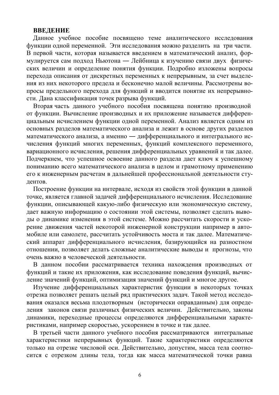 Учебное пособие построено в виде последовательных и замкнутых по тематике лекций и наборов индивидуальных практических занятий с целью повышения интенсивности самостоятельной работы студентов. Пособие состоит из лекций по трем темам, а именно — введение в анализ, производная и ее приложения и интегральное исчисление функции одной переменной.