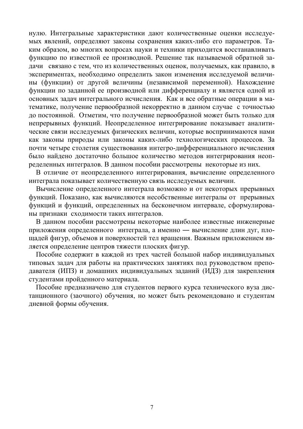 Рассмотрены вопросы интегрального исчисления функции одной переменной и его технические приложения. Подробно излагаются методы взятия неопределенных, определенных и несобственных интегралов. Даны приложения интегрального исчисления к задачам геометрии, теоретической механики и физики.