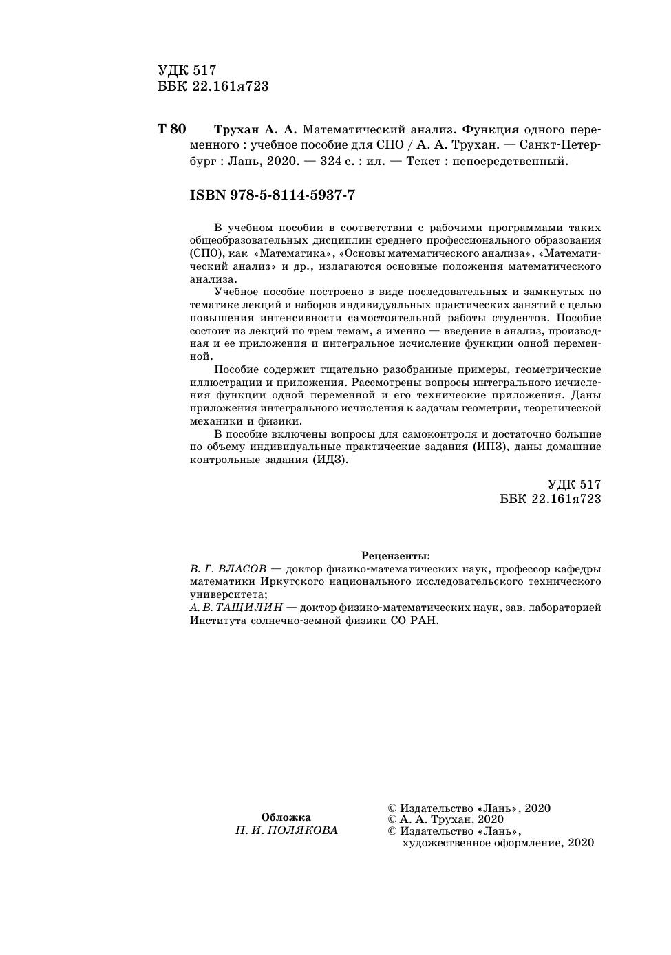 В учебном пособии в соответствии с рабочими программами таких общеобразовательных дисциплин среднего профессионального образования (СПО), как «Математика», «Основы математического анализа», «Математический анализ» и др. излагаются основные положения математического анализа.
