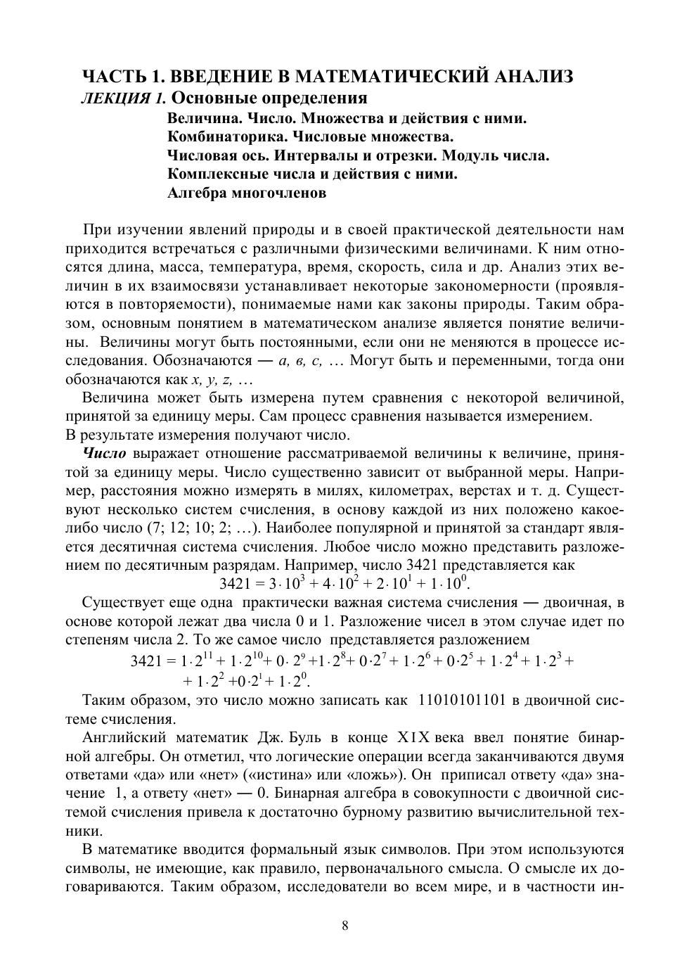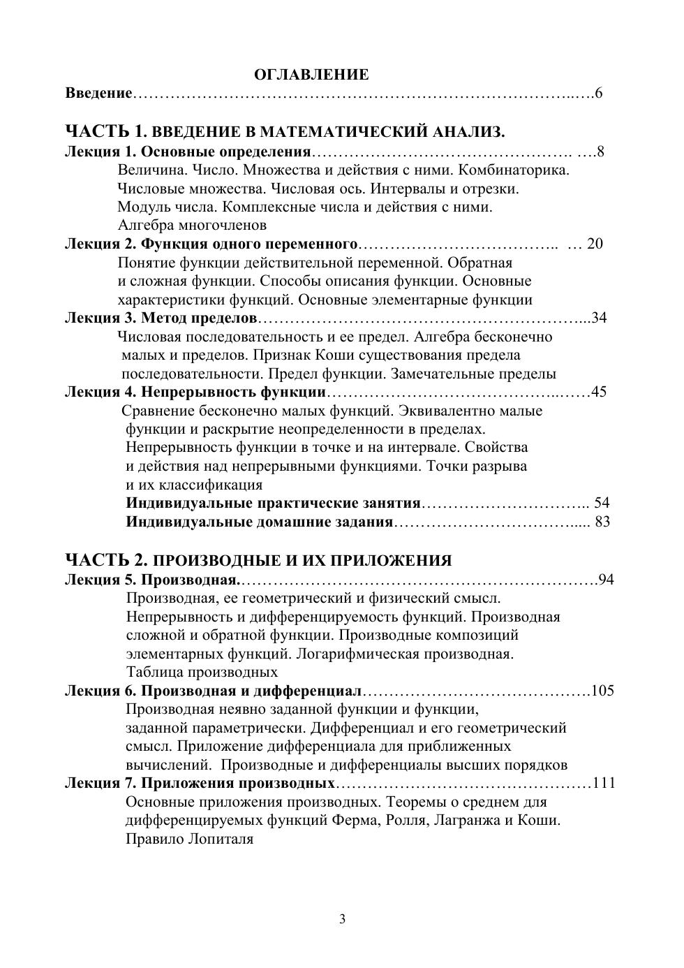 Учебное пособие построено в виде последовательных и замкнутых по тематике лекций и наборов индивидуальных практических занятий с целью повышения интенсивности самостоятельной работы студентов. Пособие состоит из лекций по трем темам, а именно, введение в анализ, производная и ее приложения и интегральное исчисление функции одной переменной.
