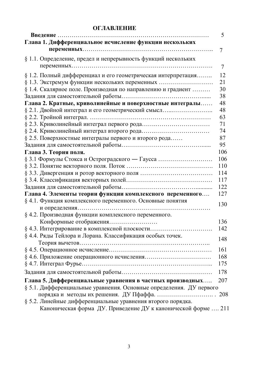 В пособии излагаются вопросы теории функции нескольких переменных, ее дифференциального и интегрального исчисления и основы теории поля. Подробно рассмотрены кратные, криволинейные и поверхностные интегралы. Дана теория функции комплексного переменного, которая базируется на математическом аппарате функции двух переменных. Кроме того, рассмотрены методы решения линейных дифференциальных уравнений в частных производных, часто встречающихся в инженерной практике.