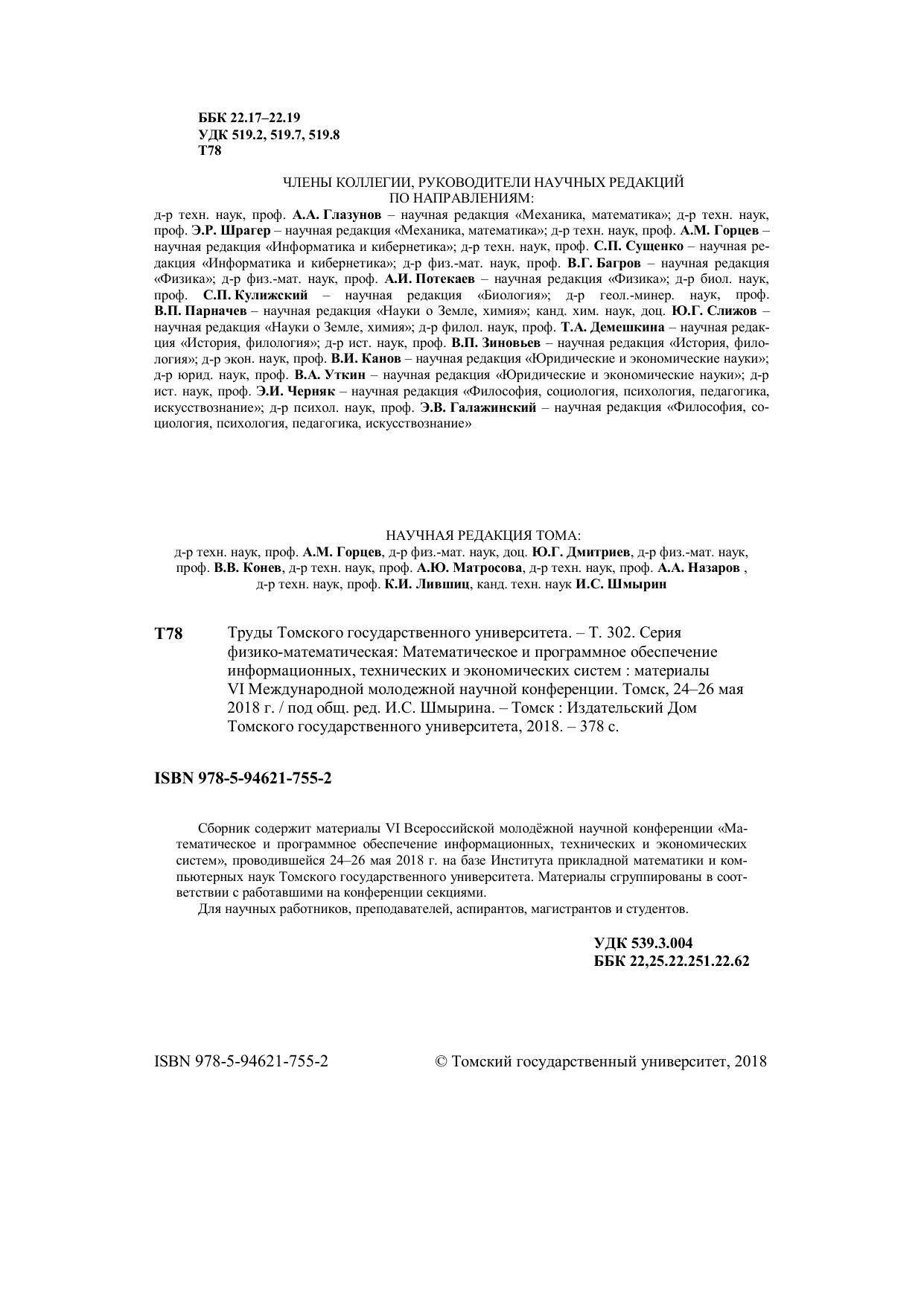 Сборник содержит материалы VI Всероссийской молодёжной научной конференции «Математическое и программное обеспечение информационных, технических и экономических систем», проводившейся 24–26 мая 2018 г. на базе Института прикладной математики и компьютерных наук Томского государственного университета. Материалы сгруппированы в соответствии с работавшими на конференции секциями. Для научных работников, преподавателей, аспирантов, магистрантов и студентов.