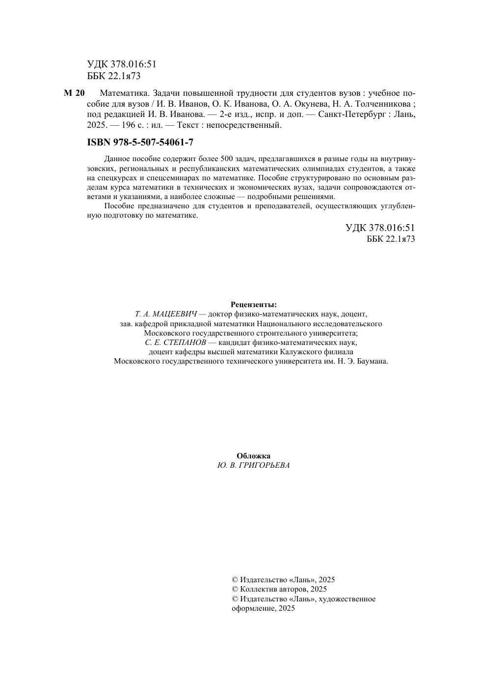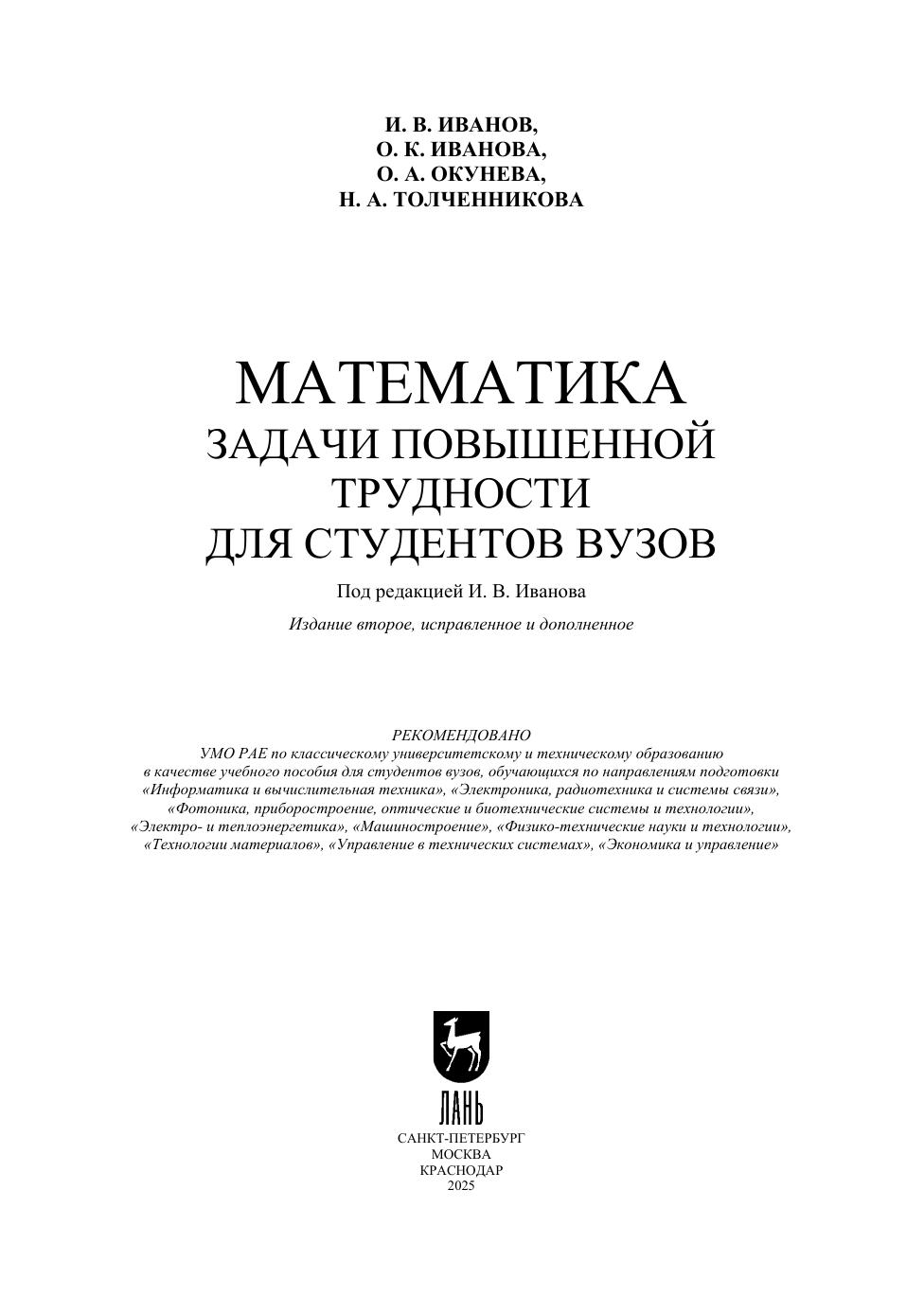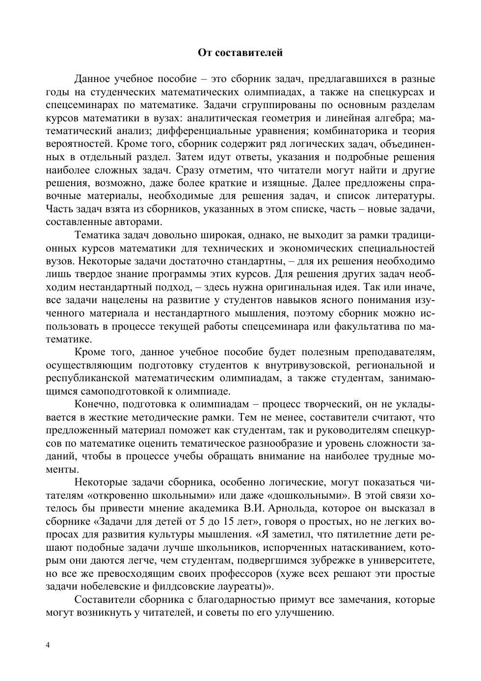 Данное пособие содержит более 500 задач, предлагавшихся в разные годы на внутривузовских, региональных и республиканских математических олимпиадах сту-дентов, а также на спецкурсах и спецсеминарах по математике. Пособие структуриро-вано по основным разделам курса математики в технических и экономических вузах, задачи сопровождаются ответами и указаниями, а наиболее сложные — подробными решениями. Пособие предназначено для студентов и преподавателей, осуществляющих углубленную подготовку по математике.