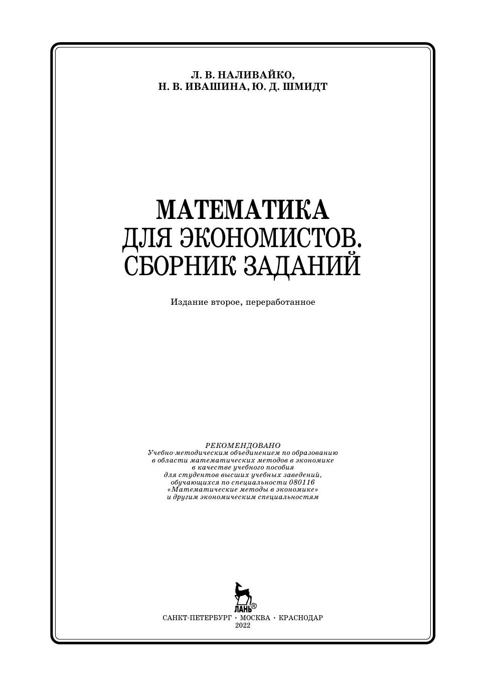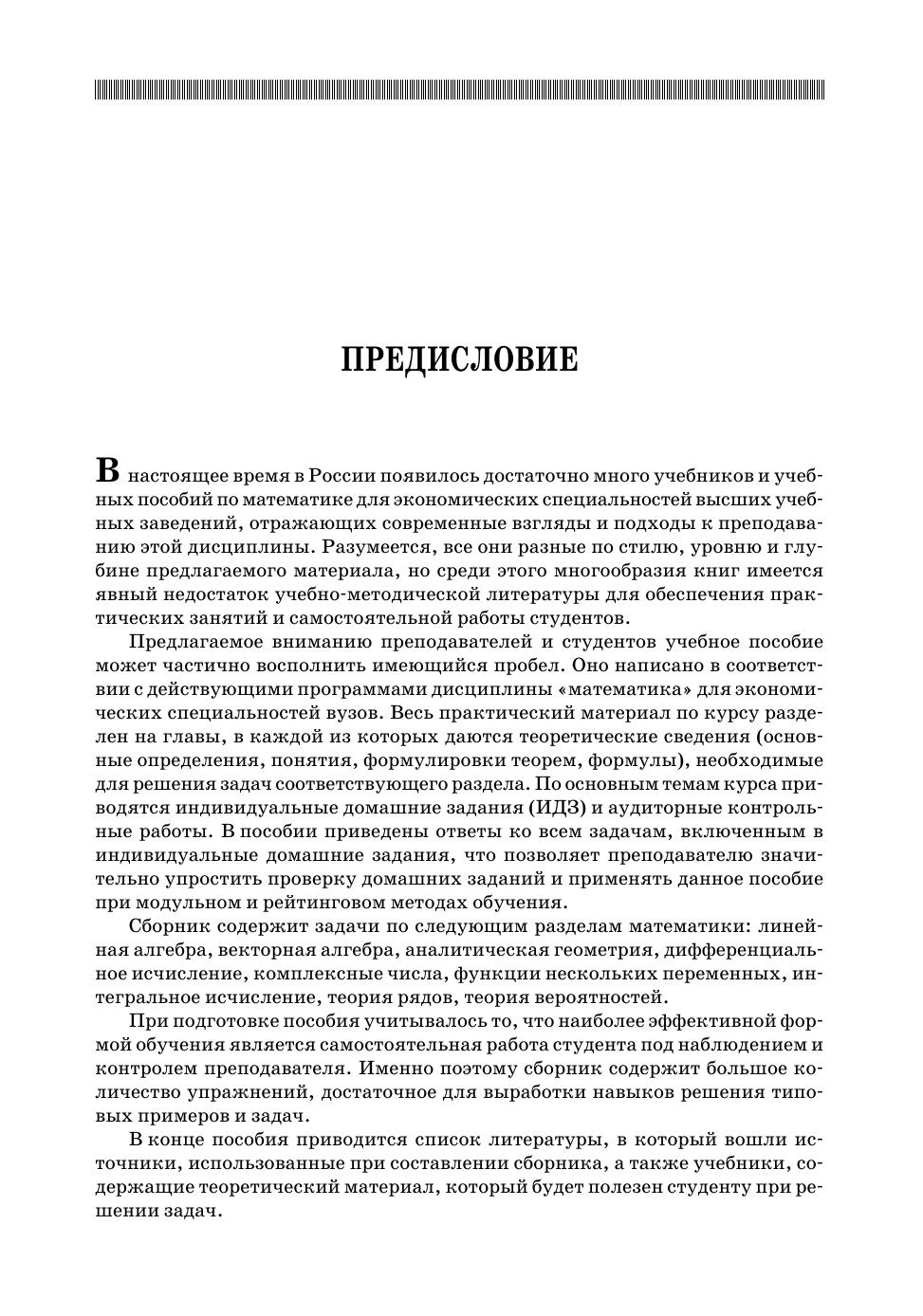 Учебное пособие предназначено для организации самостоятельной работы студентов экономических специальностей, а также может быть использовано преподавателями при подготовке и проведении практических занятий, контрольных работ, зачетов и экзаменов. Сборник содержит задачи по следующим разделам дисциплины «математика»: линейная алгебра, аналитическая геометрия, дифференциальное исчисление, комплексные числа, функции нескольких переменных, интегральное исчисление, теория рядов, теория вероятностей. Каждый раздел сборника содержит индивидуальные домашние задания и примеры для проведения аудиторных контрольных работ.